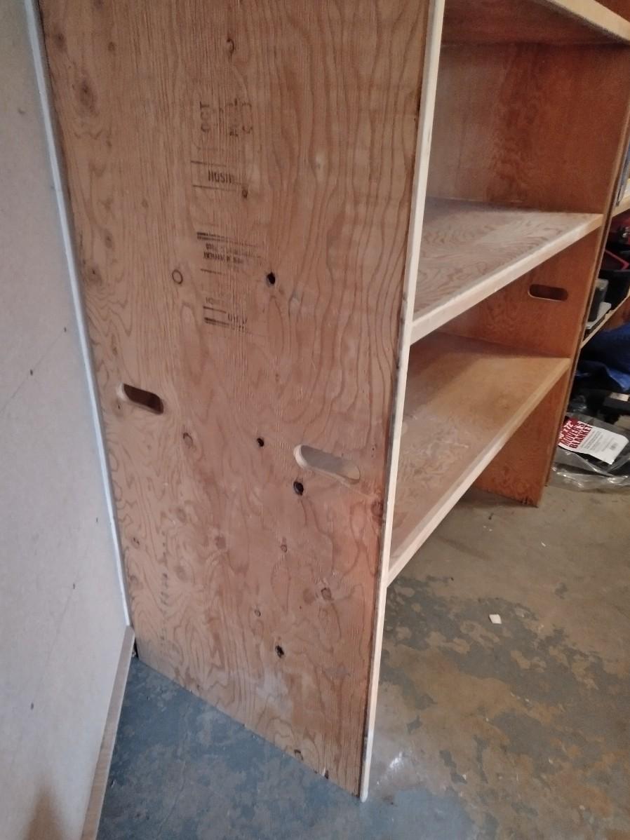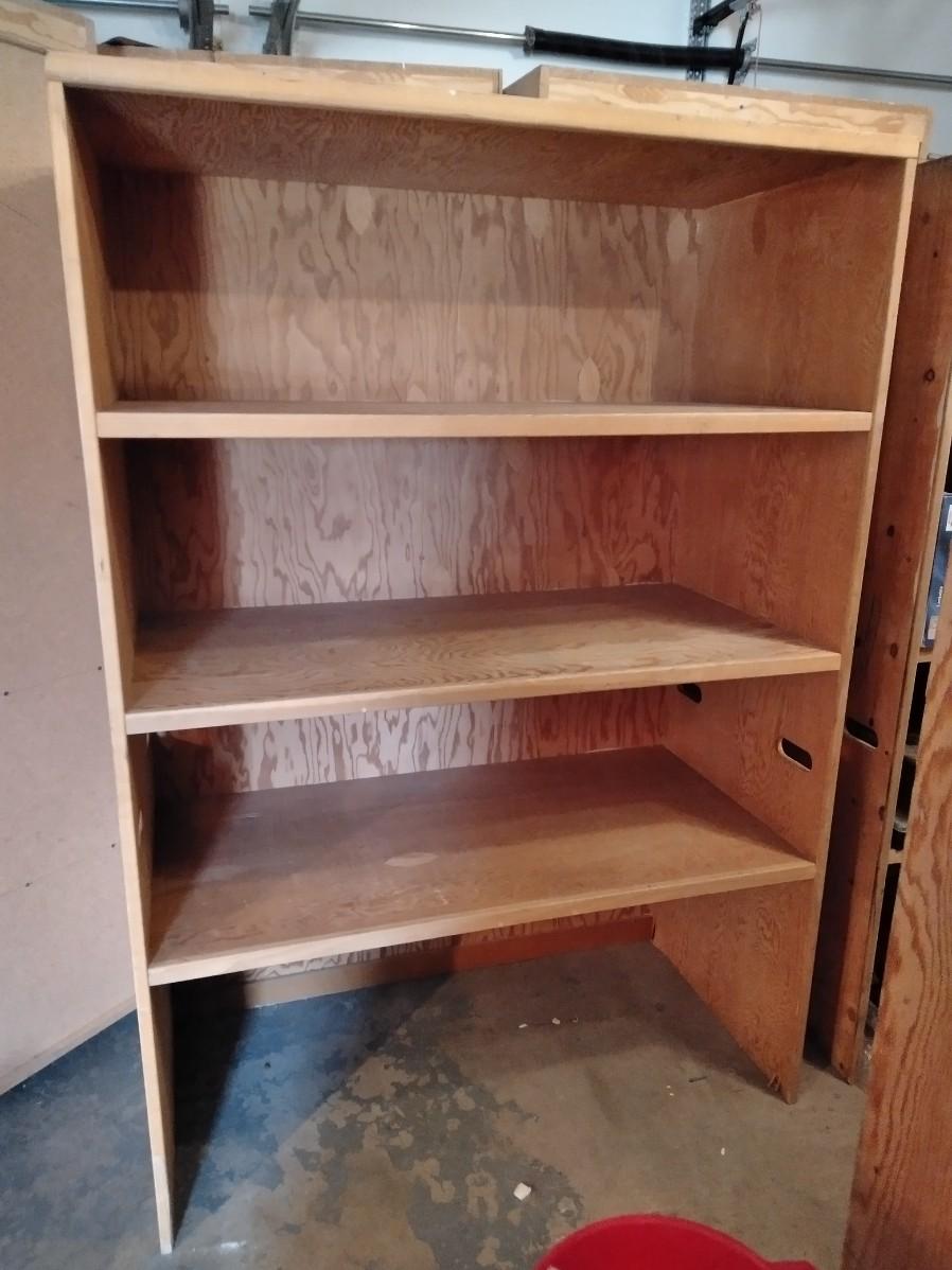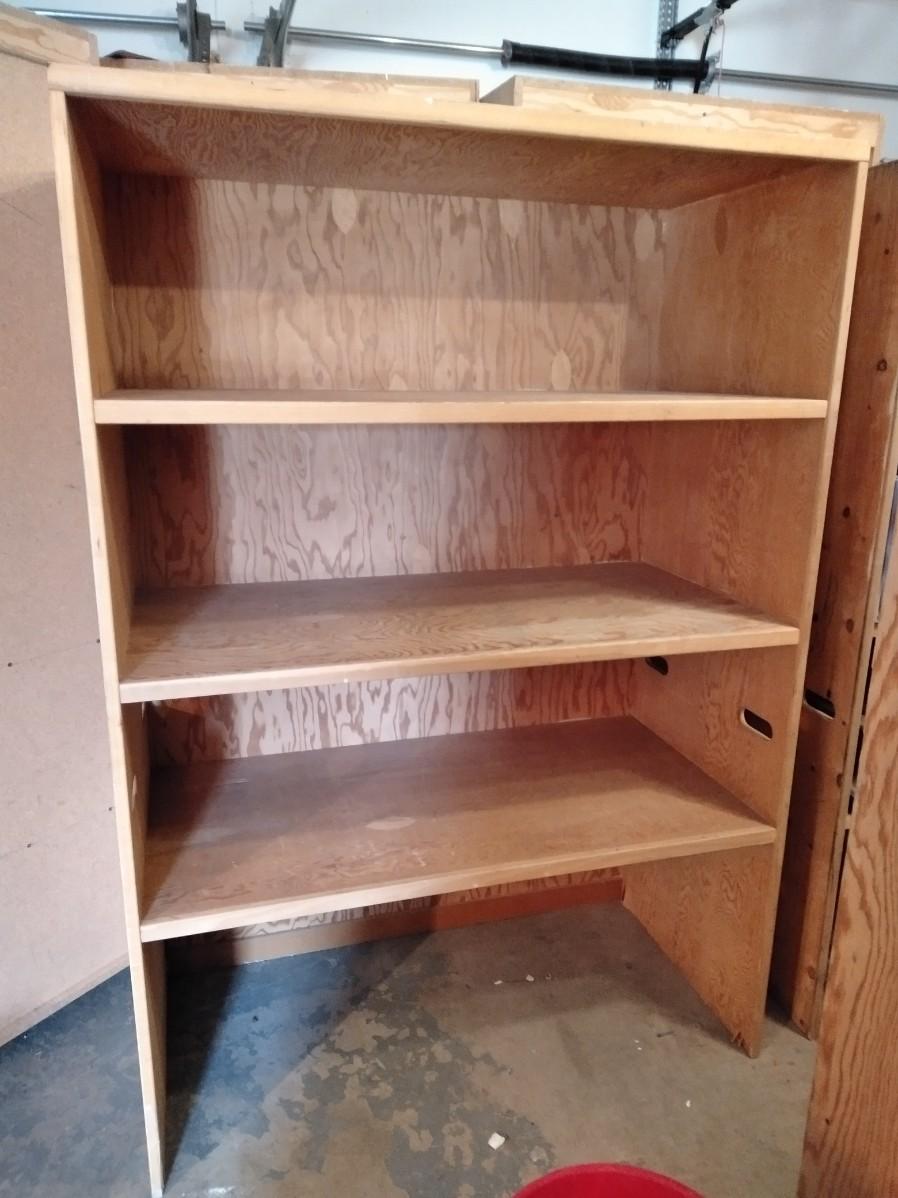 LARGE WOODEN SHELVING UNIT WITH HANDLES ON THE ENDS. 70" X 48" X 24"