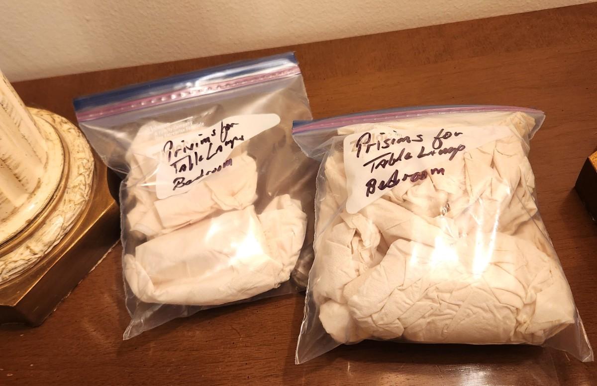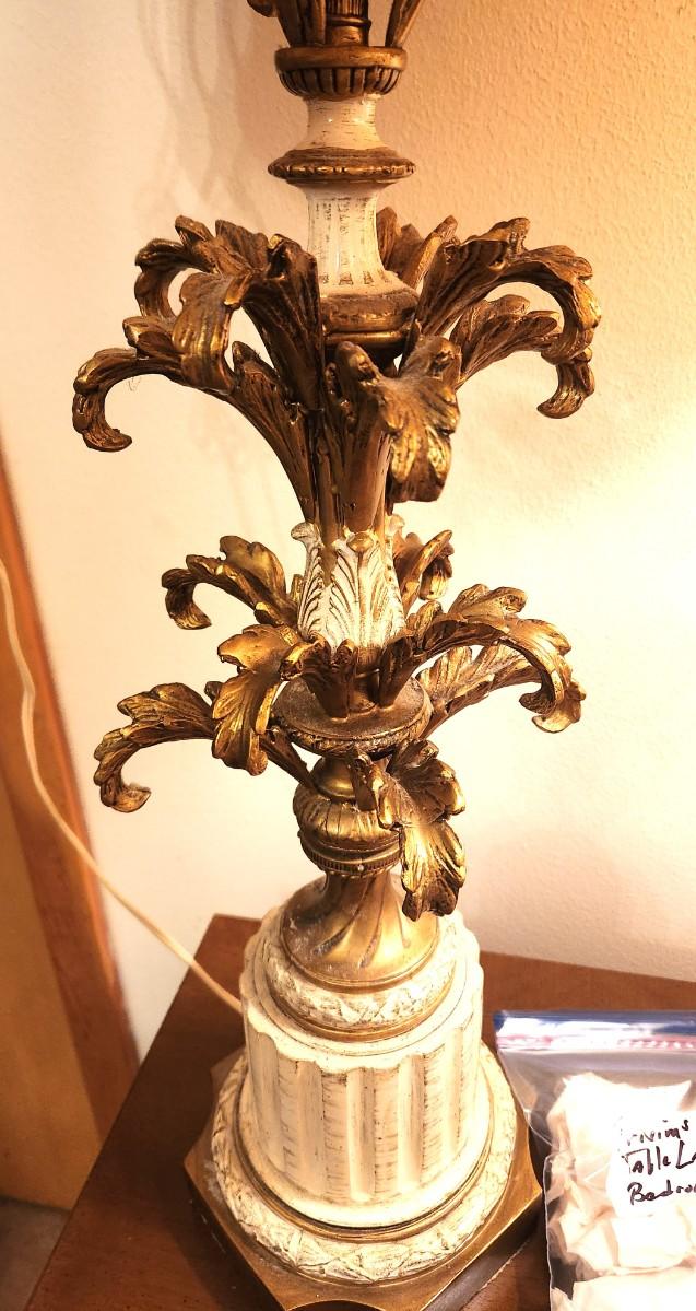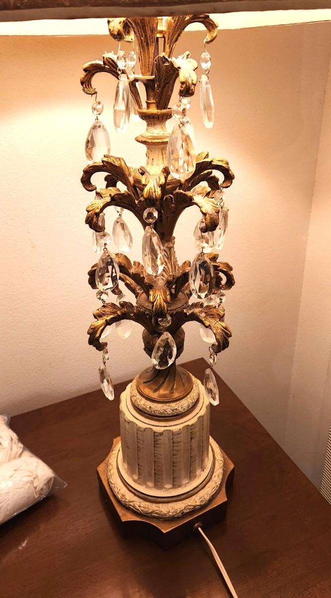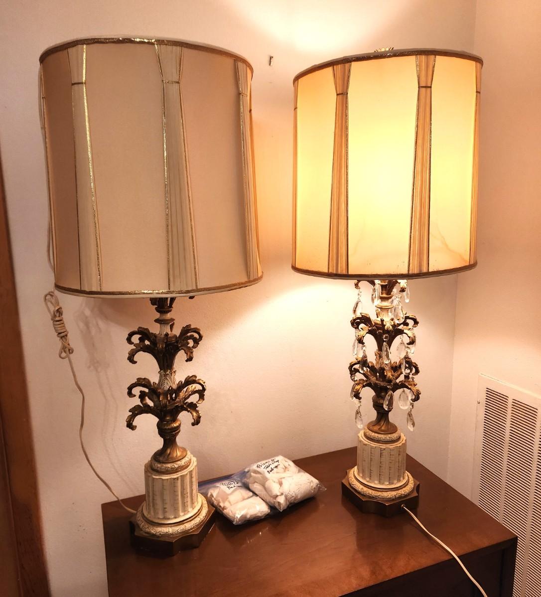 Pair of vintage Table lamps with removeable hanging crystal prisms - both in working condition. Each about 40" tall counting finial. Note: 1 shade has some age-related stainage. There are roughly 20 crystals per lamp and there are some extras included.