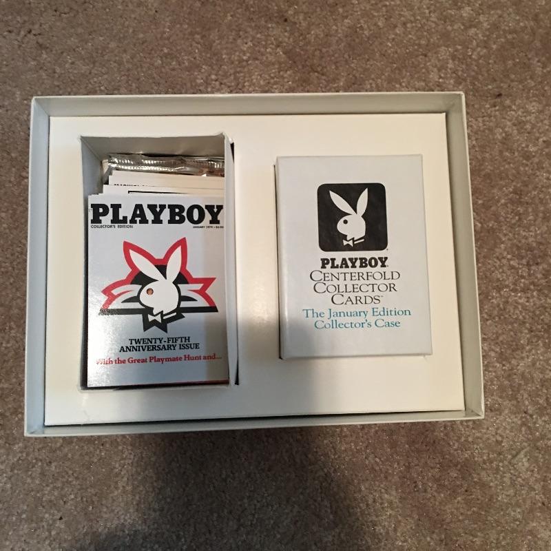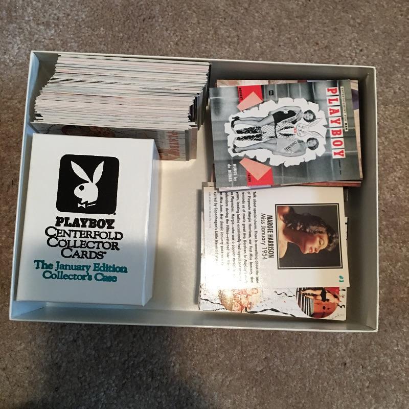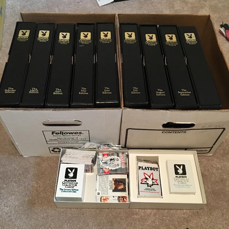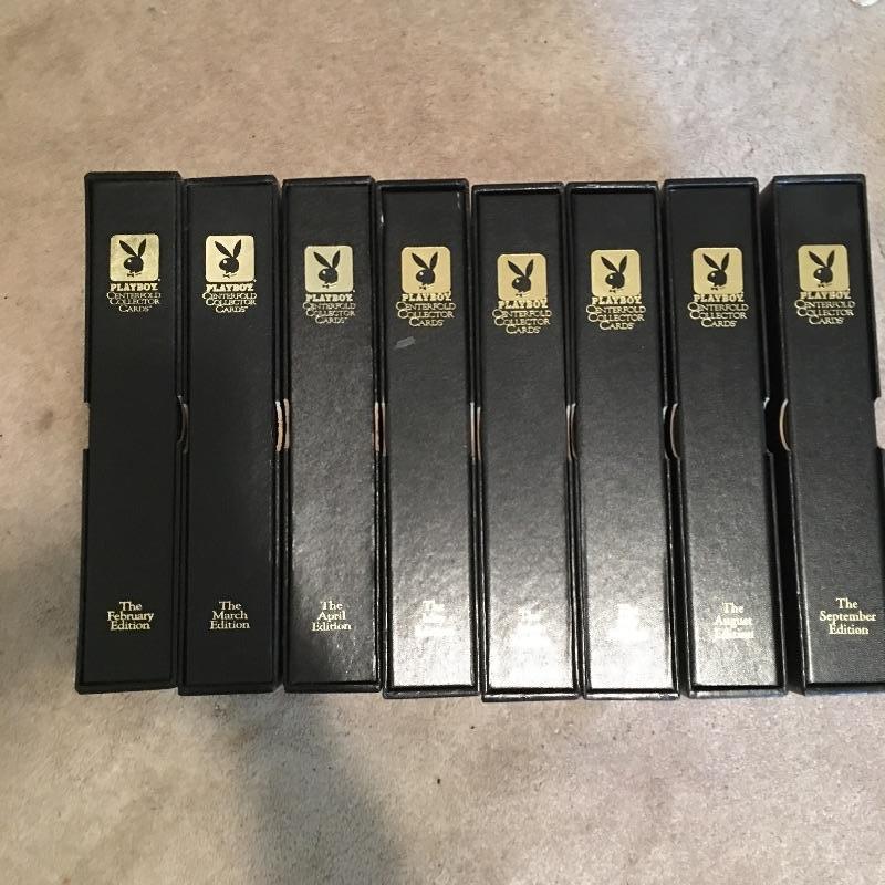 Playboy centerfold collector cards. Lot includes February through September binders. All binders have more than 100 cards in each binder. Also includes January collection in a box and no binder.
