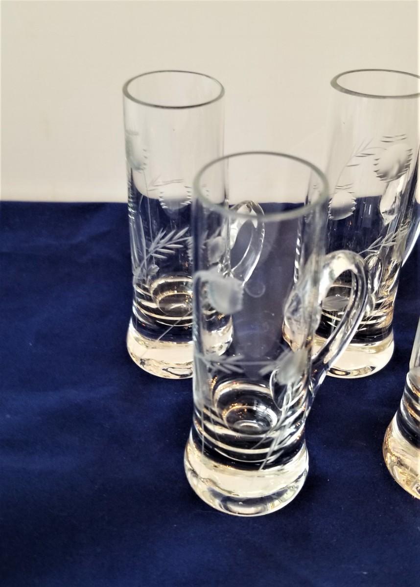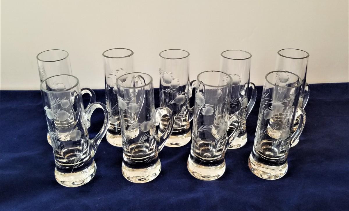 9 Acid-etched crystal Liquor glasses. Each is 4" tall - good condition.