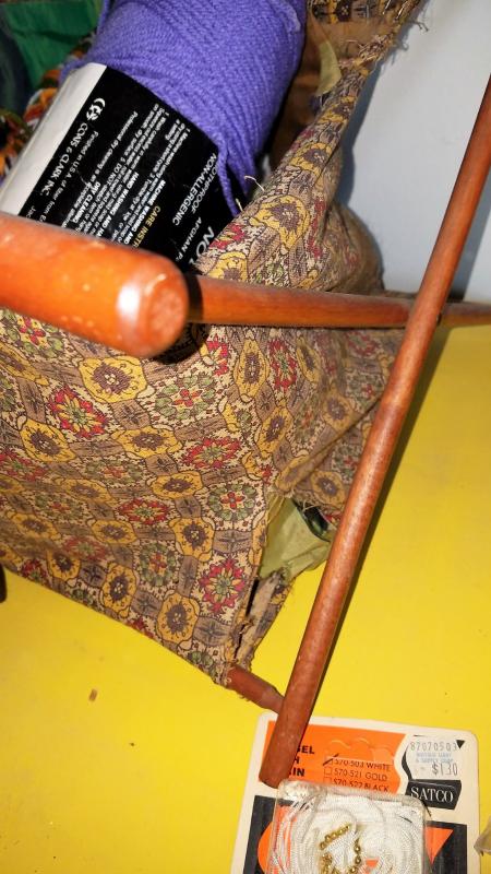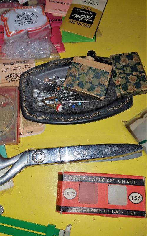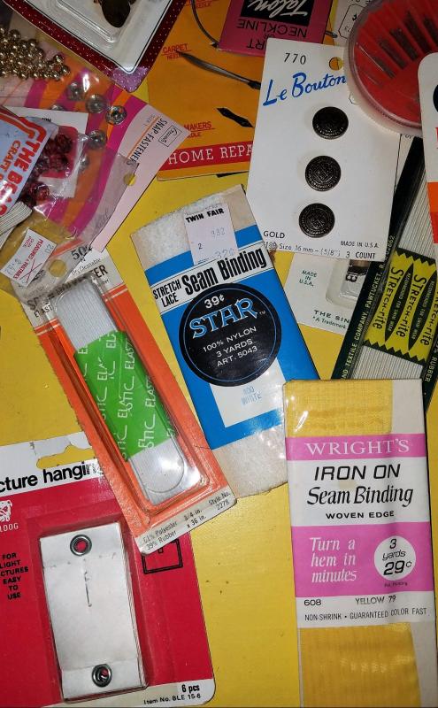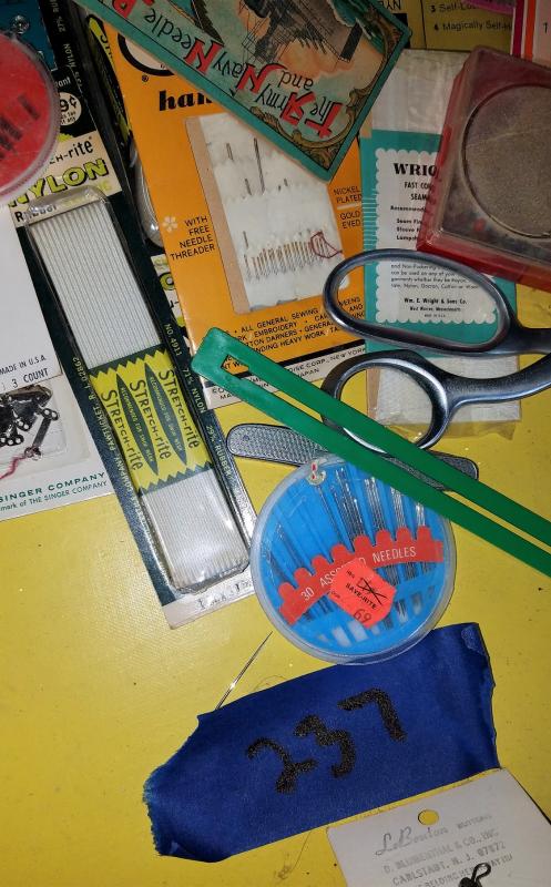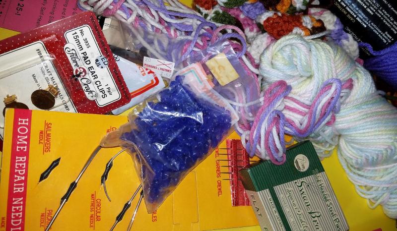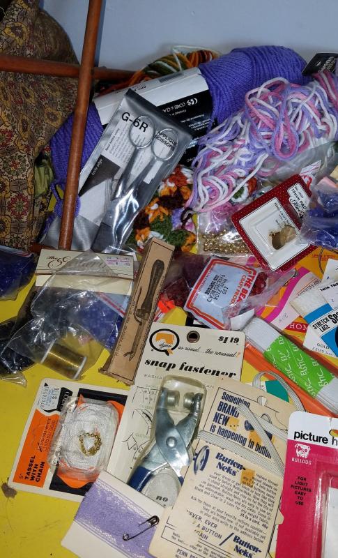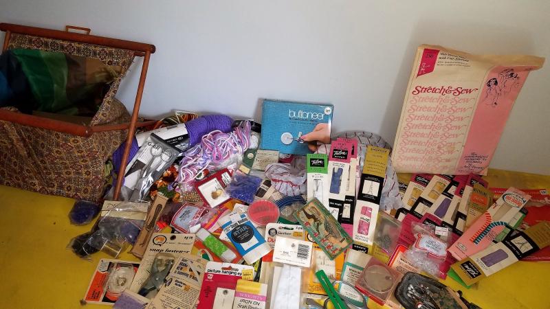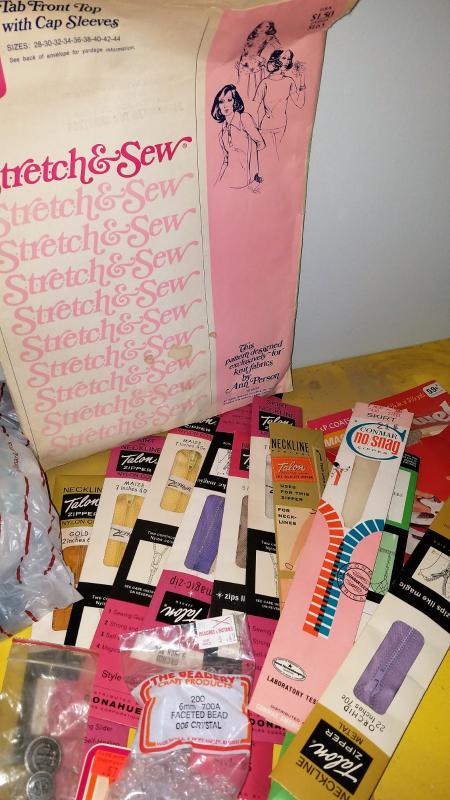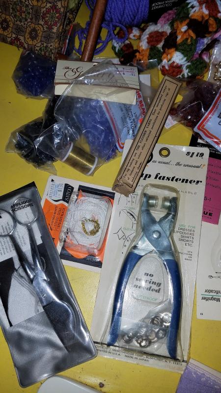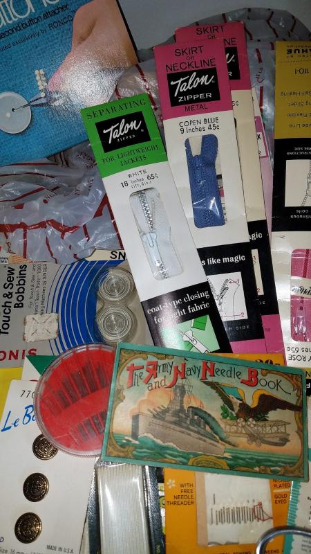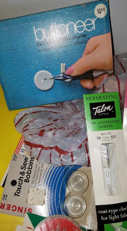 Zippers, needles, and yarn, knitting needles, a butttoner and many many more.