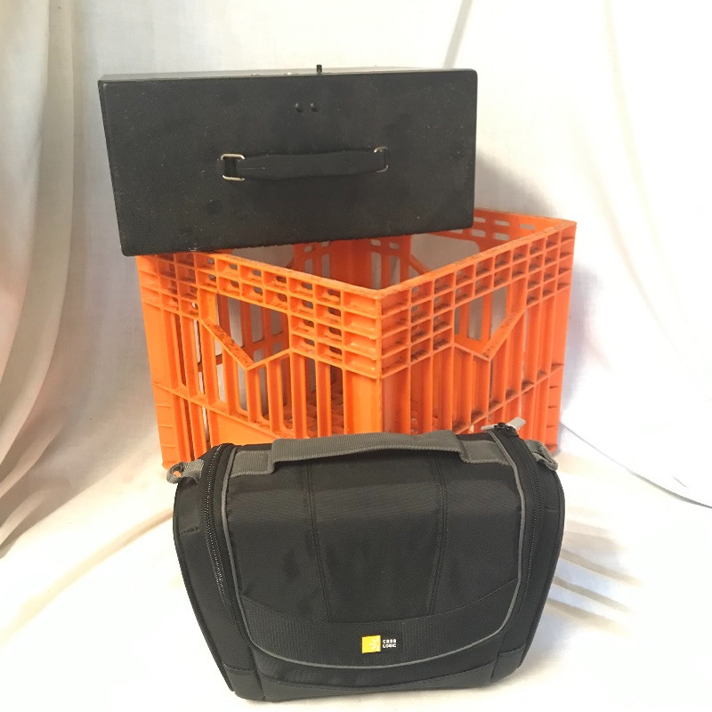 Organize and tote your winnings! Heavy duty orange milk crate with a Brinks portable lock box measuring 13.5” x 6” x 10.5”. Key is not included. Lastly a padded Case Logic bag with a padded insert that is adjustable via Velcro, see images.