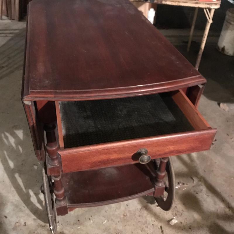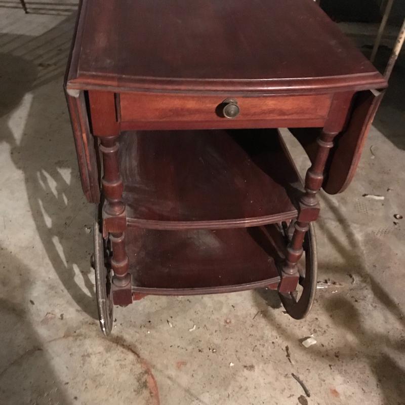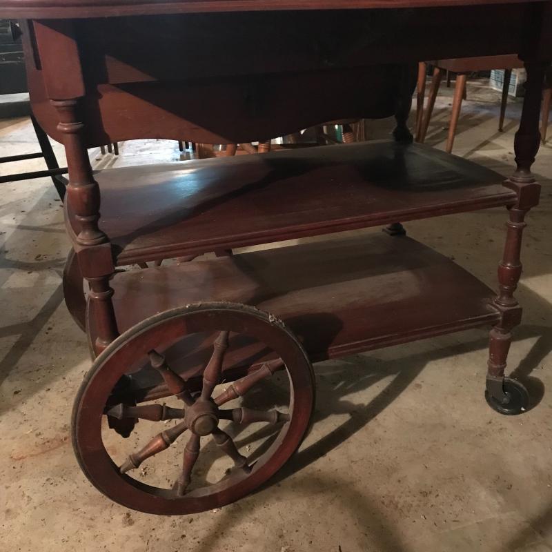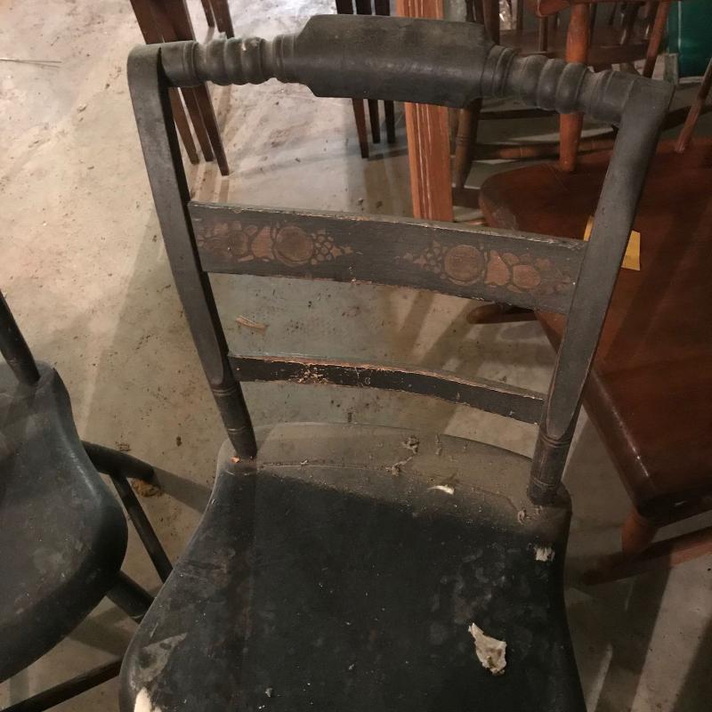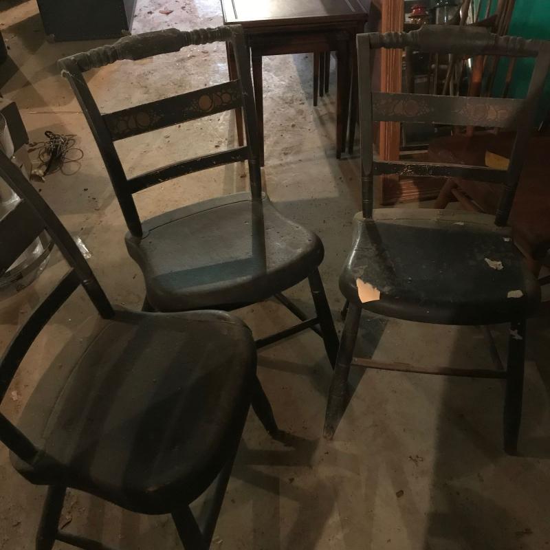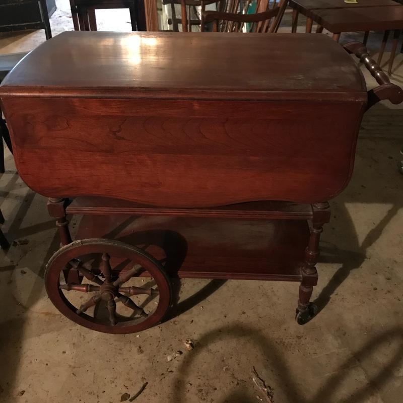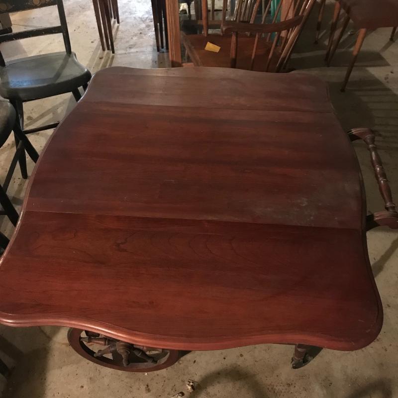 Pennsylvania House Tea cart with expandable sides. One wheel needs some work. Measures 34” x 19” x 30” with sides down and 34” x 39” x 30” with sides expanded. Lot also includes three antique wooden chairs with painted design. Need some love as they’ve been kept in basement. No shipping. Local pick up only.