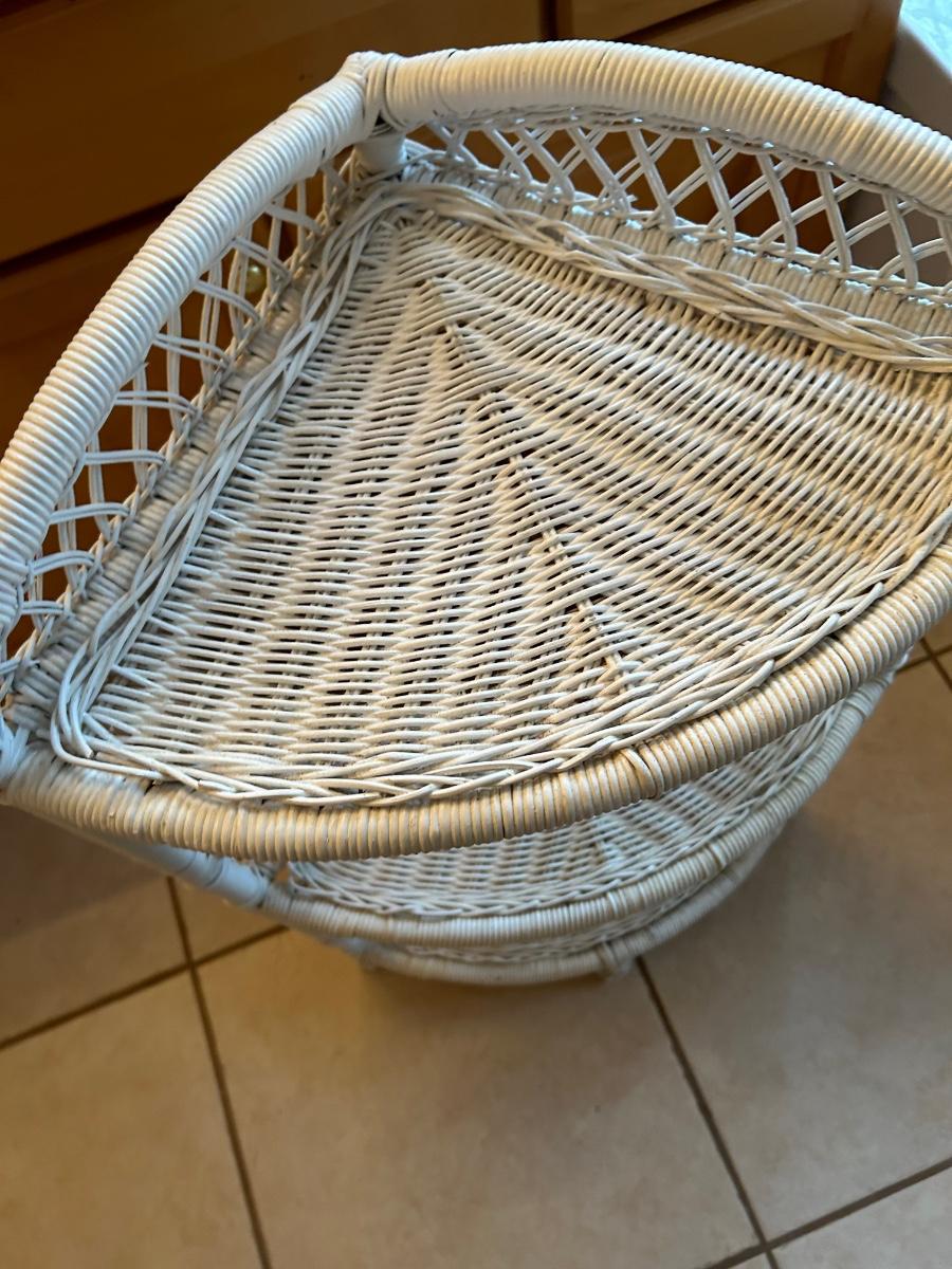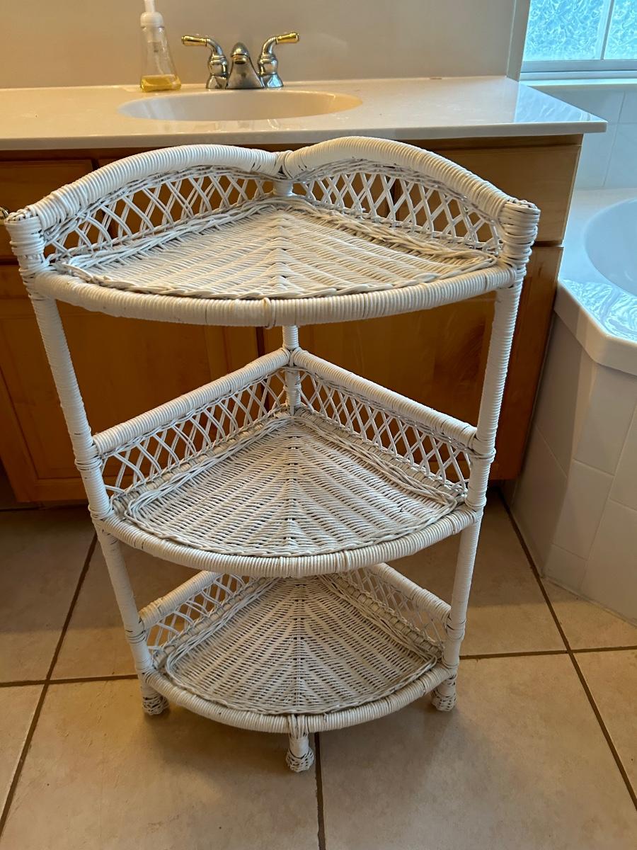 White whicker corner shelf, has 3 shelves, 32" x 14"