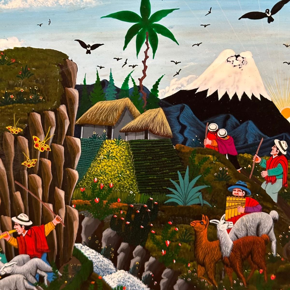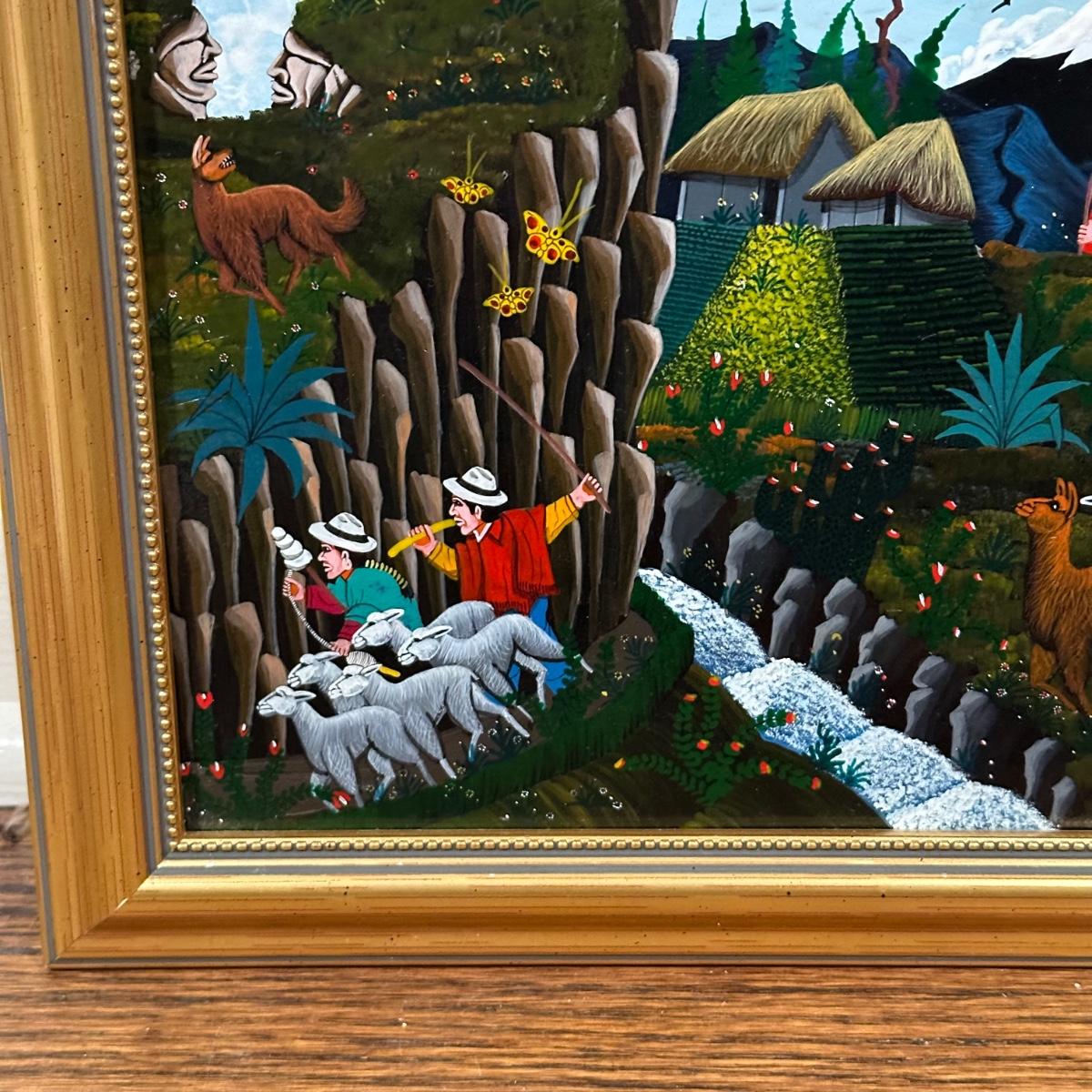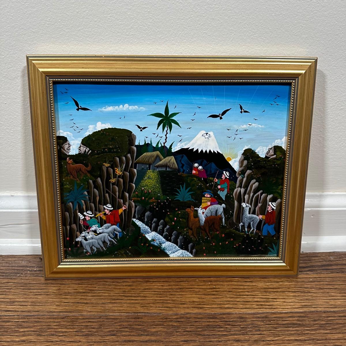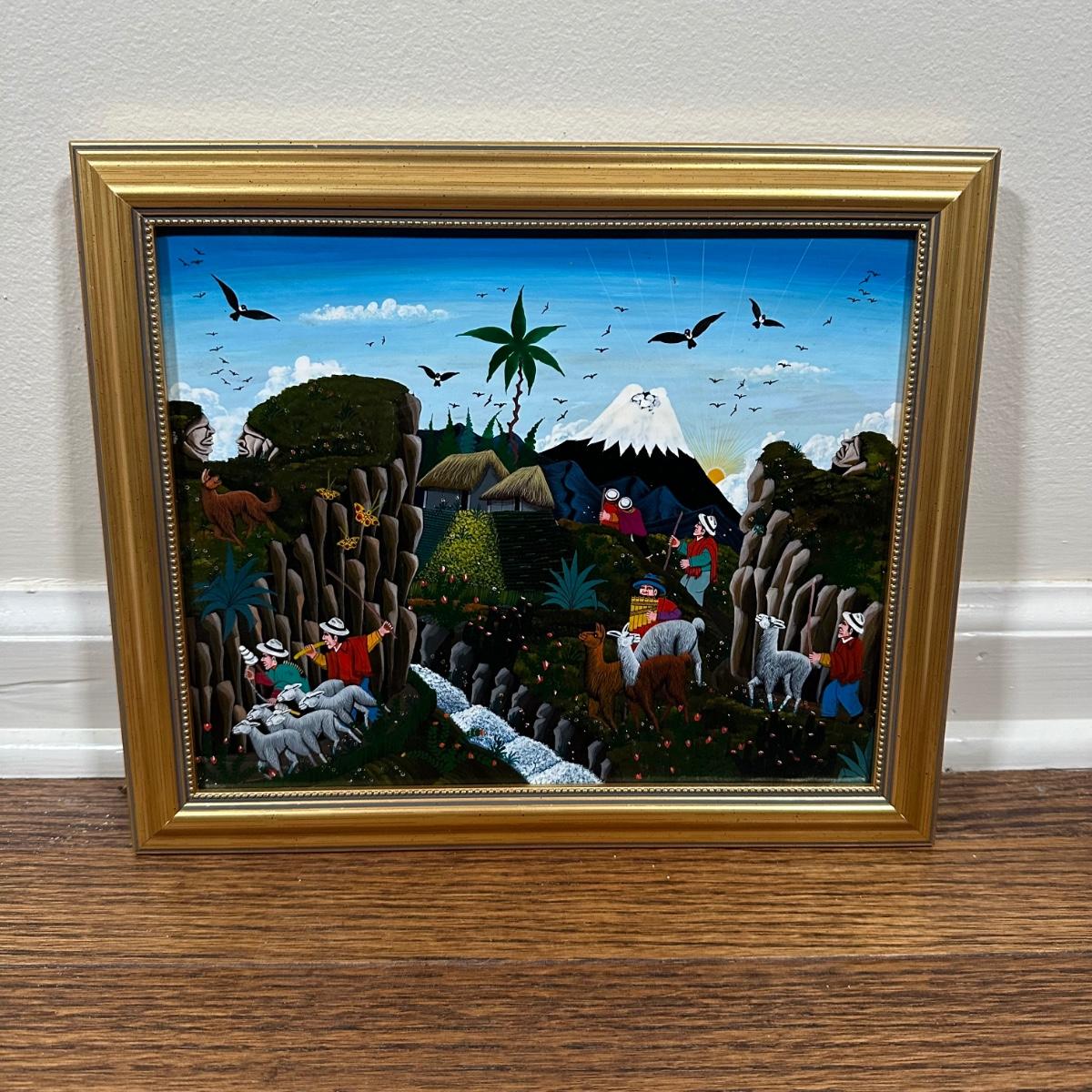 LOT 237X: Framed Ecuadorian Folk Art Painting on Sheepskin by Margarita Ushco