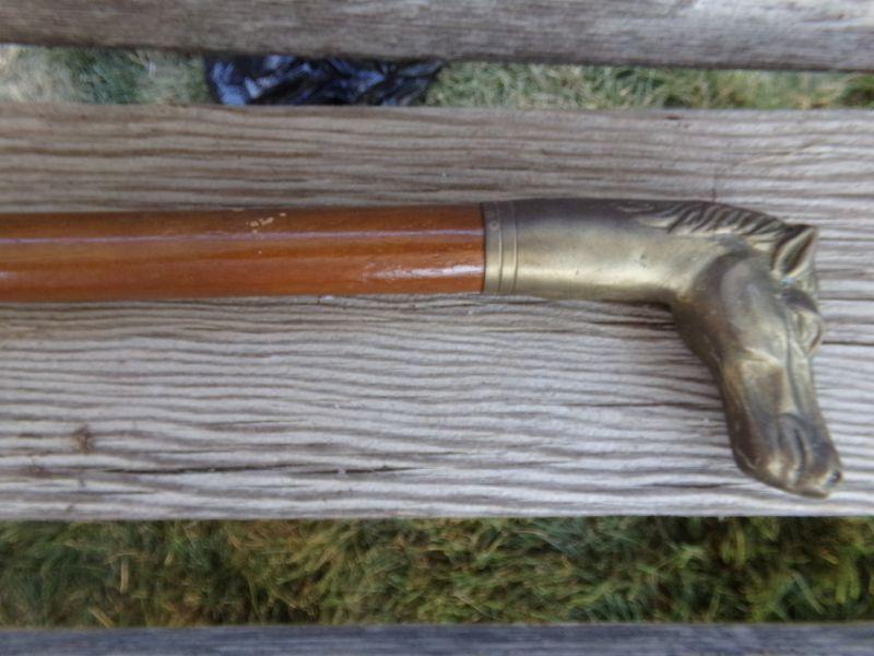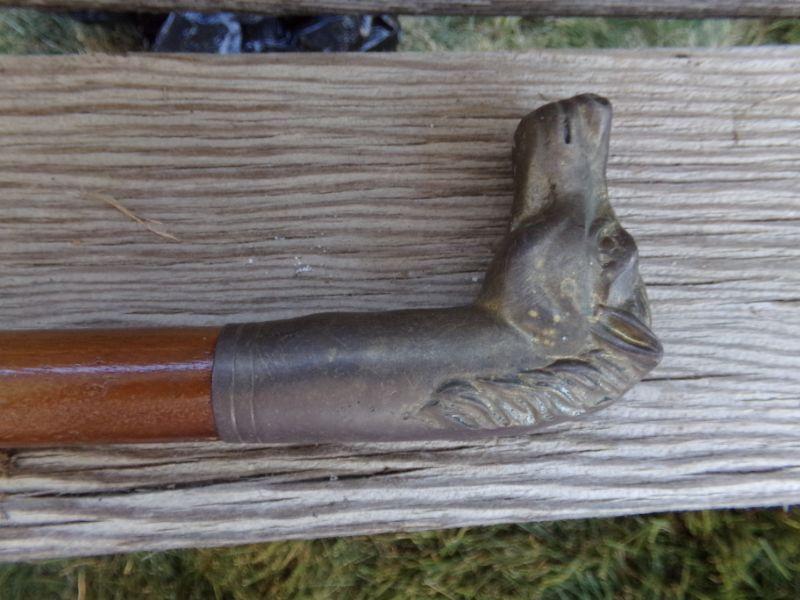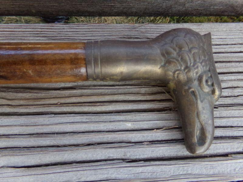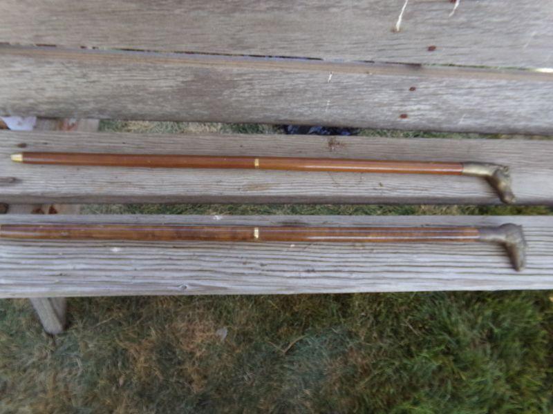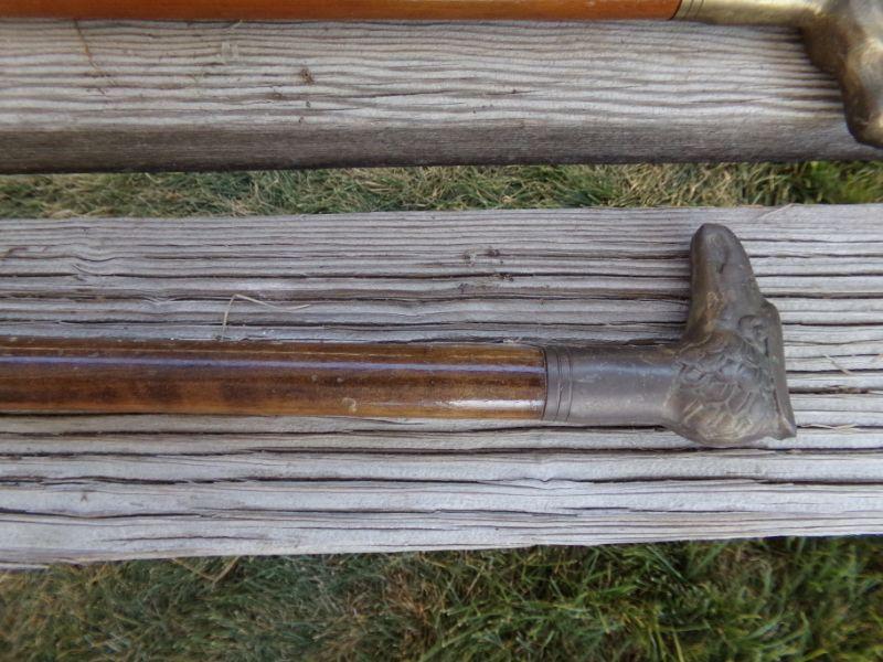 BRASS HORSE AND EAGLE HEADS REST ON TOP OF WOODEN CANES THAT ALSO HAVE BRASS TIPS