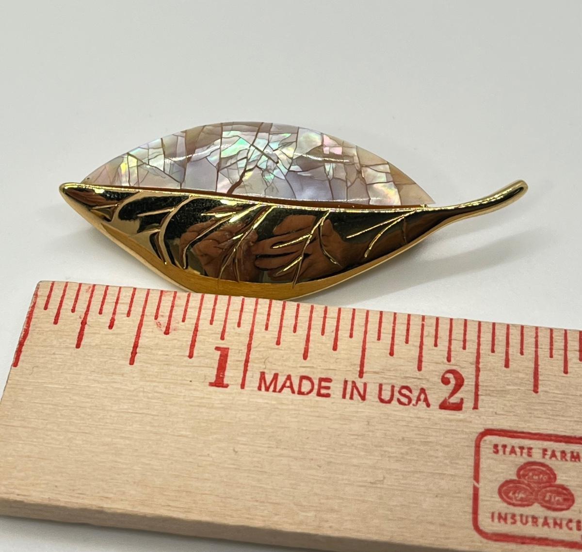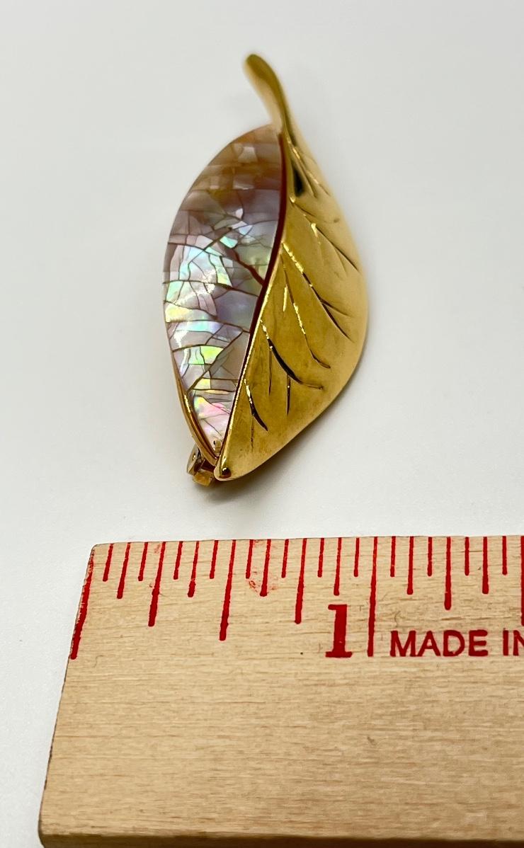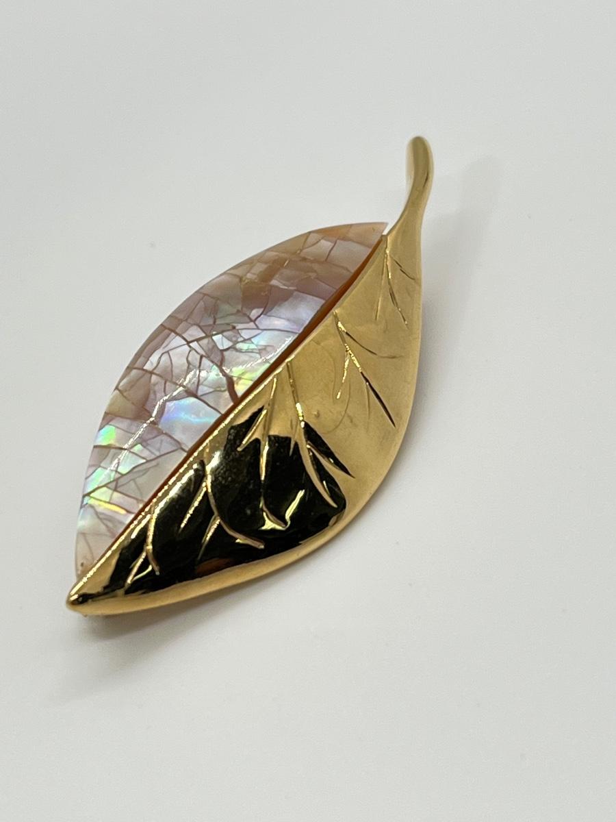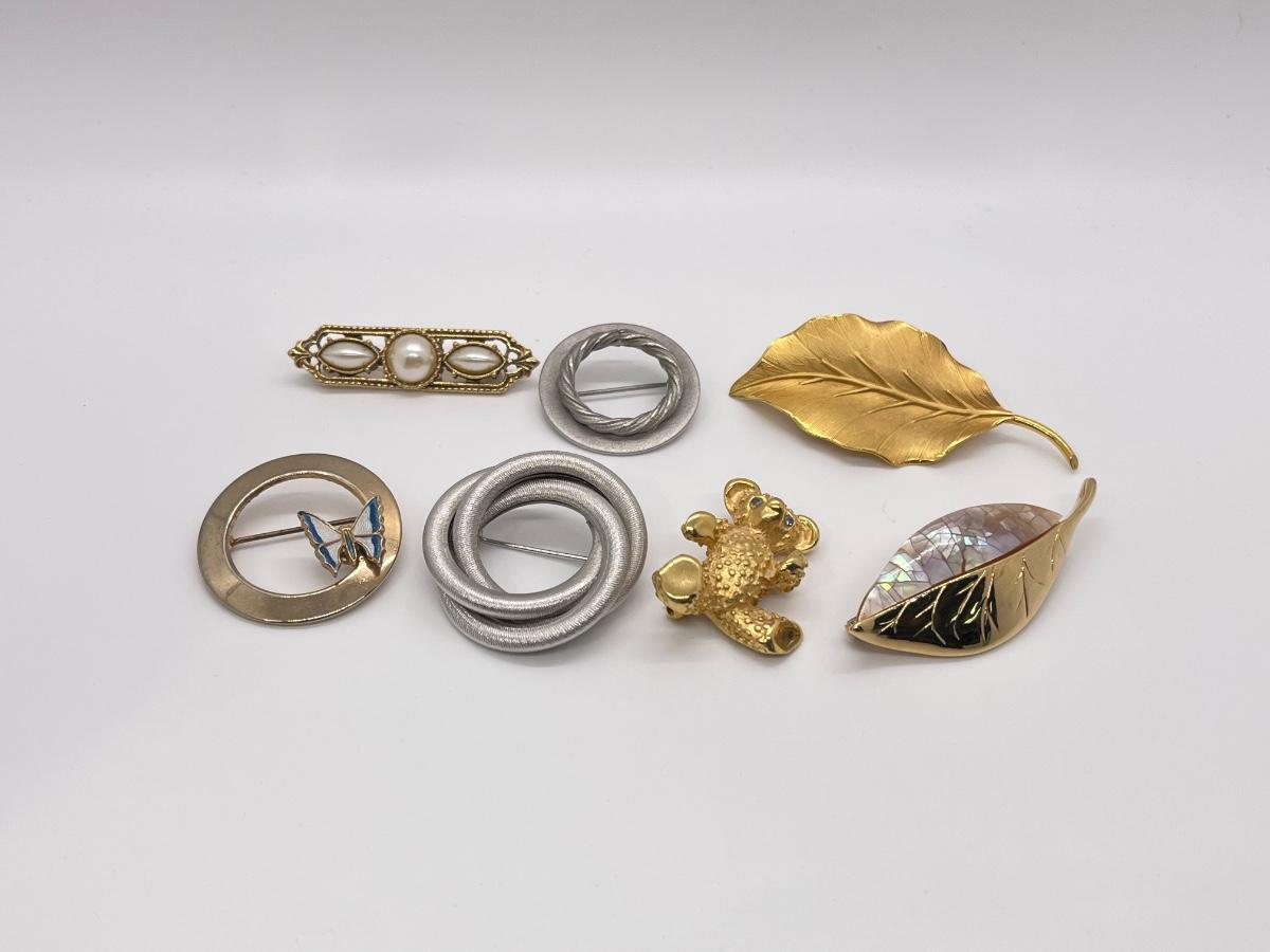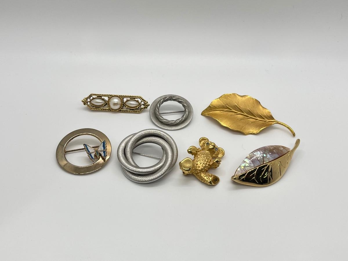 Lot 238: Vintage Brooch Lot: Liz Claiborne Inlaid Mother of Pearl, Primex Gold-Tone Leaf and More