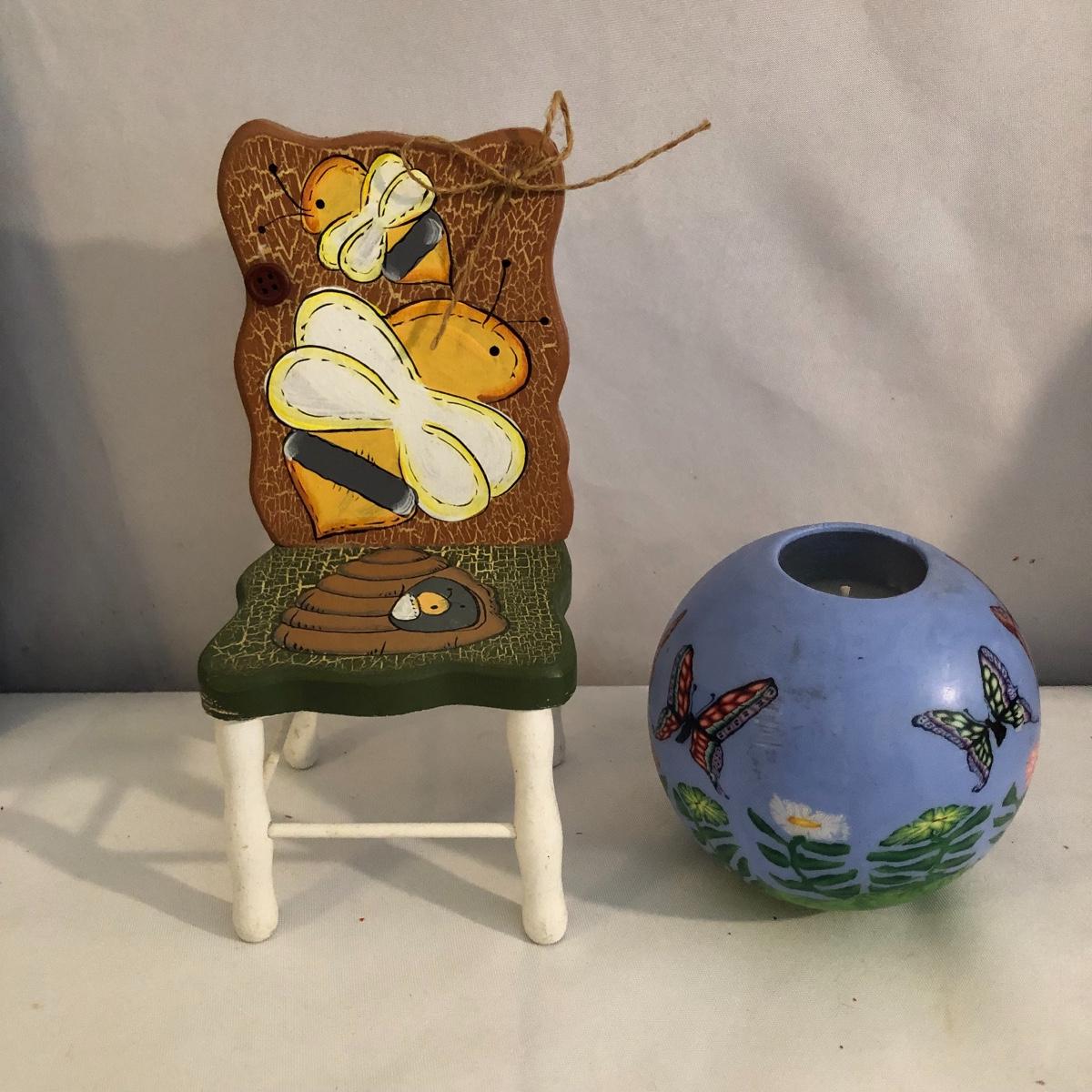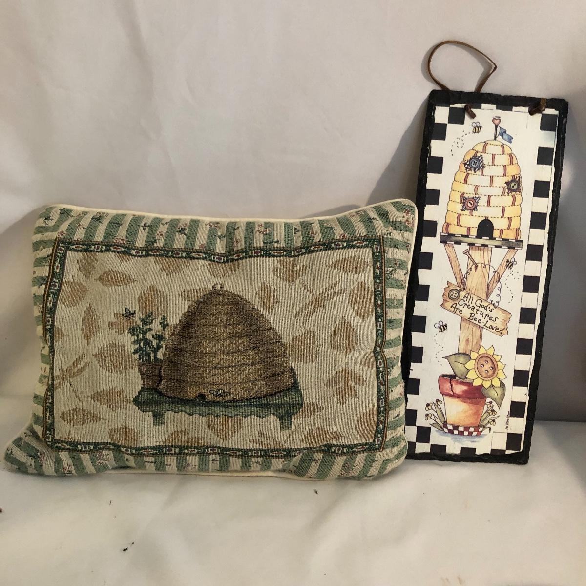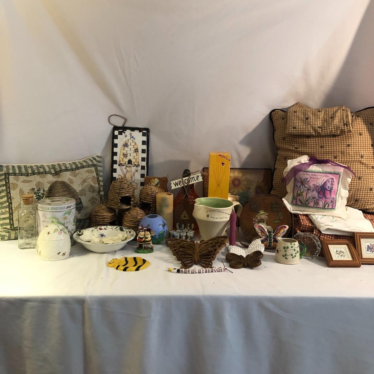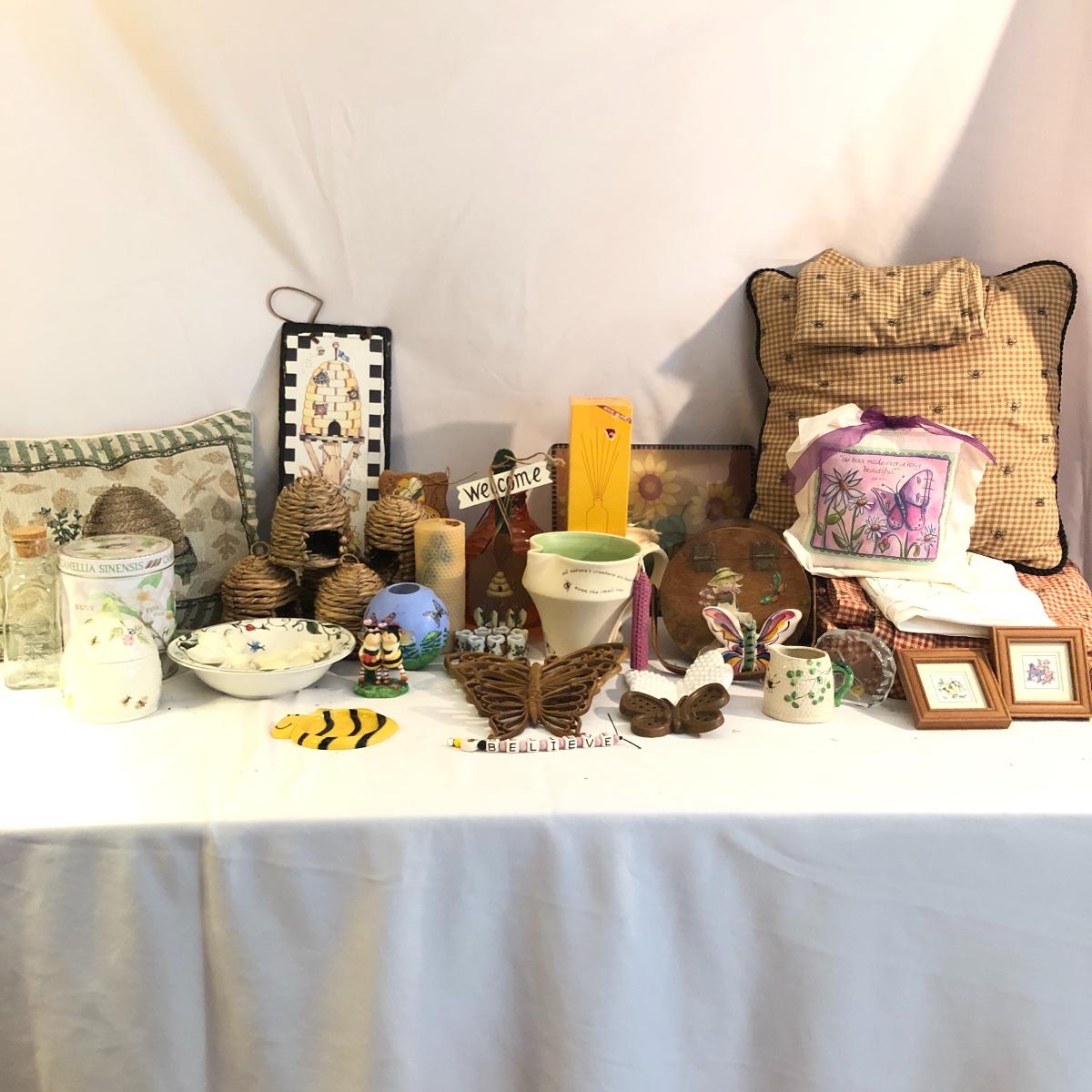 Two of nature’s most beautiful creatures in one place. This lot includes a bee inspired blanket that measures 96” x 96”, three pillows, table runner Beeleek honey jar, Reed diffuser, honey jar, candle, wooden basket, orange hive shaped glass piece with metal handle and plastic butterfly wall art. It also includes a slate wall hanging, butterfly bowl, candle, bee figurine and more. Hive shaped glass piece measures 5.5”D x 8” tall.