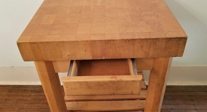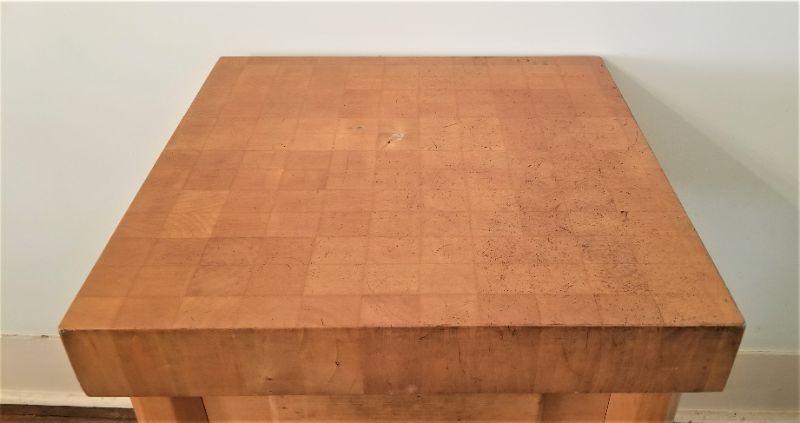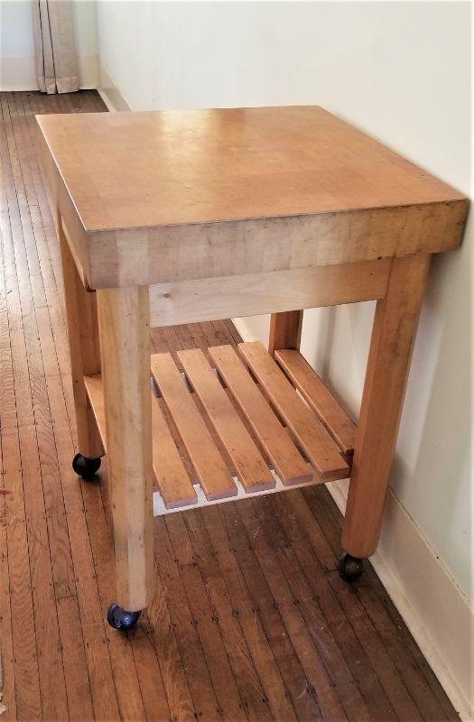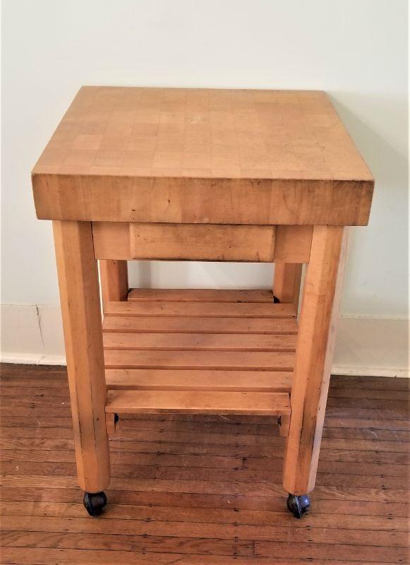This Butcher block table on wheels (has safety lock) is 3.5" thick and is SOLID (no hollow core). Quality piece. Has drawer and bottom shelf. Measures 35" tall, top is 2 feet by 2 feet. Has been used, but overall good condition.
