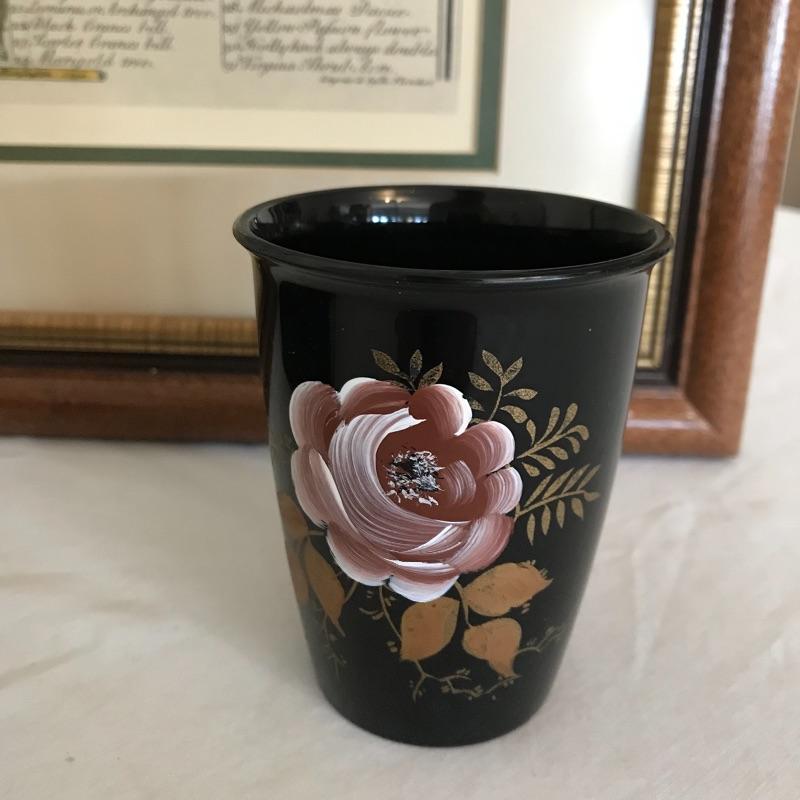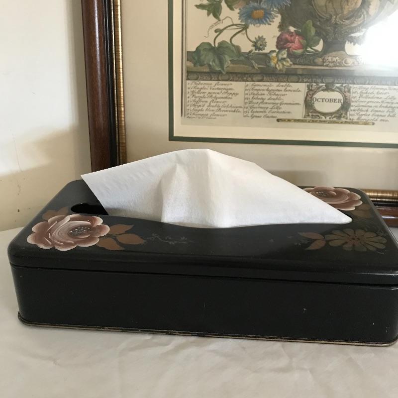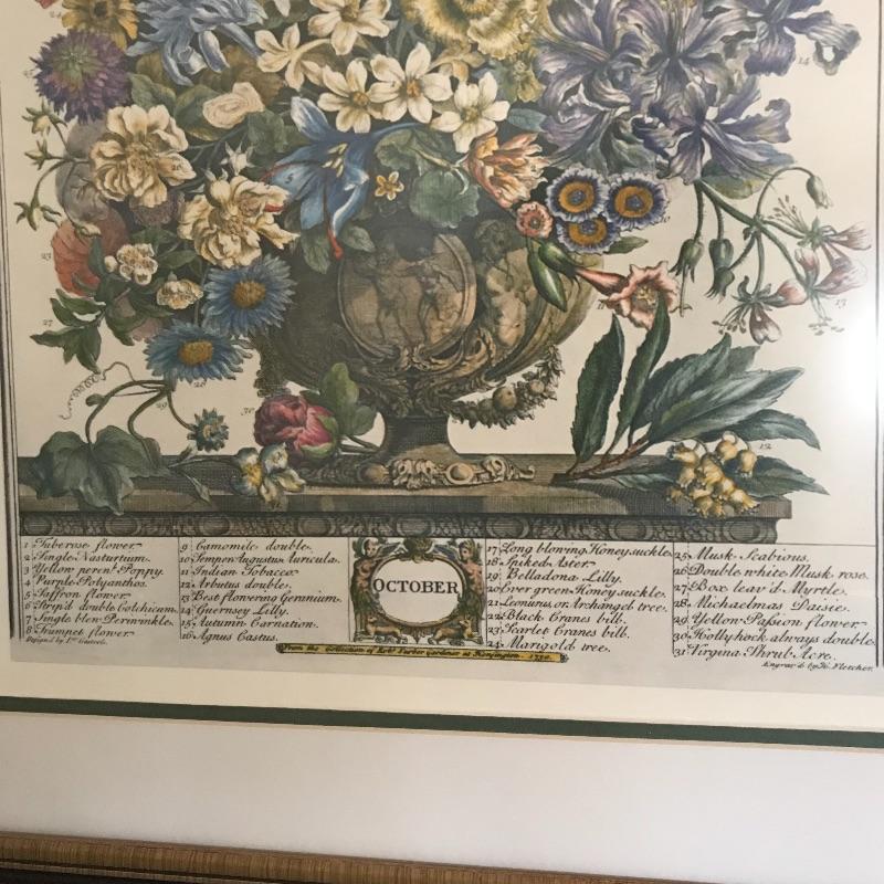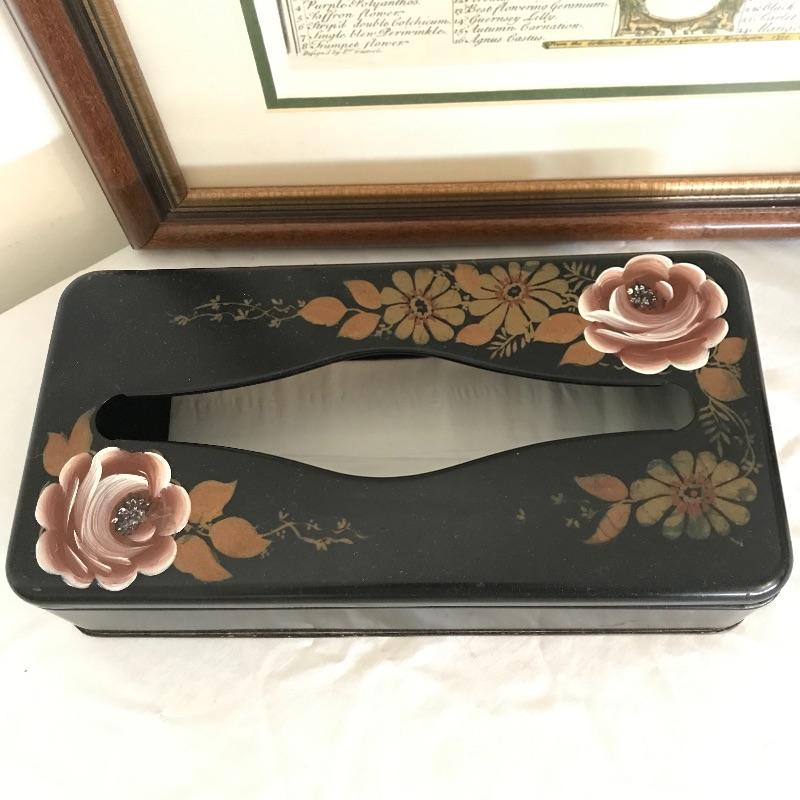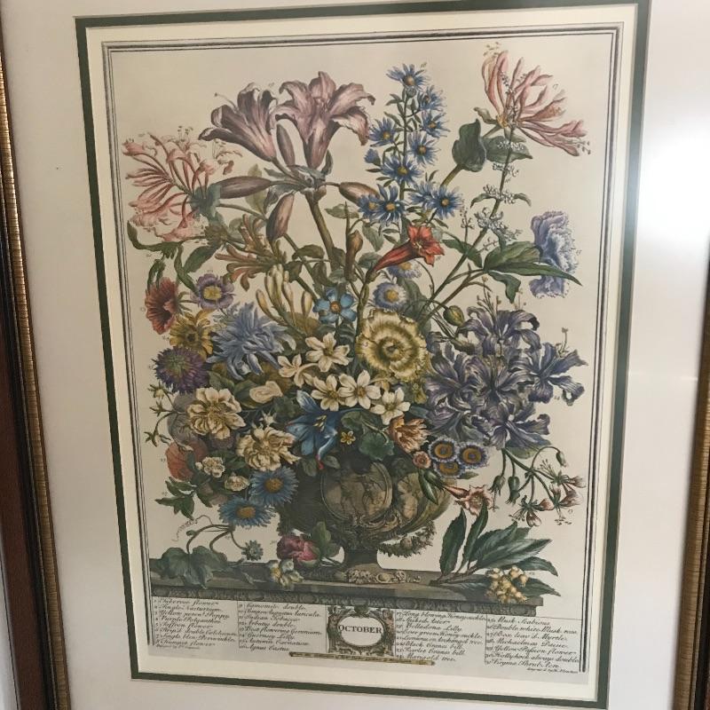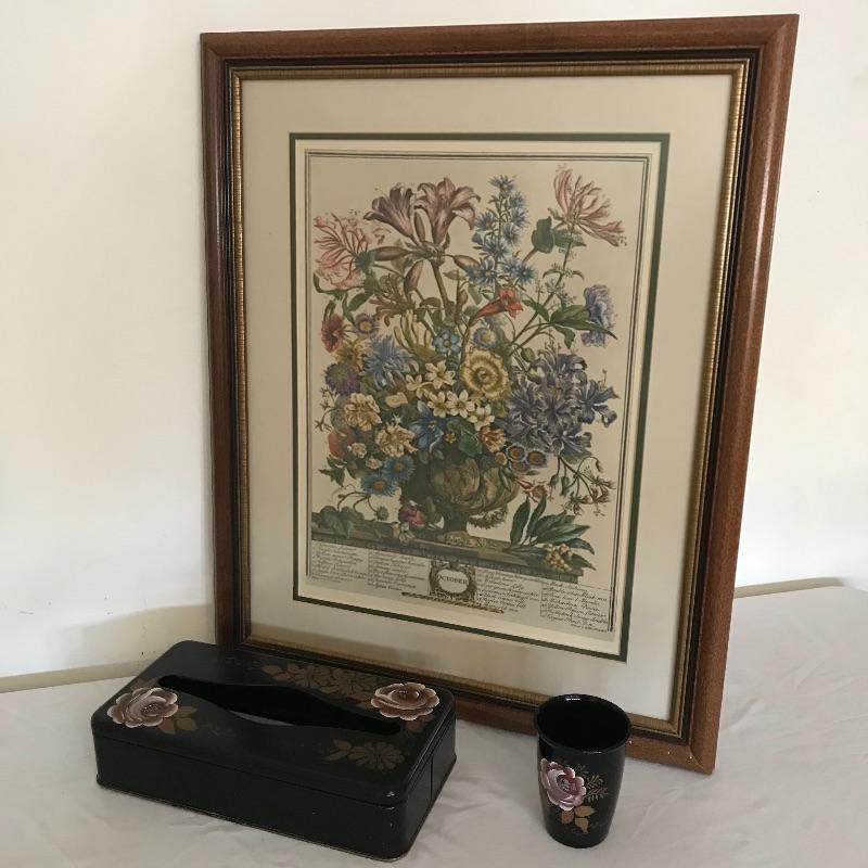 Add year round flowers to your vanity with this collection! Gorgeous vintage style October Flower print, matted behind glass in a wood frame with golden border. Frame measures 18.5” x 23”. Also for your vanity, a metal tissue box with a matching “unbreakable” nylon tumbler. Shipping available. Please call UPS with items and dimensions for a shipping quote prior to bidding as art is costly to ship.
