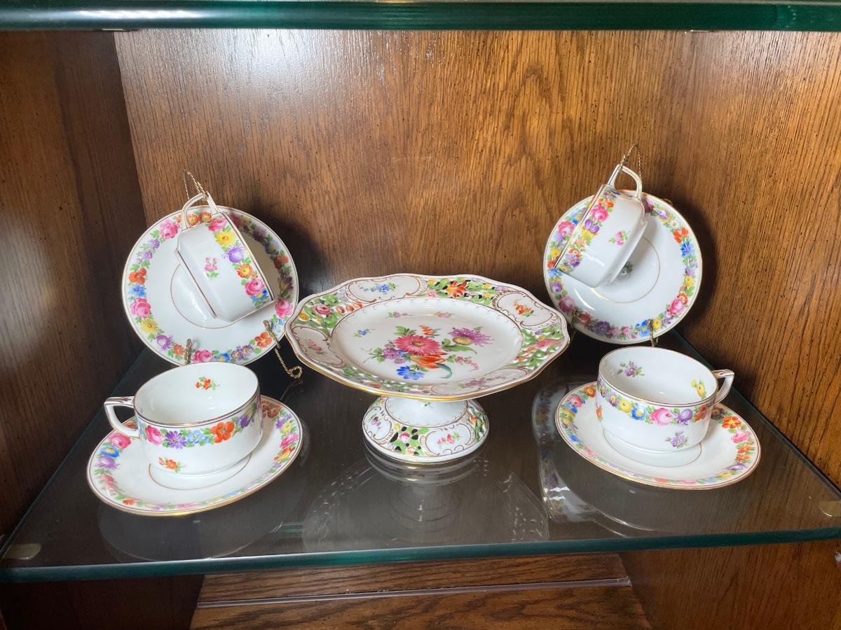Chateau Dresden Flowers Set includes 4 cups and saucers and a footed, lace serving plate