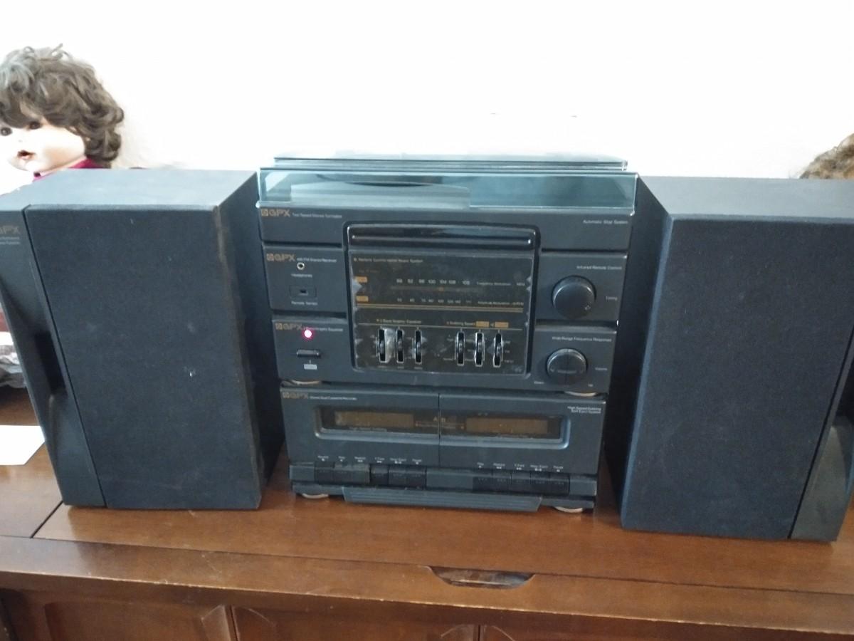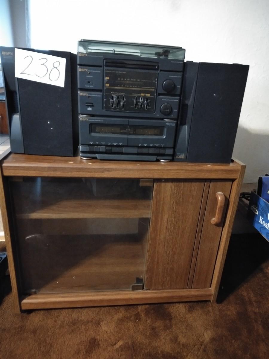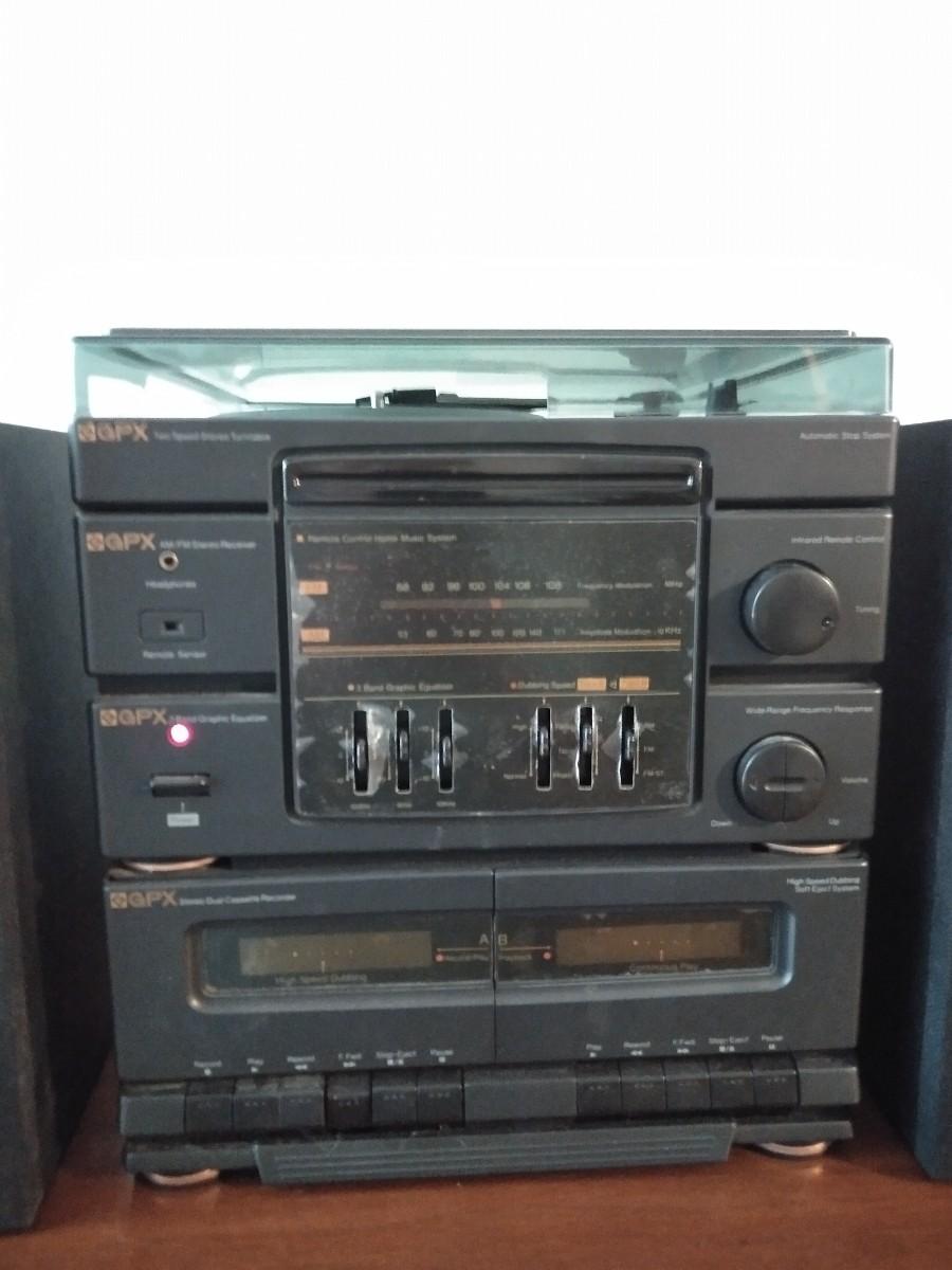 GRAN PRIX STEREO WITH TWO SPEAKERS. AM/FM, TURNTABLE, DUAL CASSETTE, WITH EQUALIZER. MODEL NUMBER S4156 E68496 COMES WITH MEDIA CABINET.