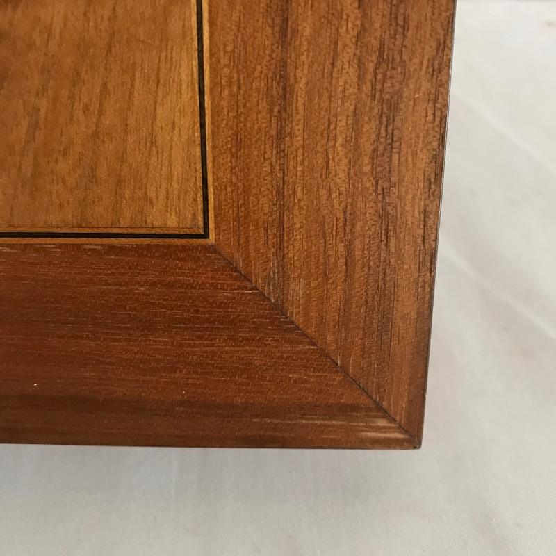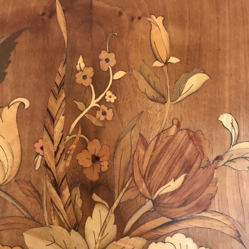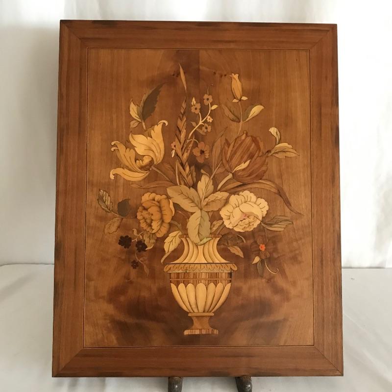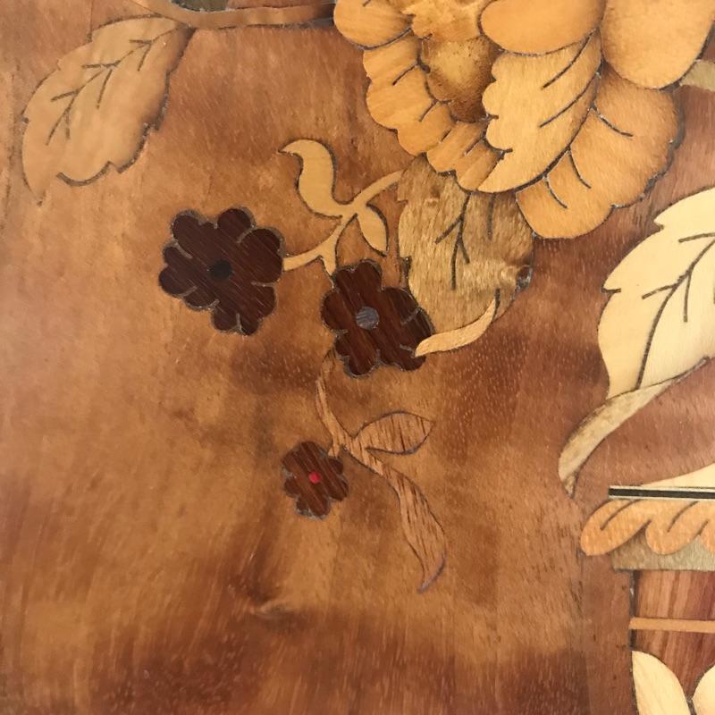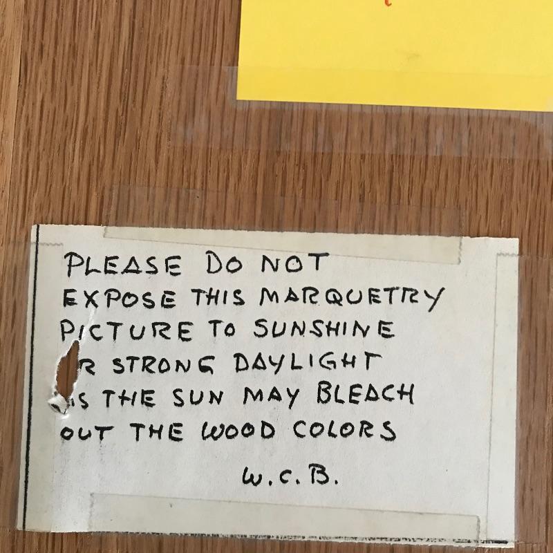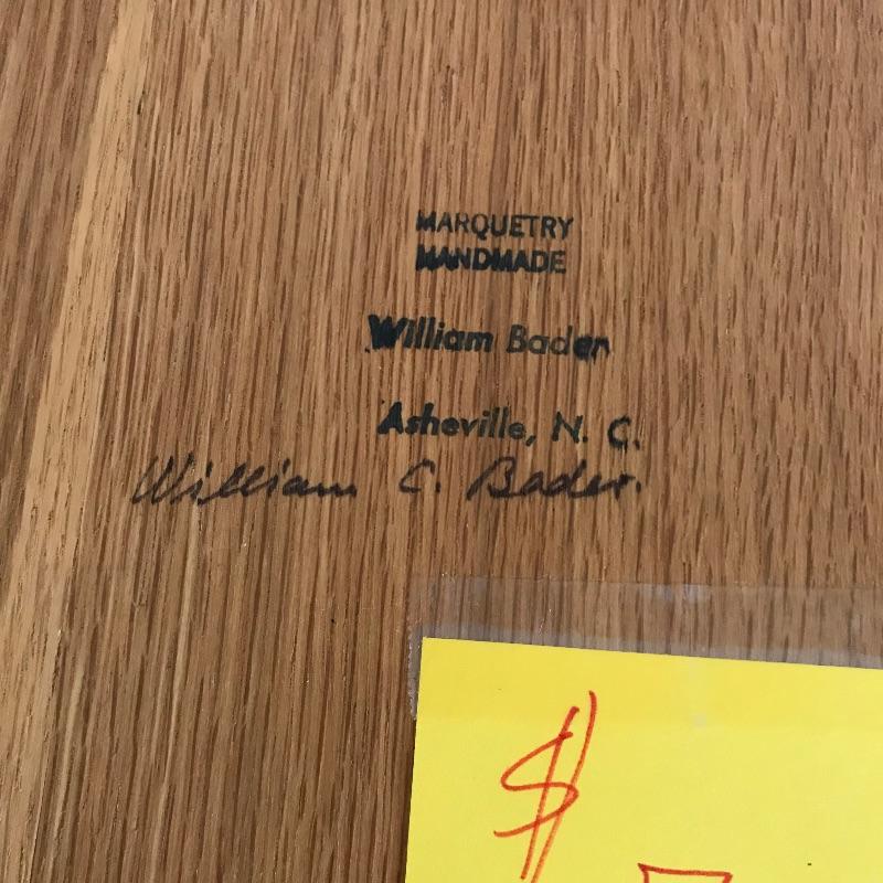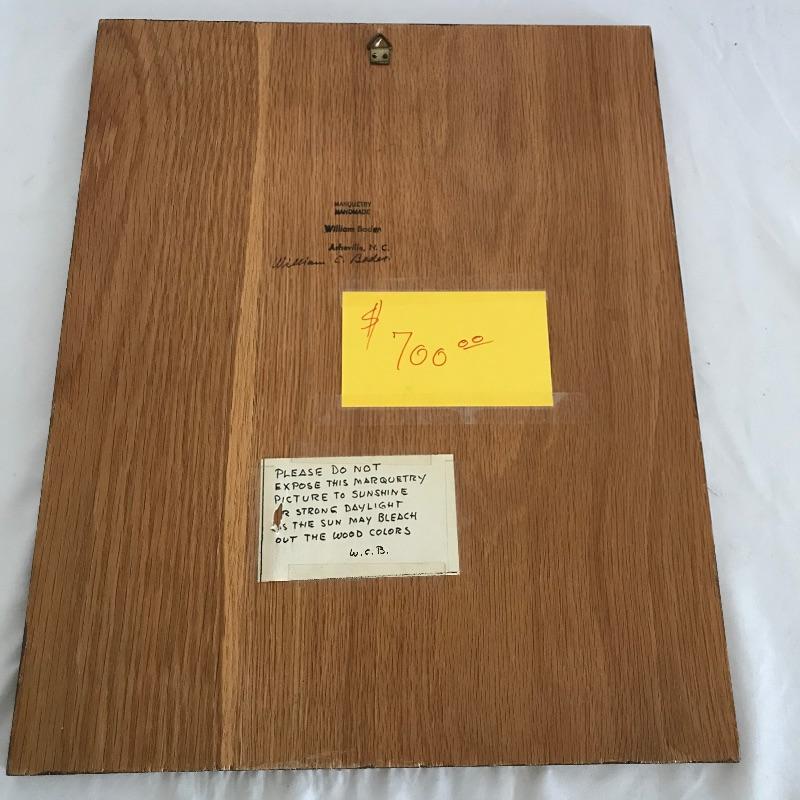 A second prized art piece by Asheville local artist William Bader. A large floral arrangement is depicted in this piece with pops of color like salmon and olive in this stunning handmade marquetry art. Piece measures approximately 15” x 18.75” and has a photo copy of a handwritten note possibly from Mr. Bader taped on the back. See photos and zoom in if possible on images to fully appreciate the craftsmanship that has gone into these pieces. Shipping available. Please call UPS with dimensions at 828-252-6930 for a shipping quote prior to bidding.