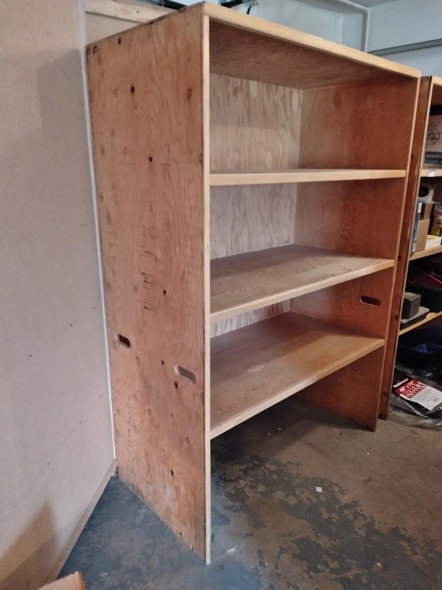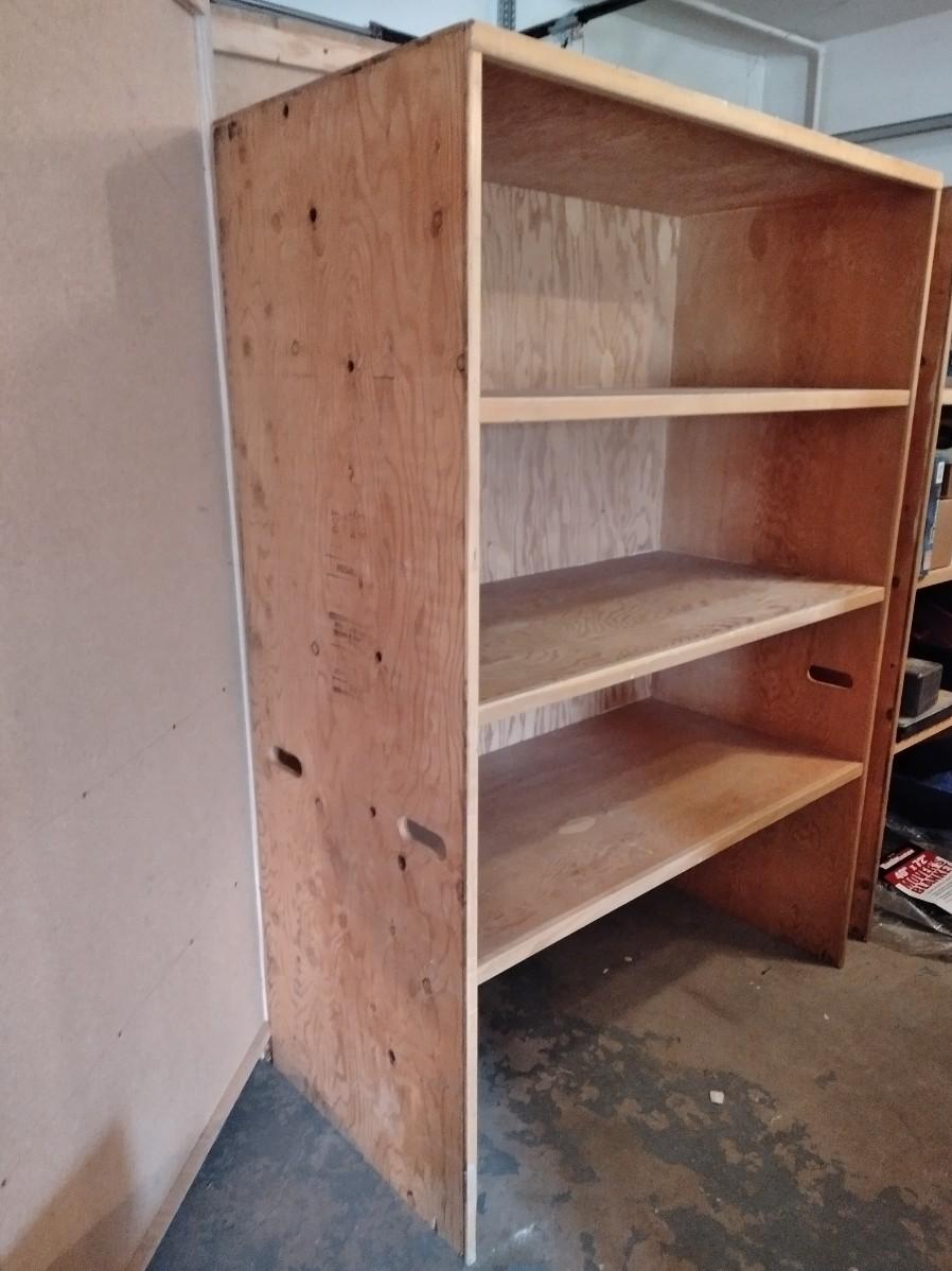 LARGE WOODEN SHELVING UNIT WITH HANDLES ON THE ENDS 70" X 48" X 24"