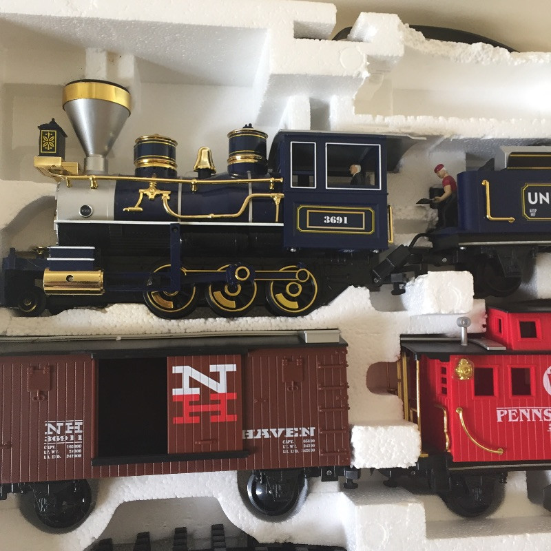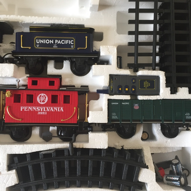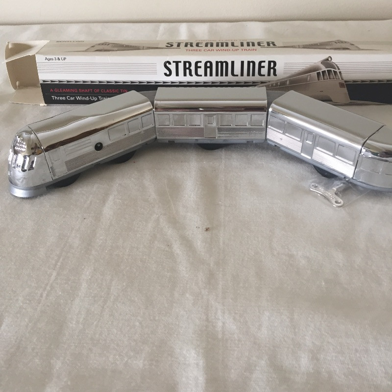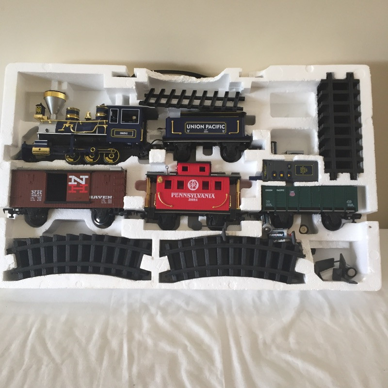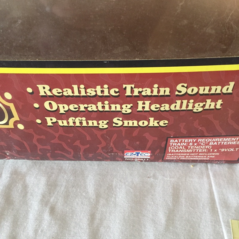 All Aboard for this great collection of trains and train paraphernalia. This large battery operated train set comes with a blue locomotive train with the numbers 3691 on the side and has a coal tender, a box car, gondola and caboose. Also included are the tracks and remote control. This set appears to be in great shape, comes with the original box but has not been tested. See images but note we cannot guarantee that all pieces are accounted for. Also included with this lot is a framed collection of train images, frame does have a few scuff marks. Streamlined, a three car wind-up train that is in original box, a nice selection of books and a safety collared shirt.