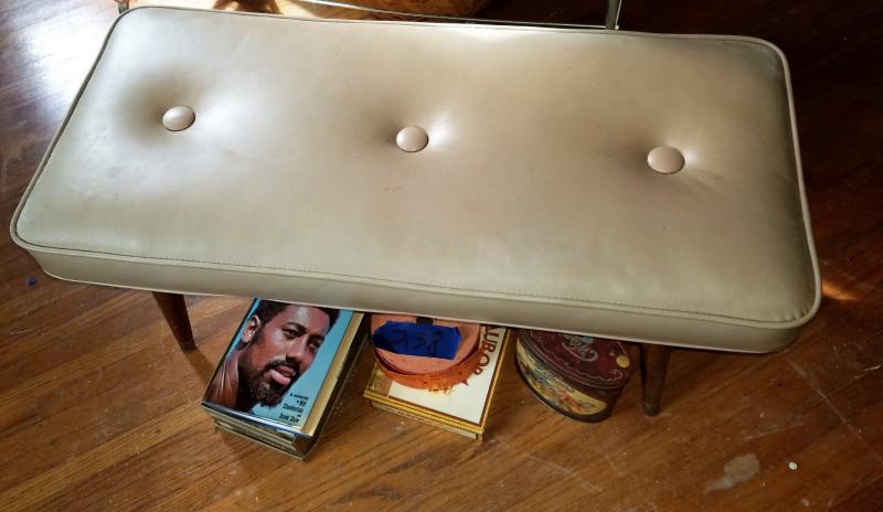 Leatherette bench with wooden legs measures 40 inches long x 15 inches deep along with the items on it