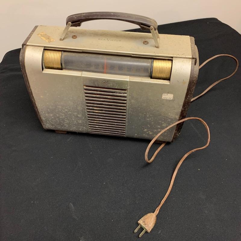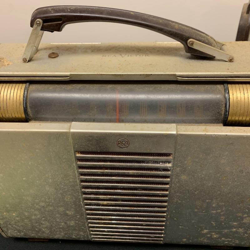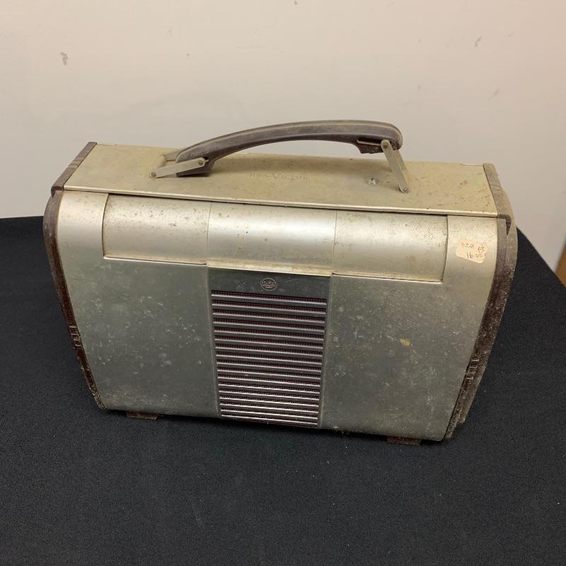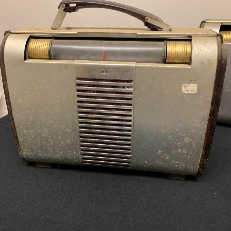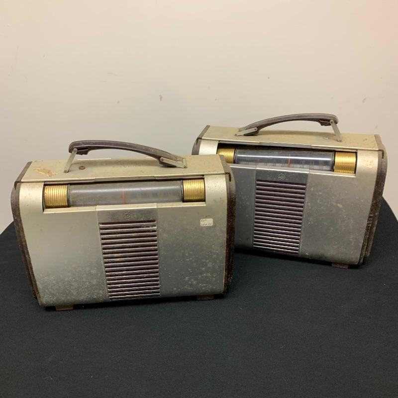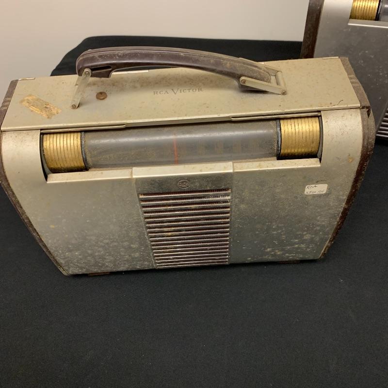This lot includes two RCA Victor Tube radios, model 66BX. They come in a case with an aluminum body, brown Bakelite sides, and a handle. One unit has an electric plug but does appear to power on when plugged in. The other unit does not have an electrical cord to test functionality.