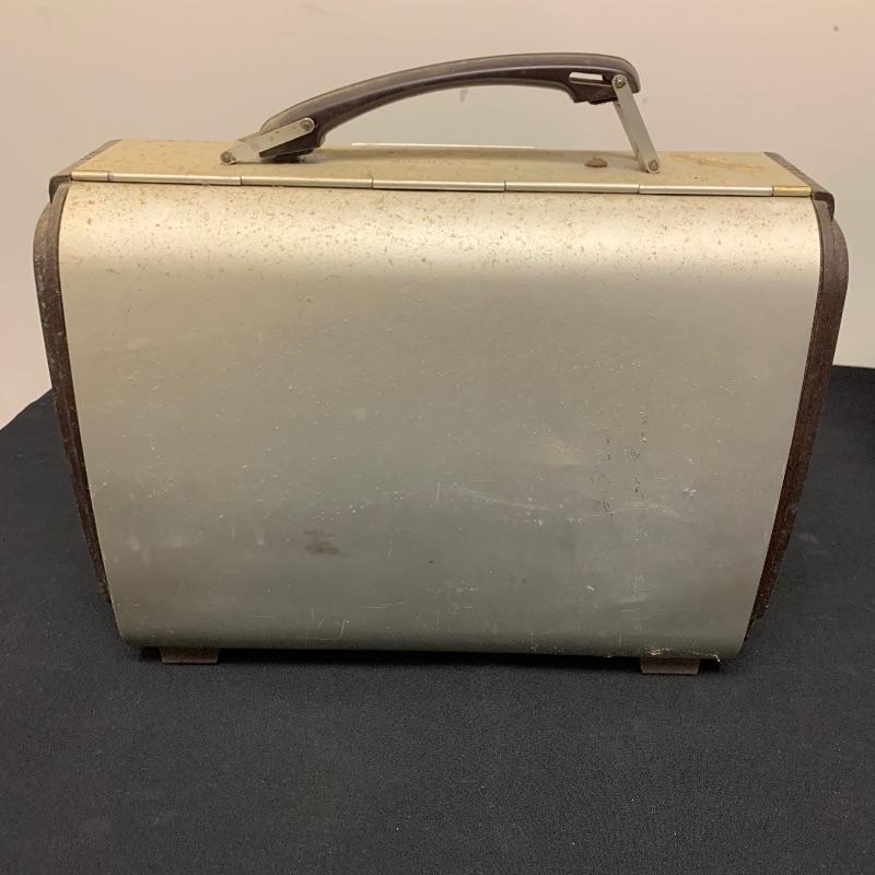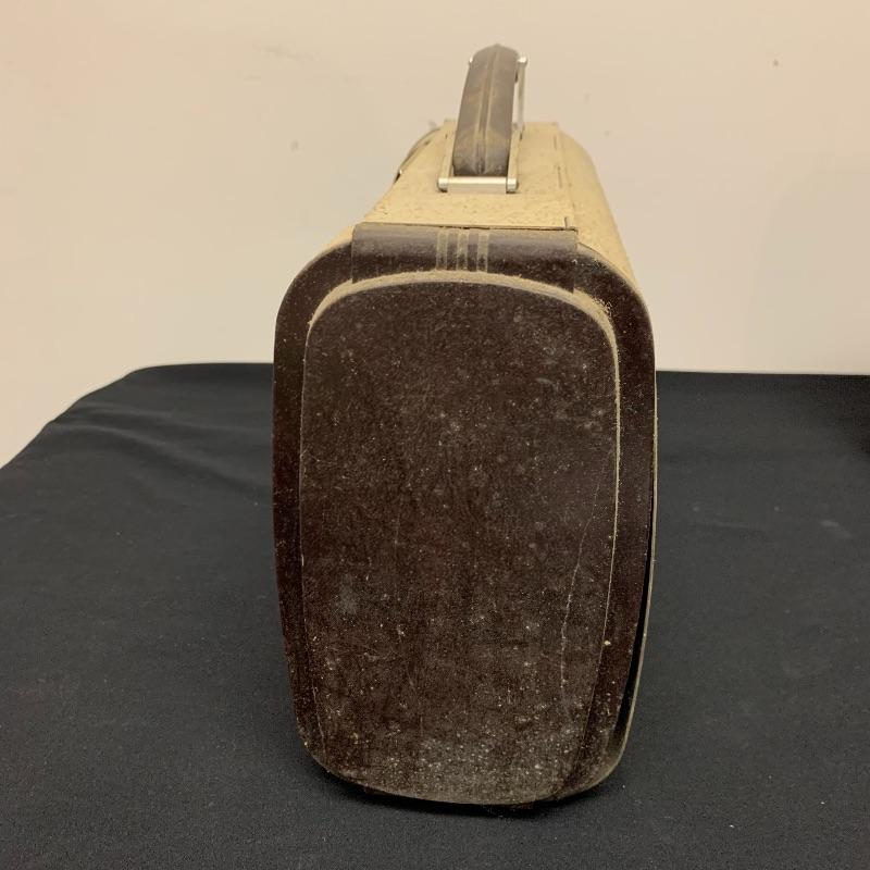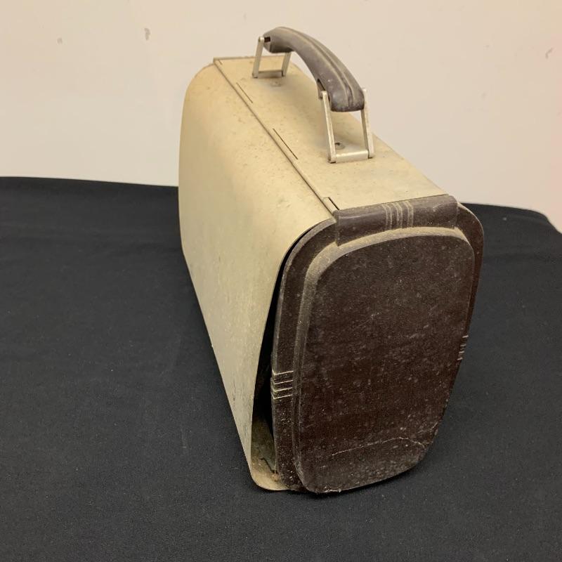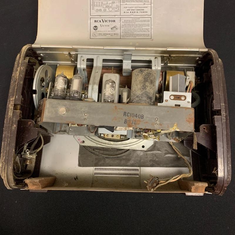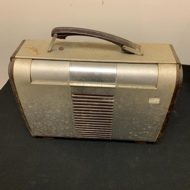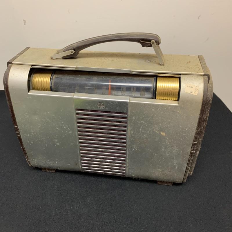 This lot includes two RCA Victor Tube radios, model 66BX. They come in a case with an aluminum body, brown Bakelite sides, and a handle. One unit has an electric plug but does appear to power on when plugged in. The other unit does not have an electrical cord to test functionality.