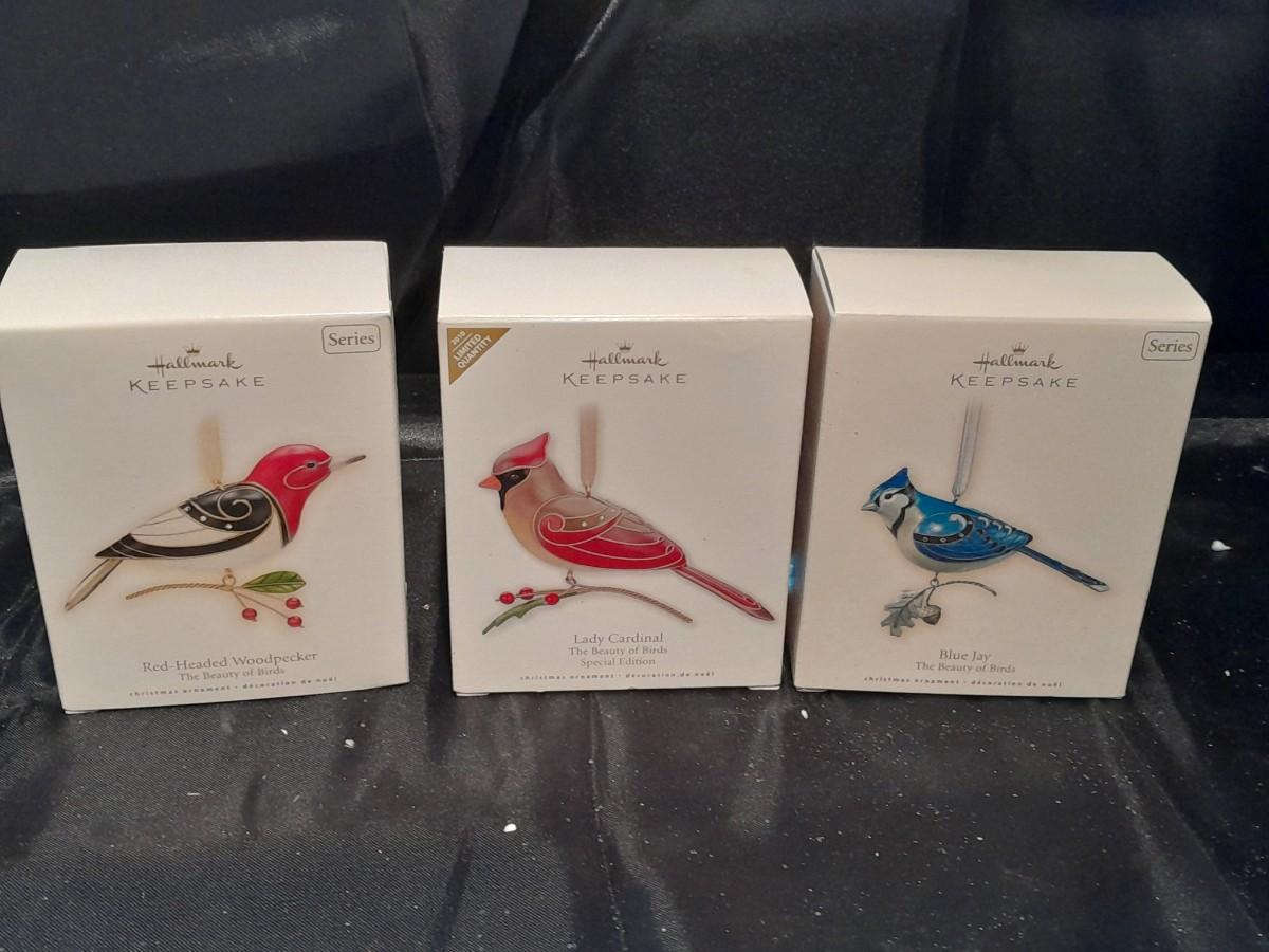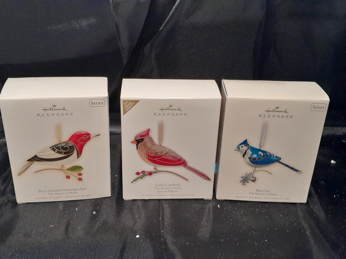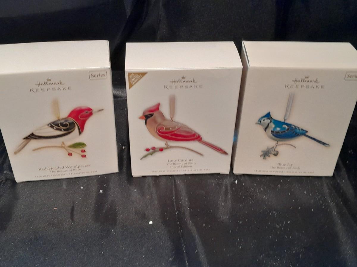 THREE HALLMARK KEEPSAKE BIRD ORNAMENTS, RED-HEADED WOODPECKER, LADY CARDINAL, AND BLUE JAY