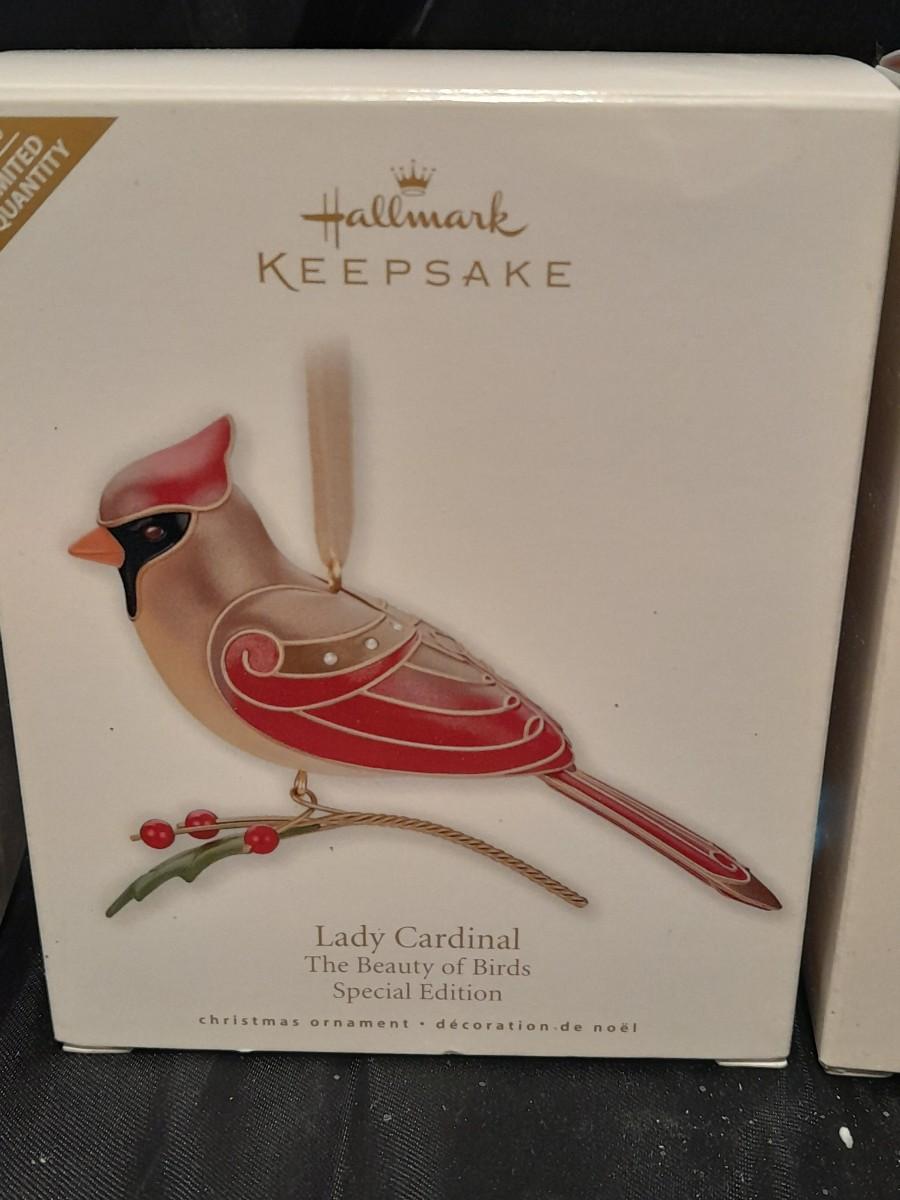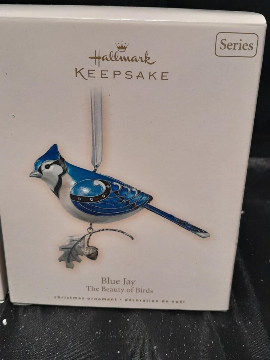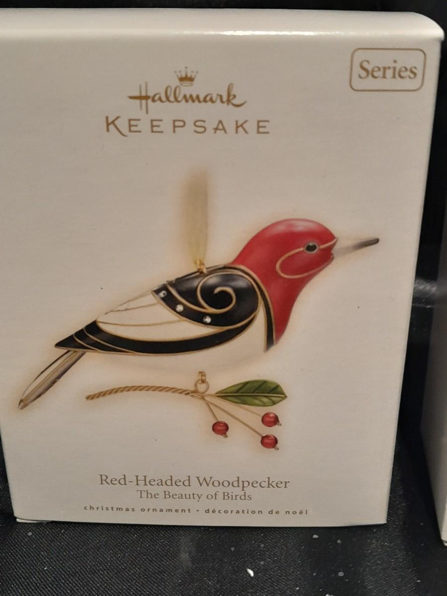THREE HALLMARK KEEPSAKE BIRD ORNAMENTS, RED-HEADED WOODPECKER, LADY CARDINAL, AND BLUE JAY