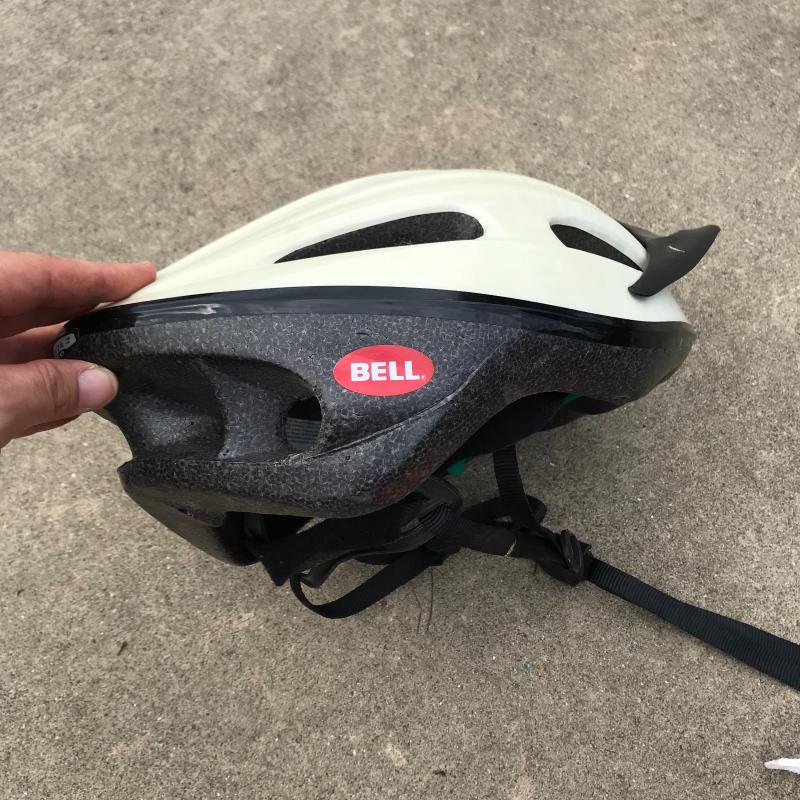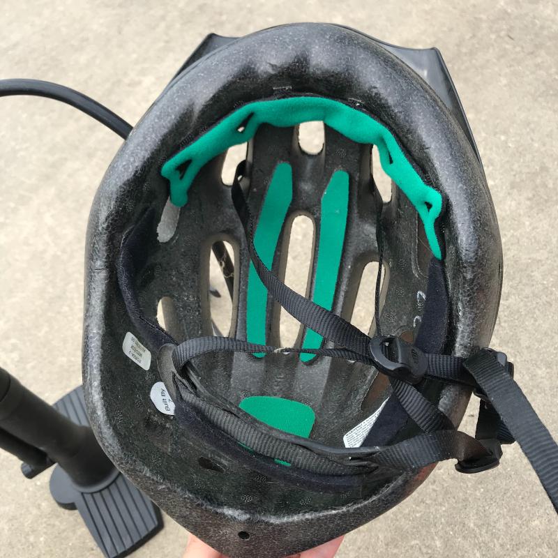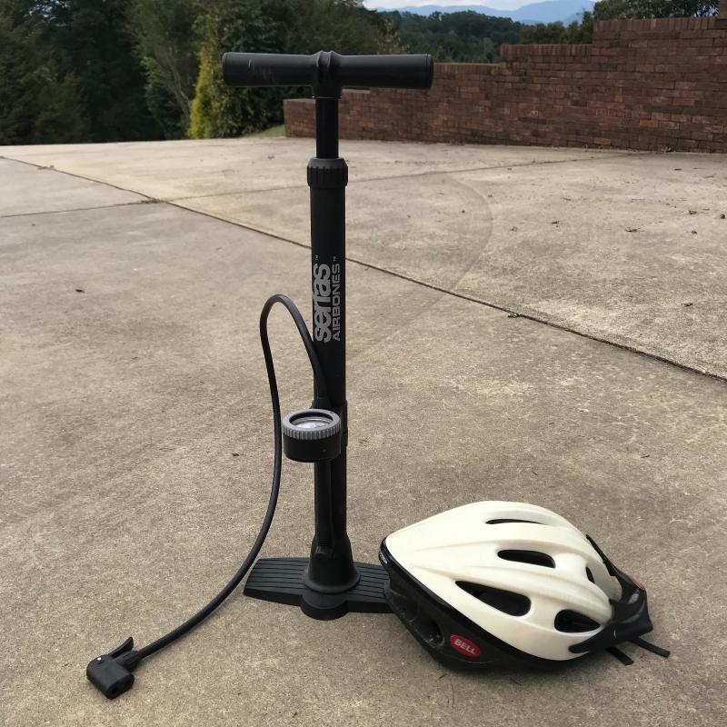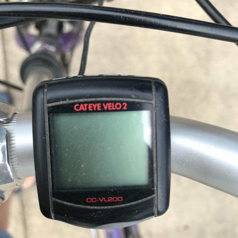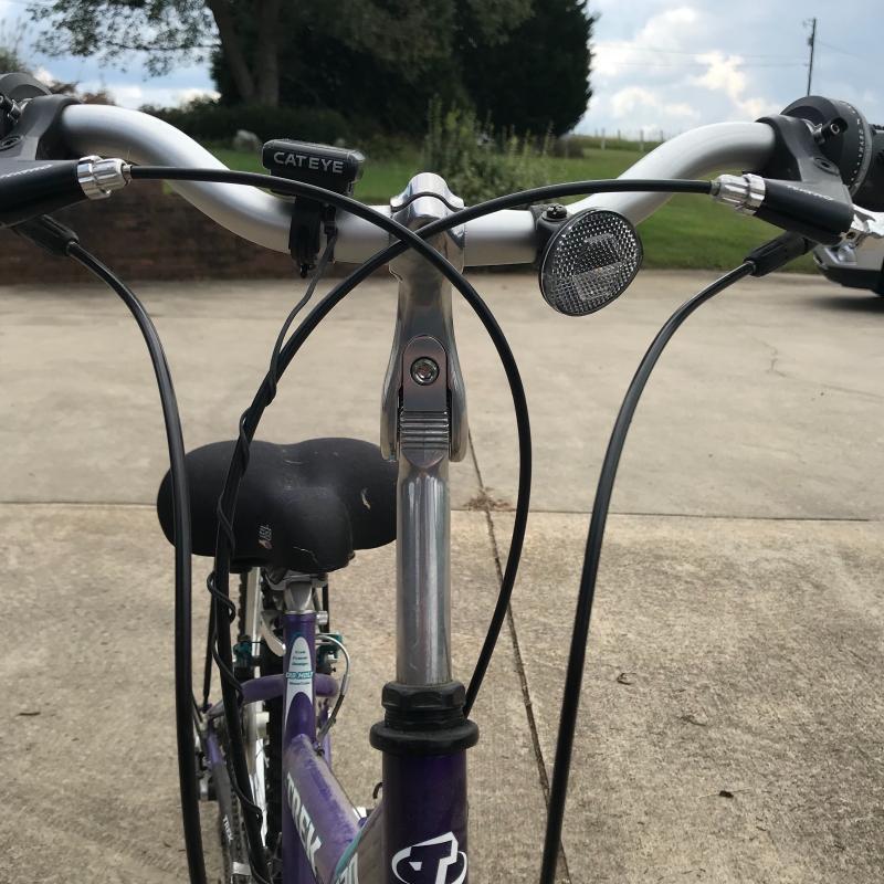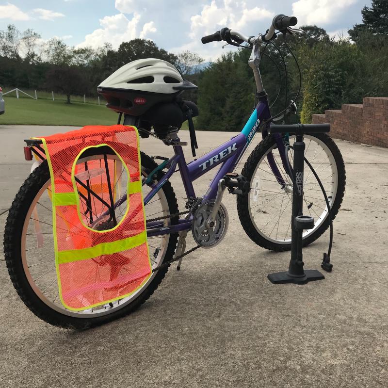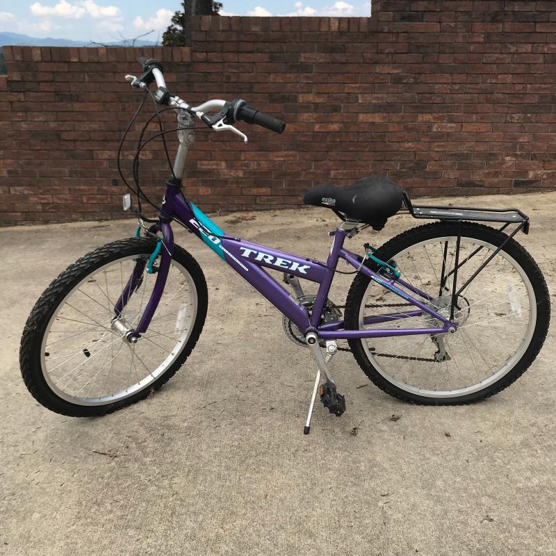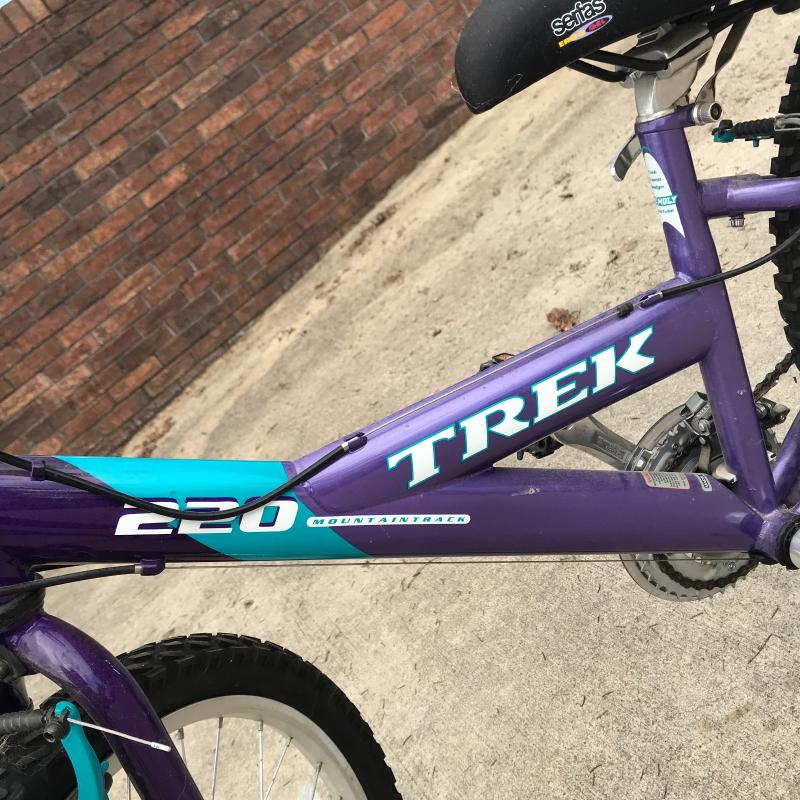 Purple and teal Trek Mountaintrack 220, 21 speed. Bike probably needs chains cleaned and/or tuneup. It comes with an ivory Bell Forza 2 helmet, caution vest and mounted Cat Eye speedometer (working condition unknown). Tires are flat, but you’re in luck! Lot includes Serfas Airbones pump. Bike size could not be located, Serfas Ergo Gel seat is almost 28” tall in photos. No shipping.