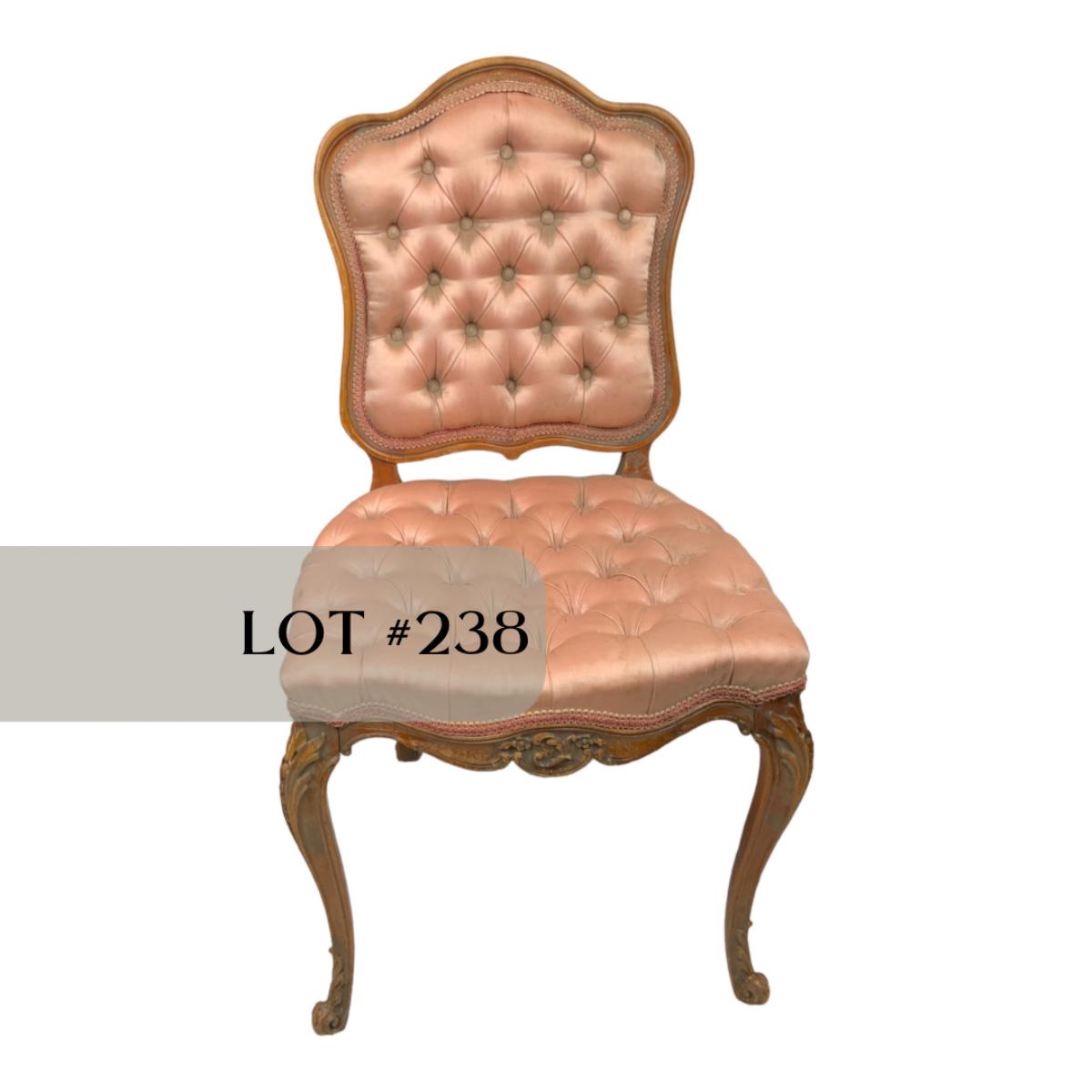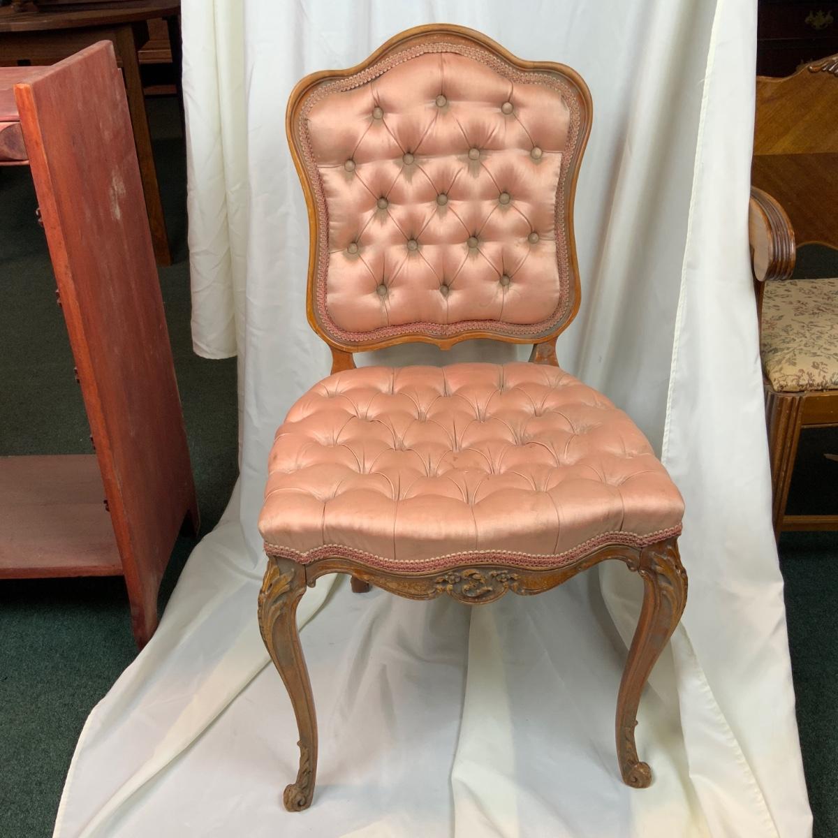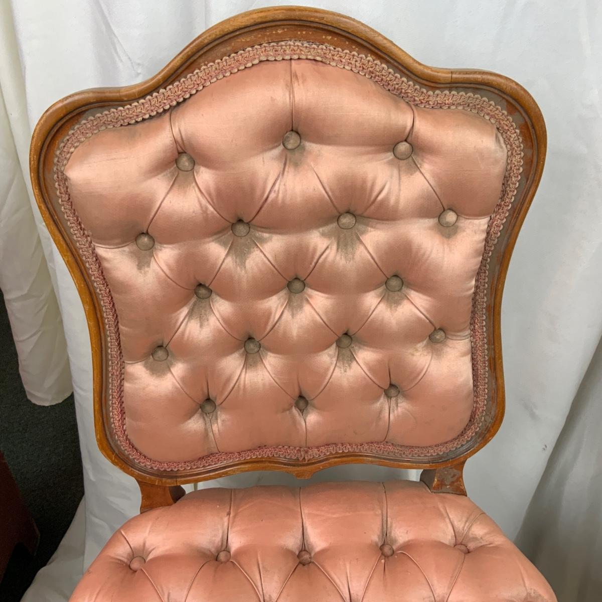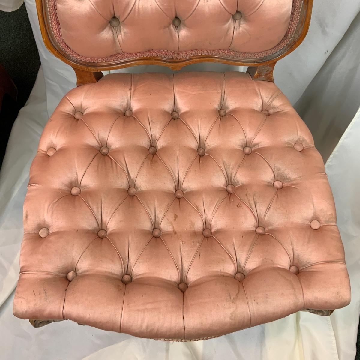 Tufted pink satin chair. Need some cleaning and attention. Overall a nice piece. //::\\ Please see photos for details and condition. No attempt has been made to hide any imperfections. All items listed in this auction are warehouse items, and need to be cleaned. A majority of the items need restoration as well. All items are sold AS IS and WITHOUT GUARANTEE. If you are uncertain about an item, DO NOT BID. Due to the nature of this online auction in-person inspection is HIGHLY recommended. All Sales are FINAL. Pick Up Times are FIRM. Please confirm with your own schedule that you can pick up in the scheduled times listed in the Terms and Conditions. Any questions please message the auctioneer. DO NOT Contact The Harp Gallery.