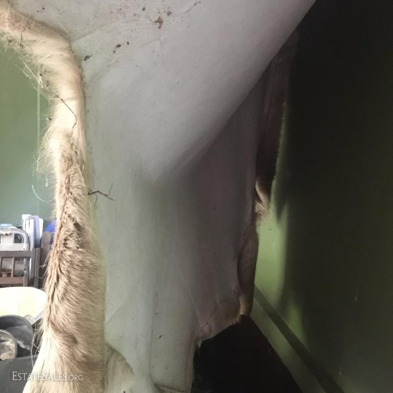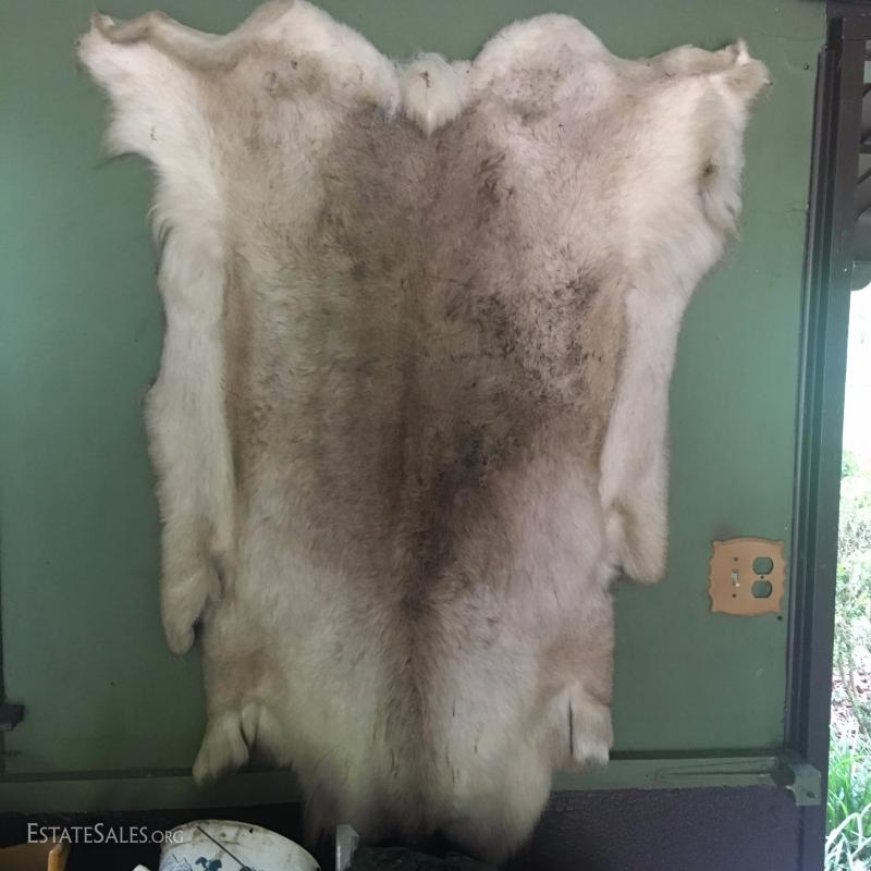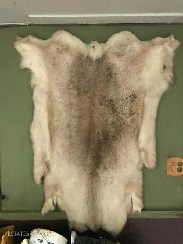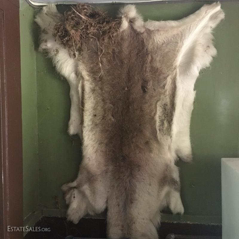 Two Reindeer hides from Norway. Have been hanging in garage so pretty dirty. Approx 48"l x 32"w. Brown and beige coloring.