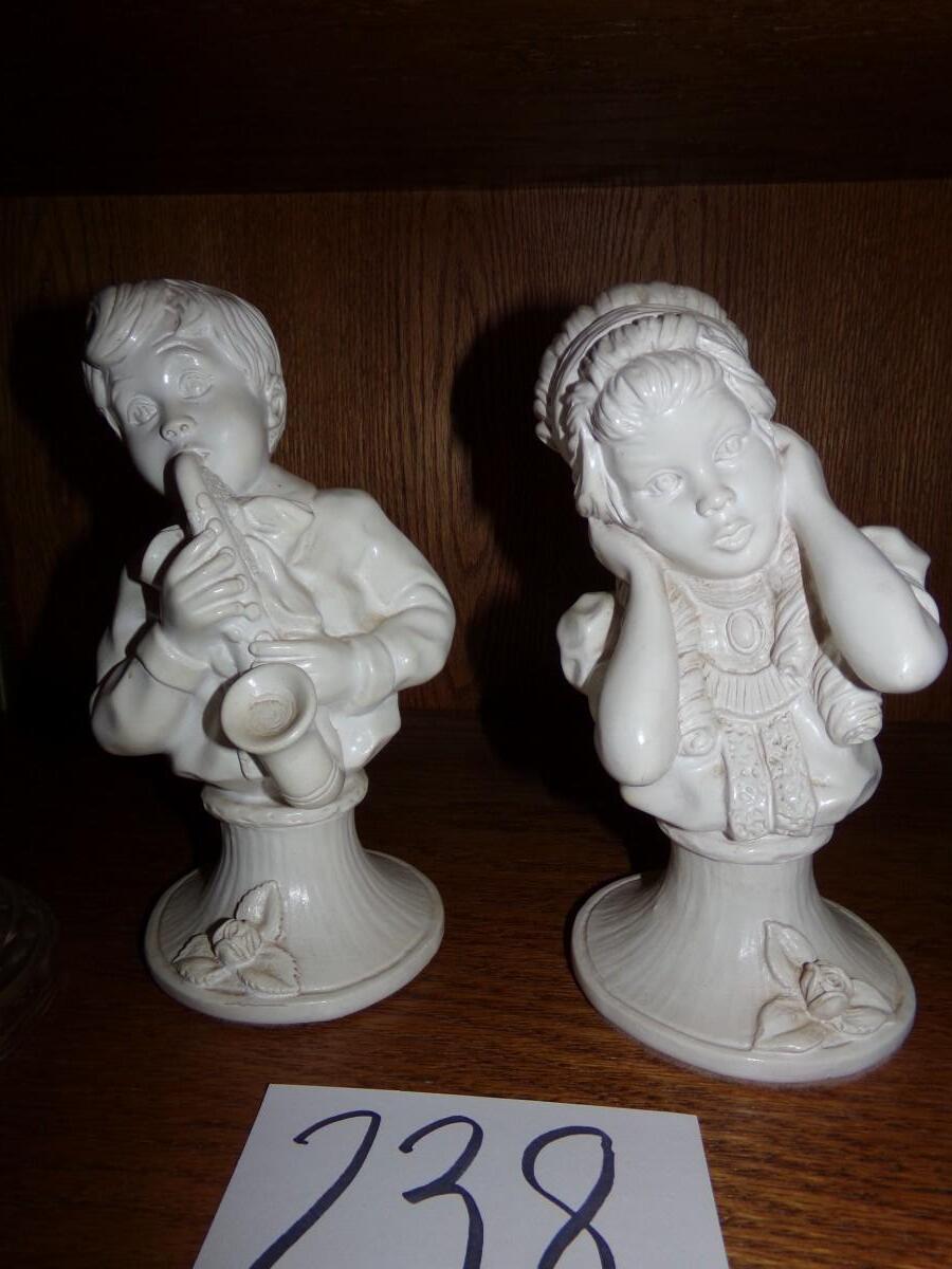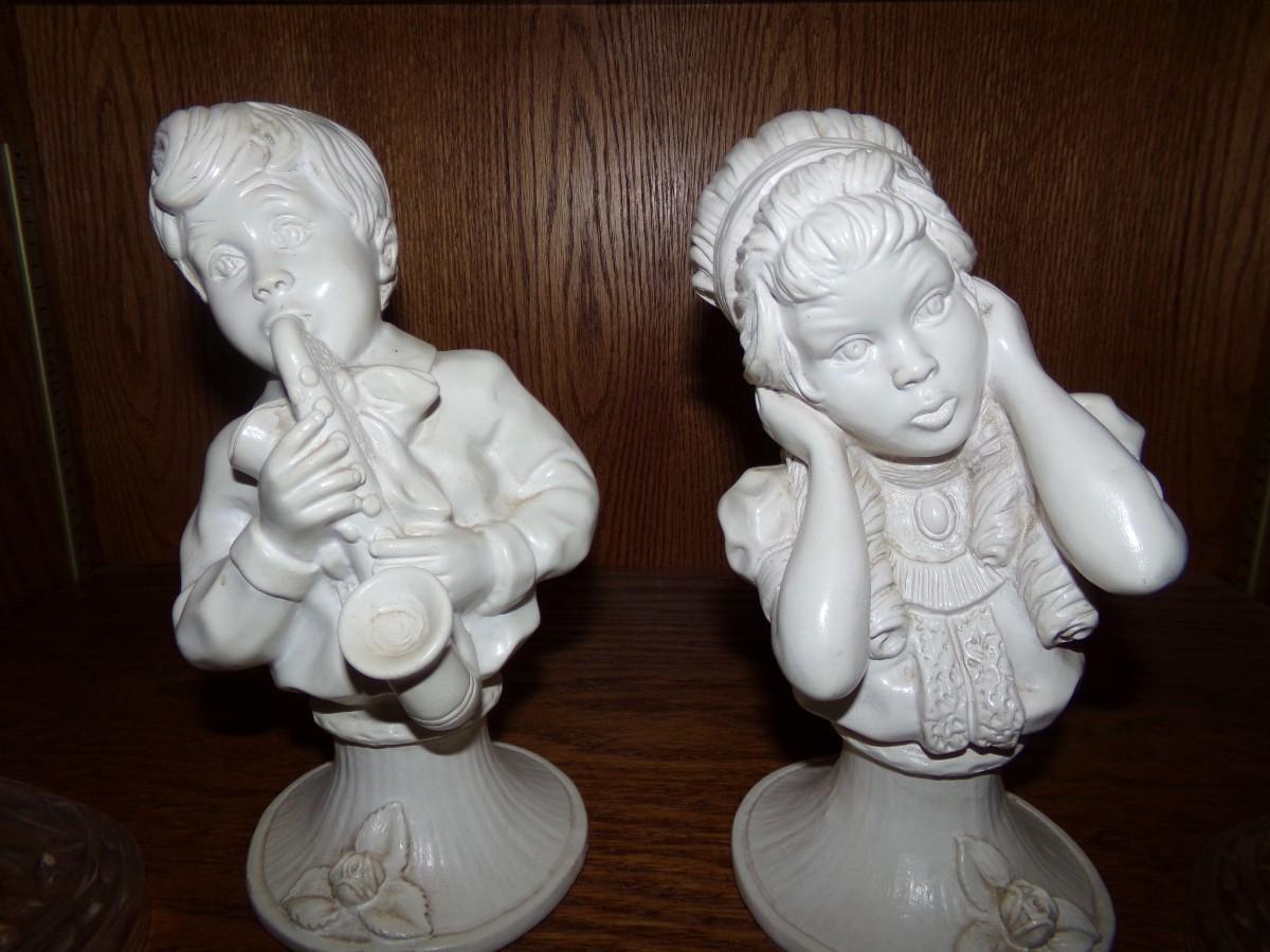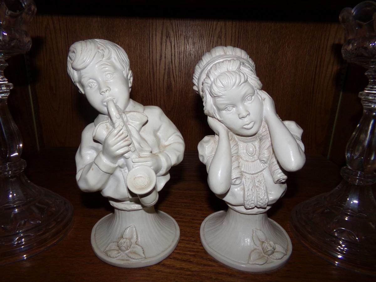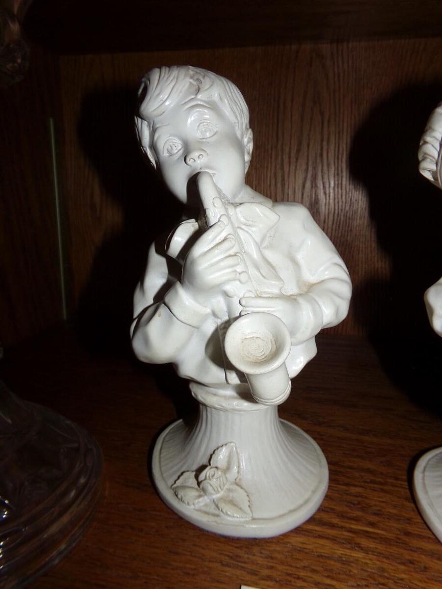 SET OF 2 U. KENDRICK STATUES. GIRL HOLDING HER EARS AND A BOY PLAYING THE SAX. ALSO 2 VINTAGE GLASS CANDLE HOLDERS.