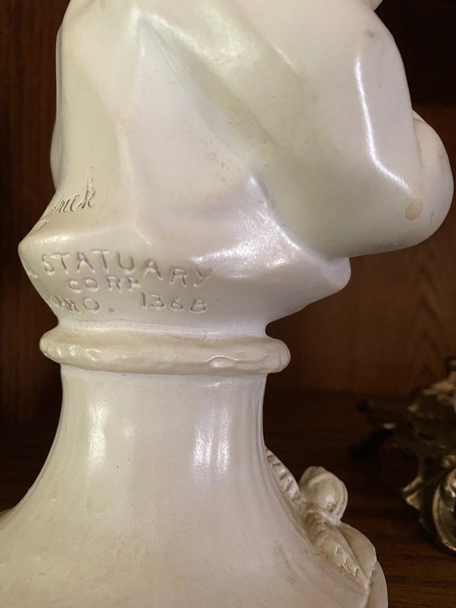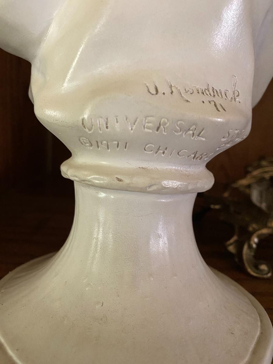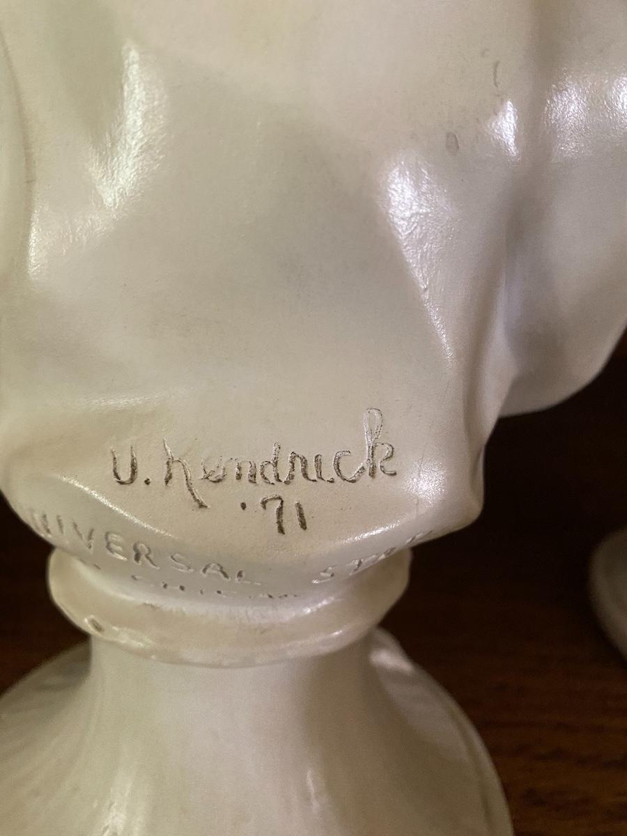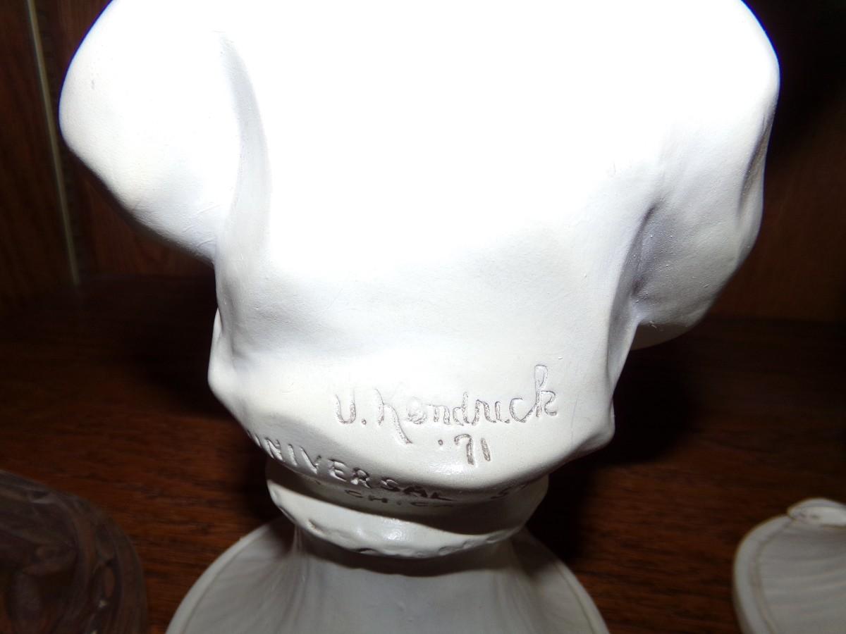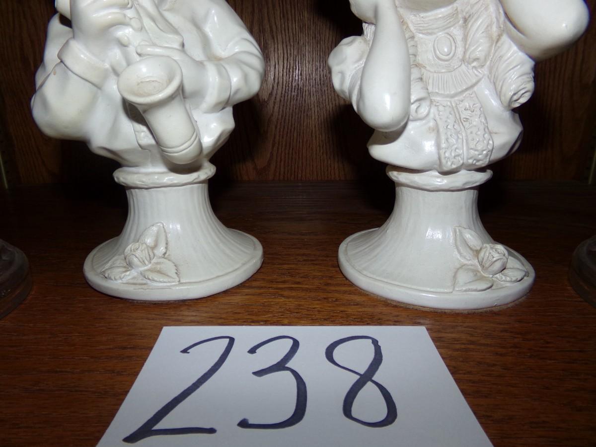 SET OF 2 U. KENDRICK STATUES. GIRL HOLDING HER EARS AND A BOY PLAYING THE SAX. ALSO 2 VINTAGE GLASS CANDLE HOLDERS.