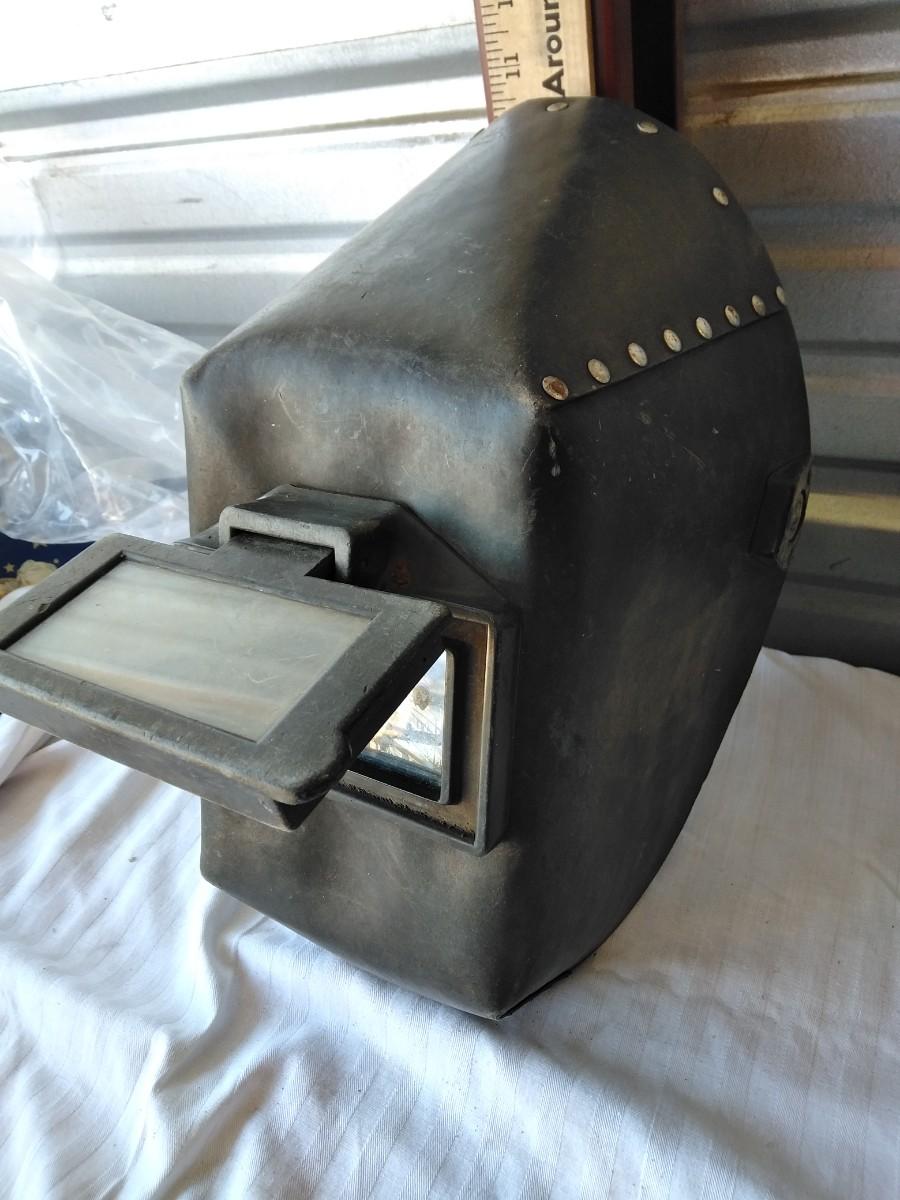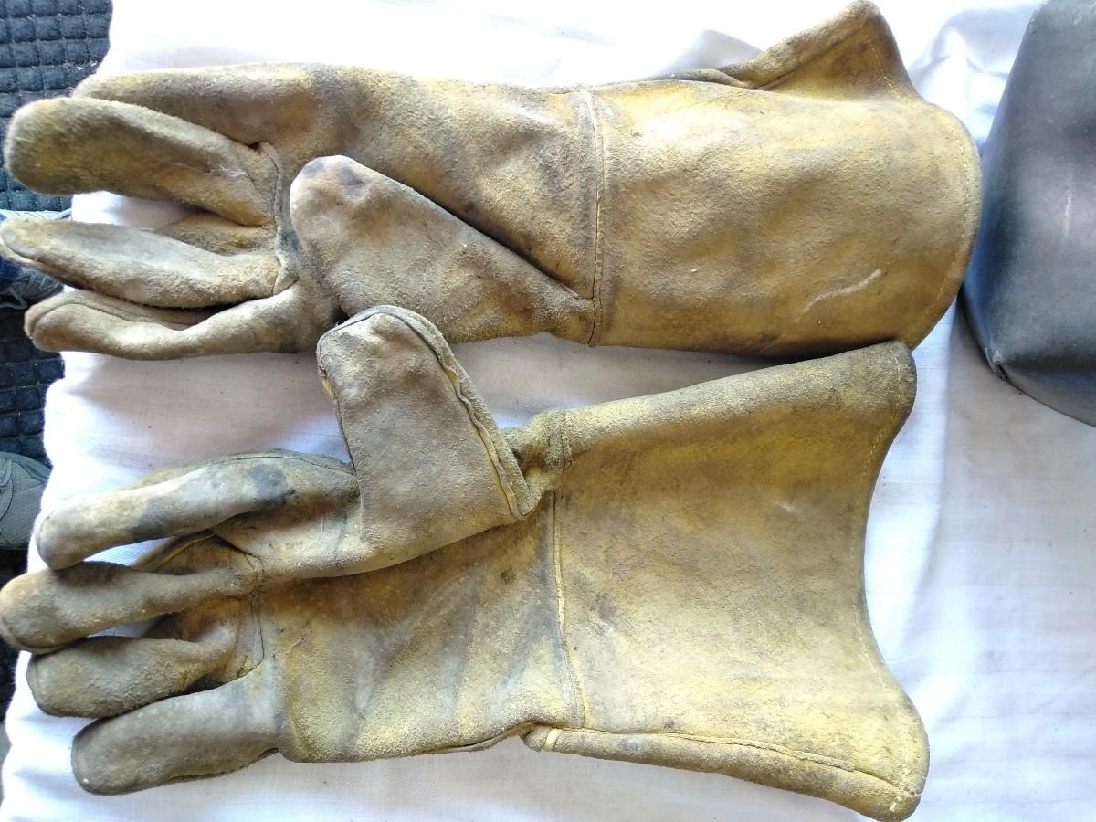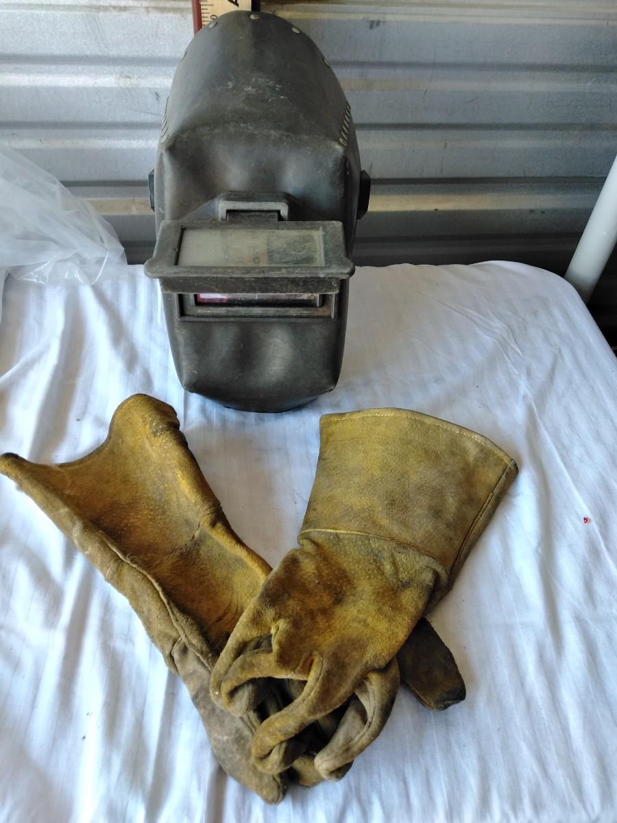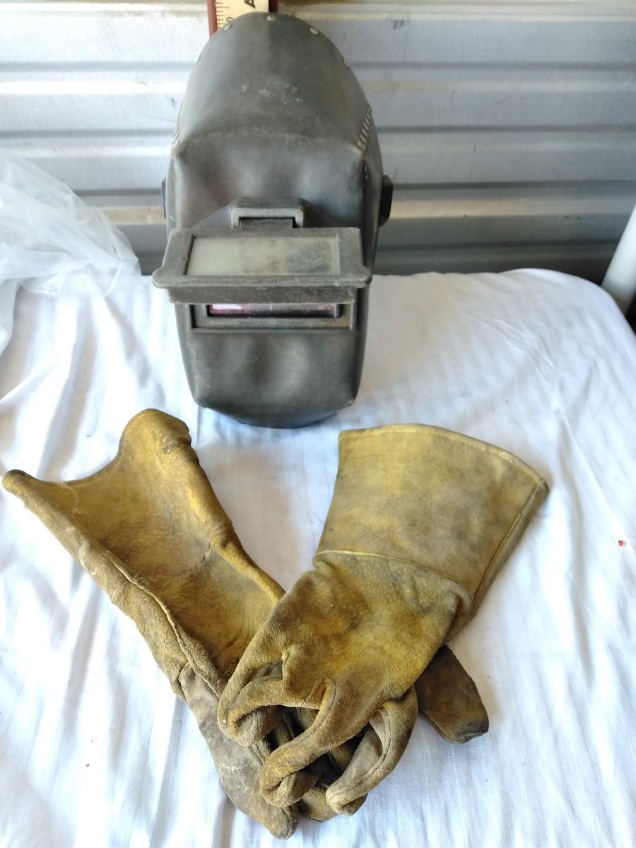 VINTAGE WELDING HOOD AND A PAIR OF LEATHER WELDING GLOVES