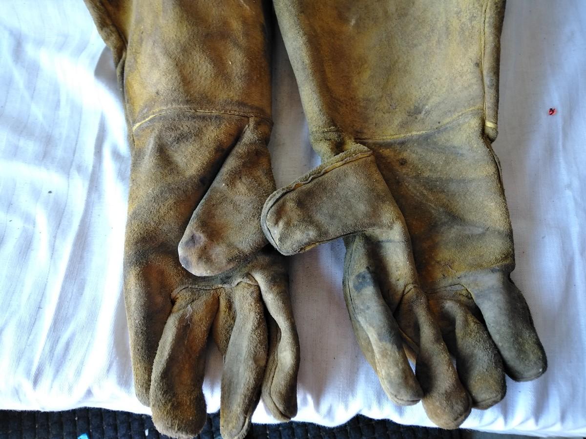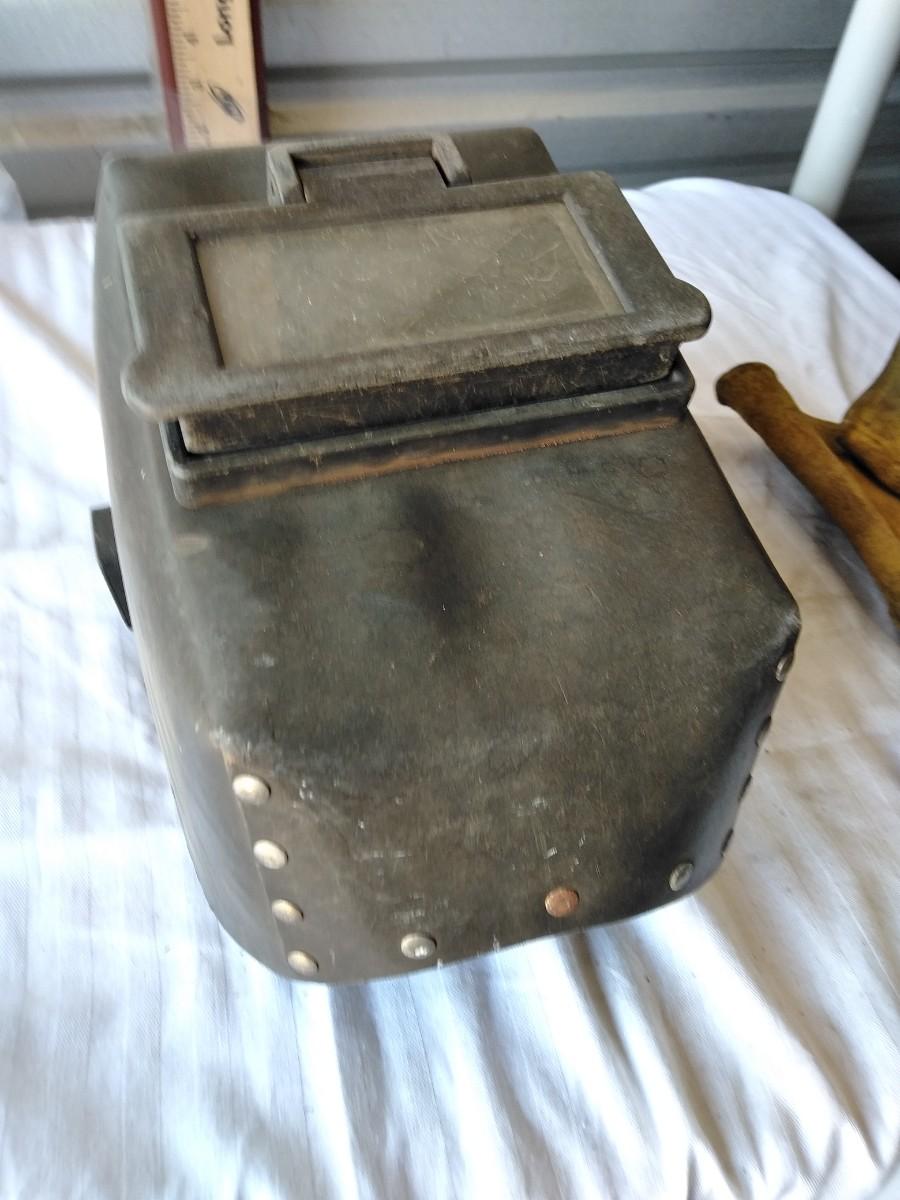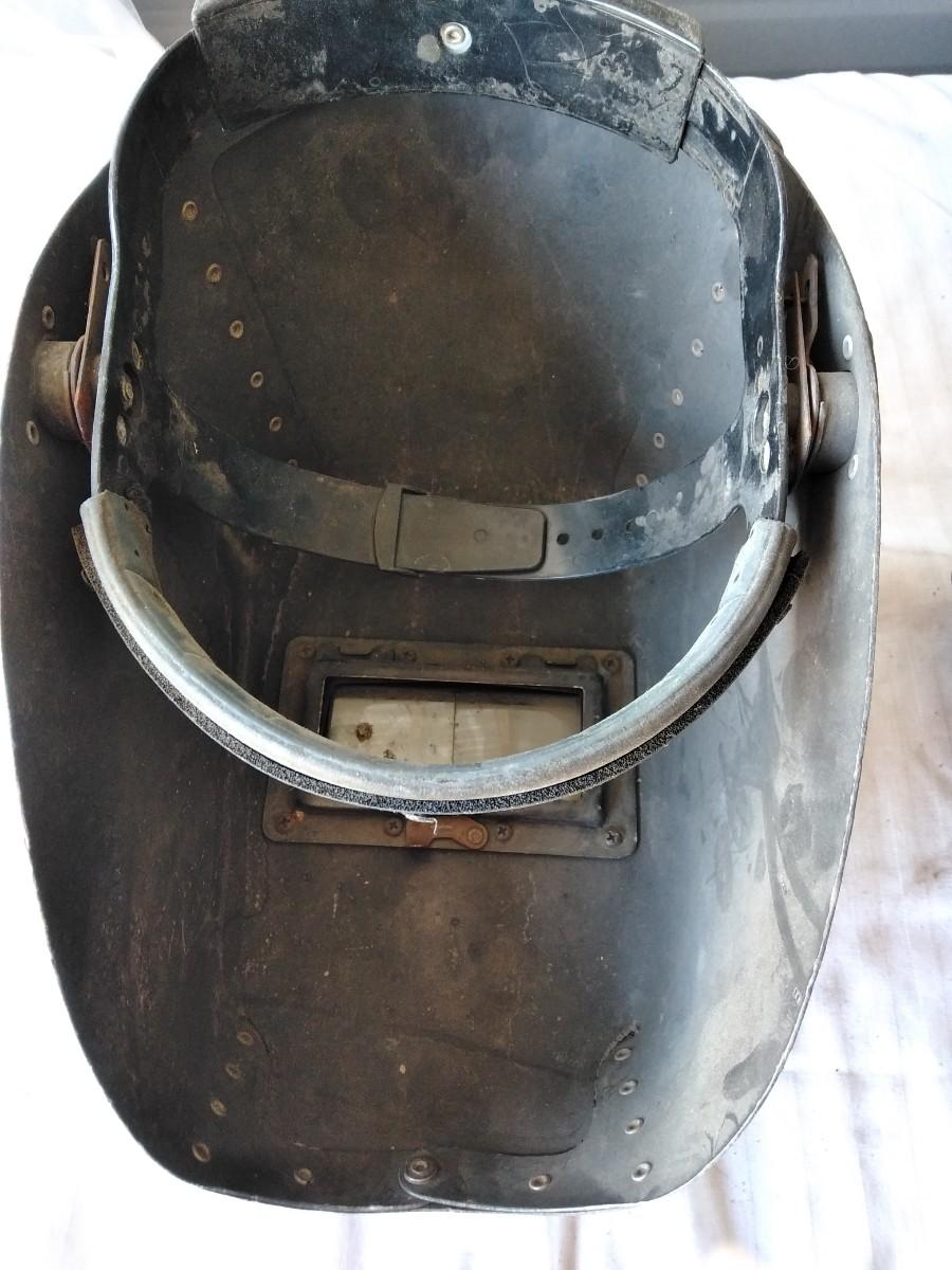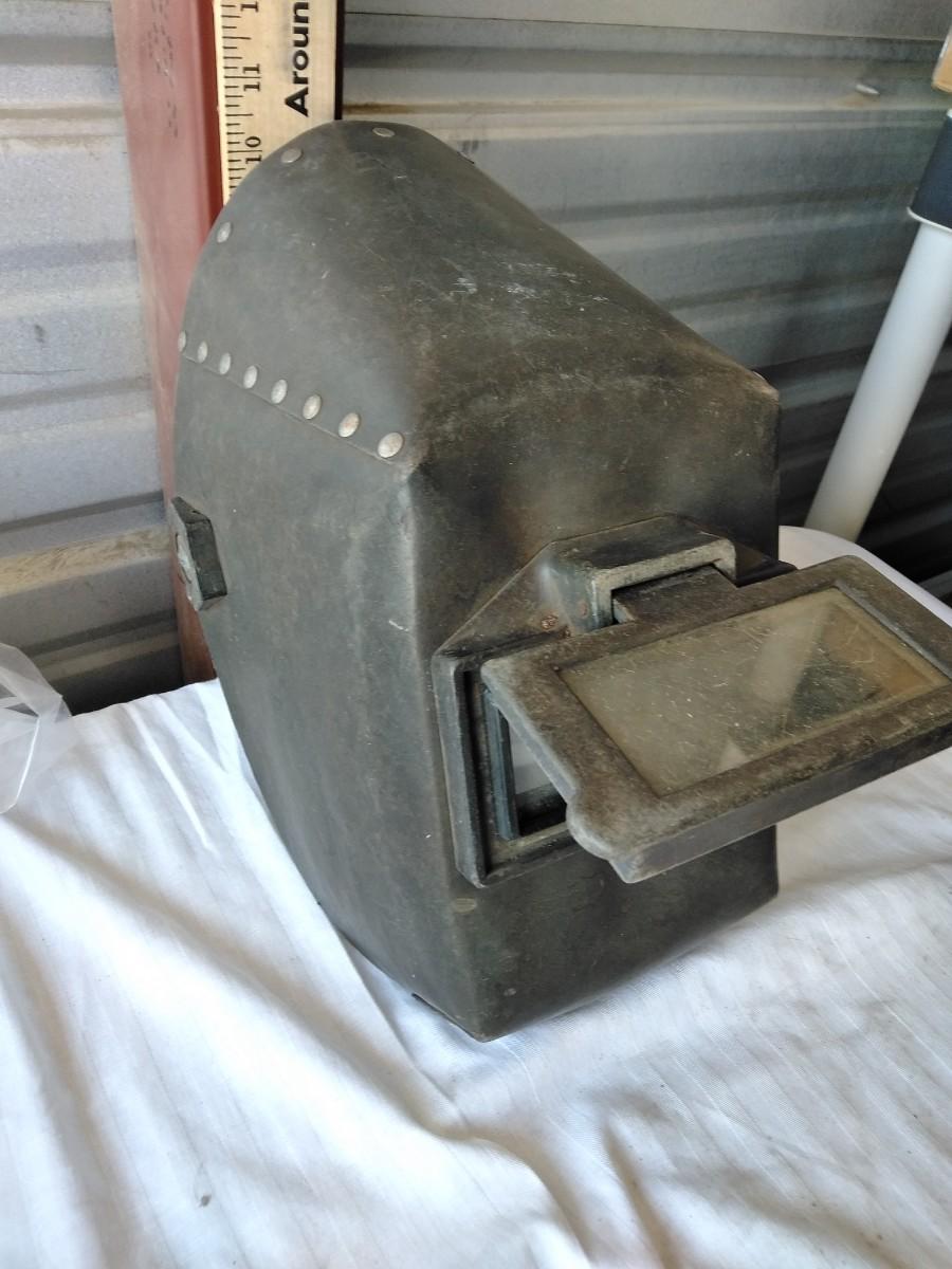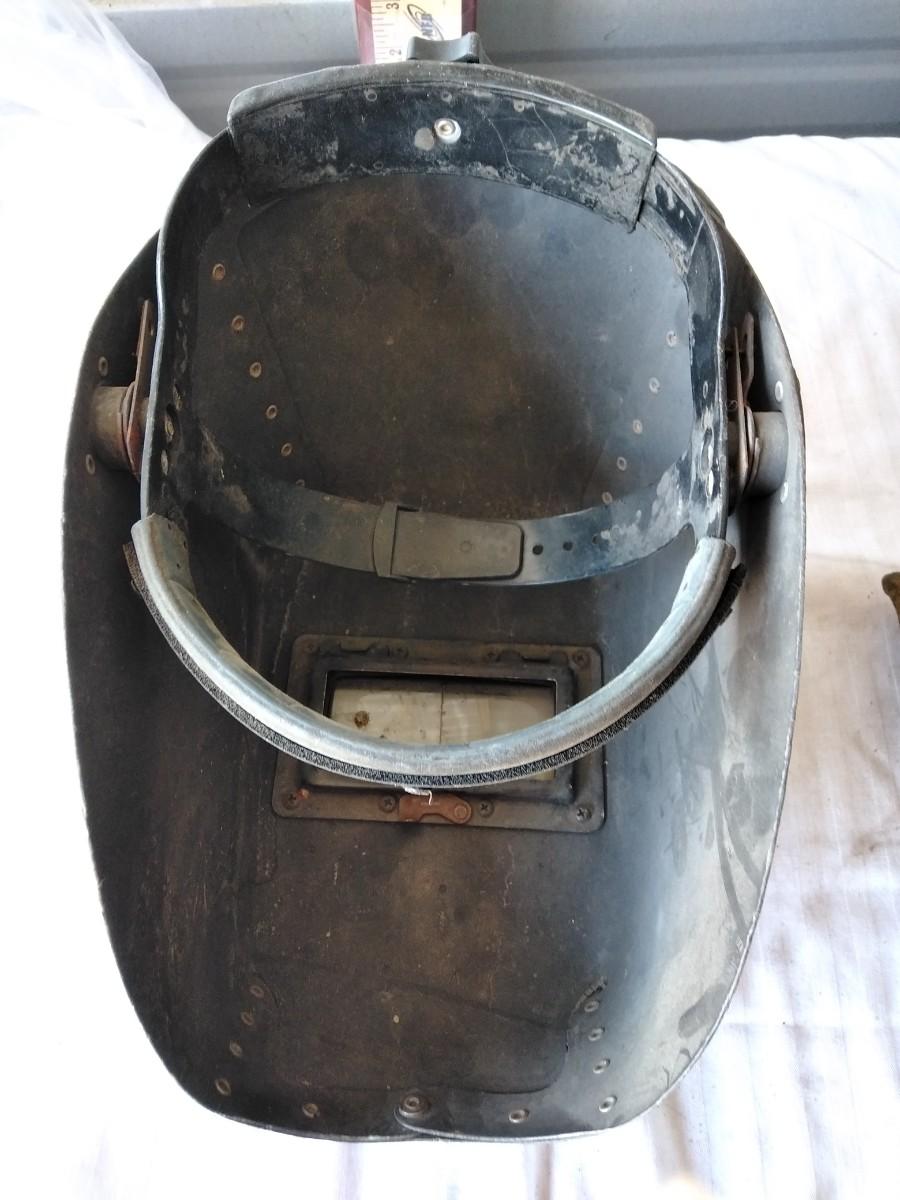 VINTAGE WELDING HOOD AND A PAIR OF LEATHER WELDING GLOVES