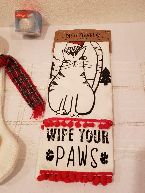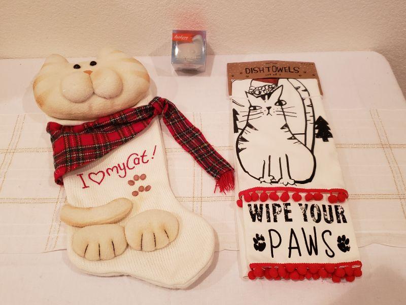 Lot 239: NEW Cat Stocking, Kitchen Towels and Cool Cat Ice Mold