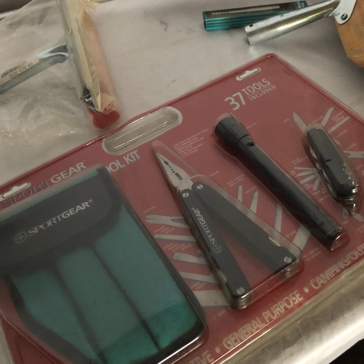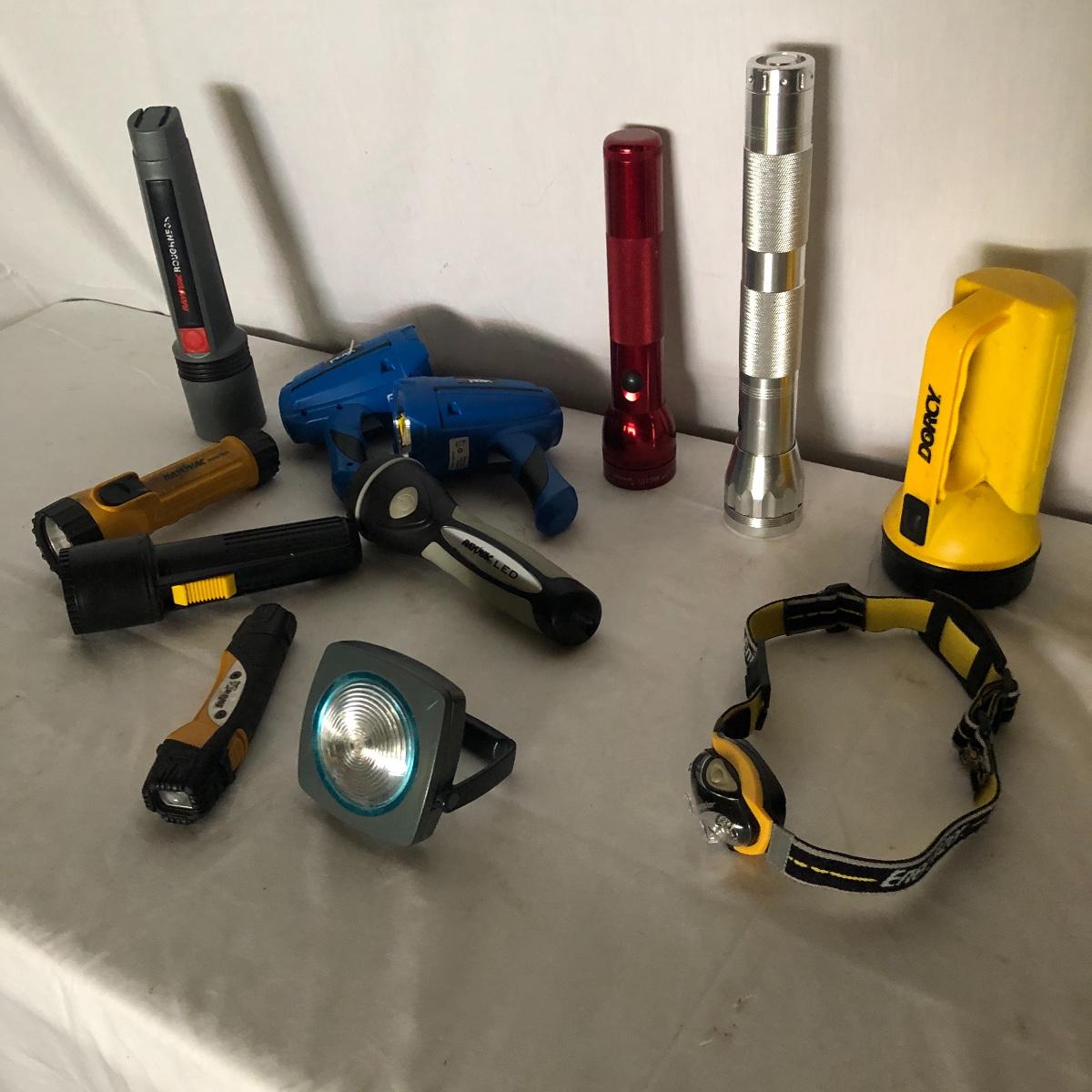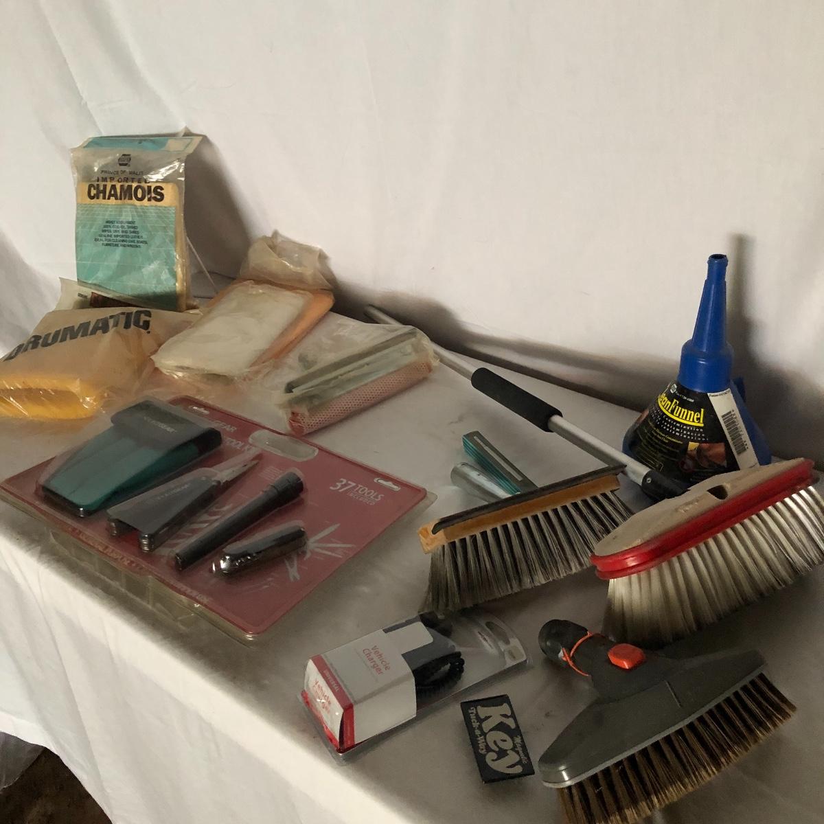 This lot includes car cleaning supplies plus large selection of flashlights! The car supplies are the following: chamois, wash clothes, a sponge, a multi-purpose tool kit-still in the box, brushes, tire gauge and more! There are also eleven flashlights and one headlamp. Not all flashlights have been tested. Local pick up only.