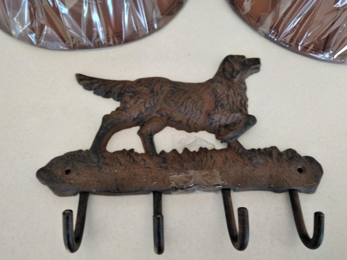 LOT 239 CAST IRON DOG WALL HOOK & TWO NEW BUFFET LAMP SHADES