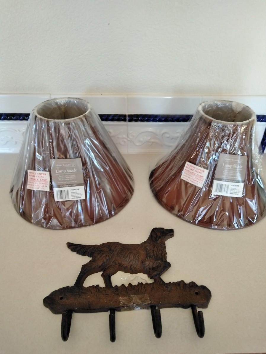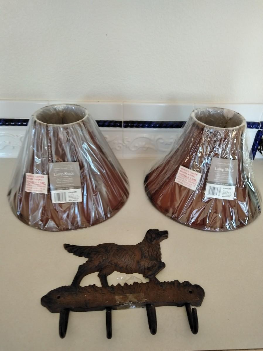 CAST IRON DOG WALL HOOK & TWO NEW LAMP SHADES 12" X 9"