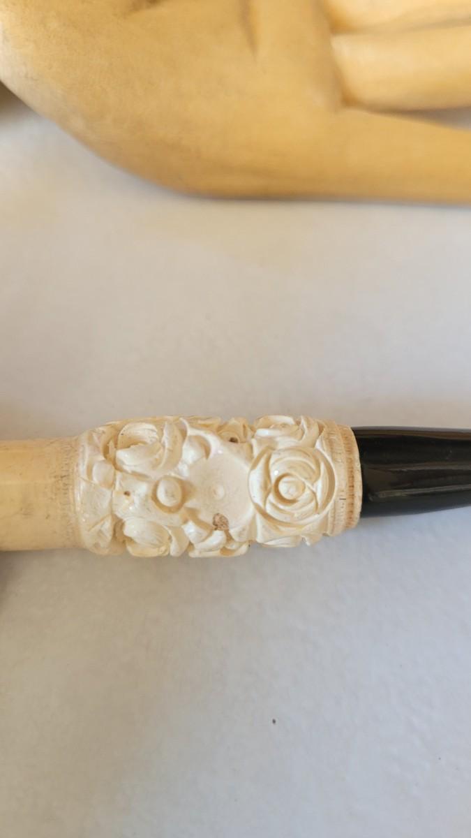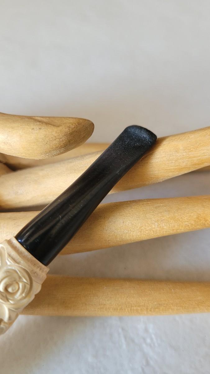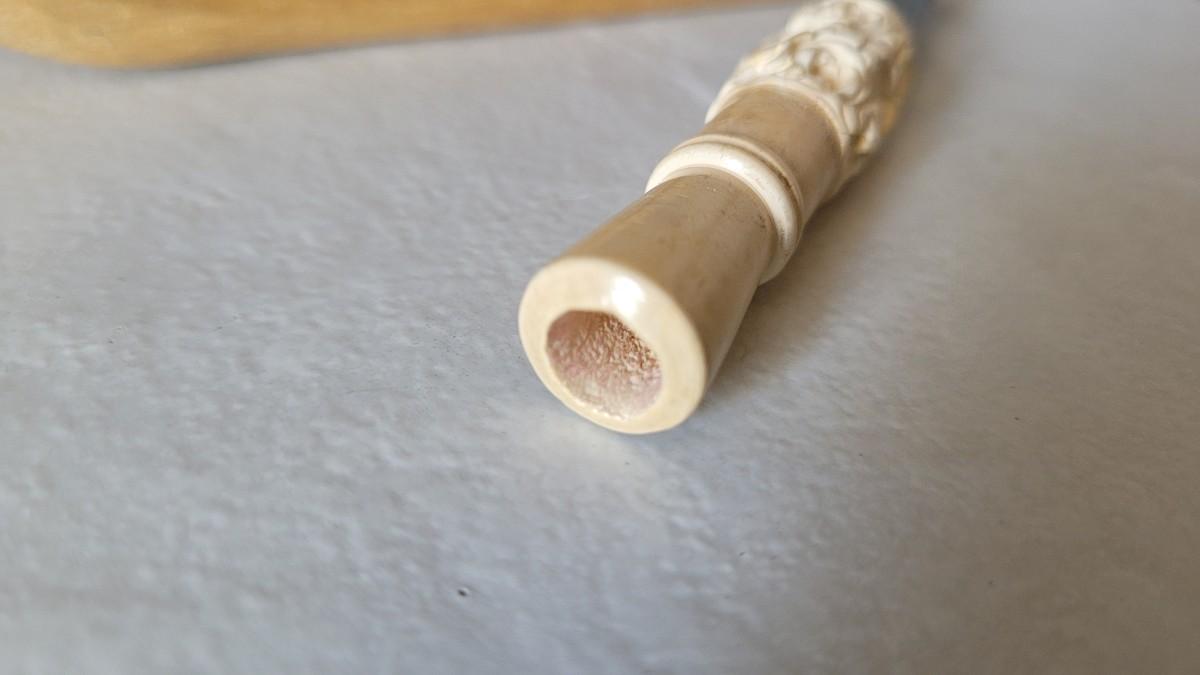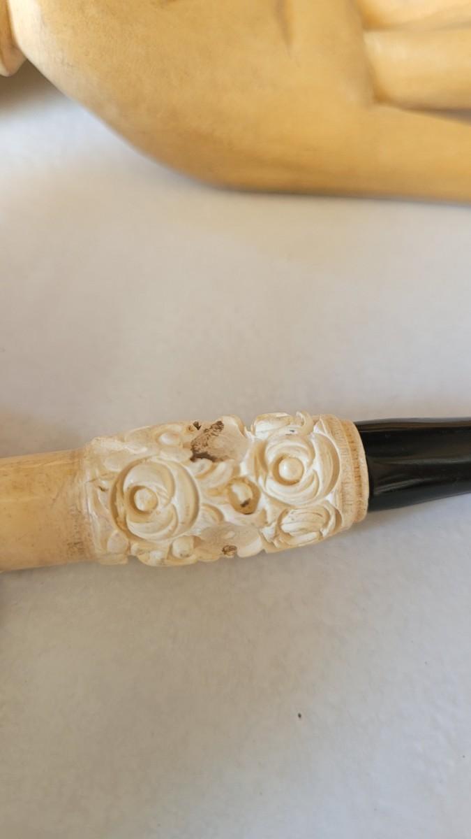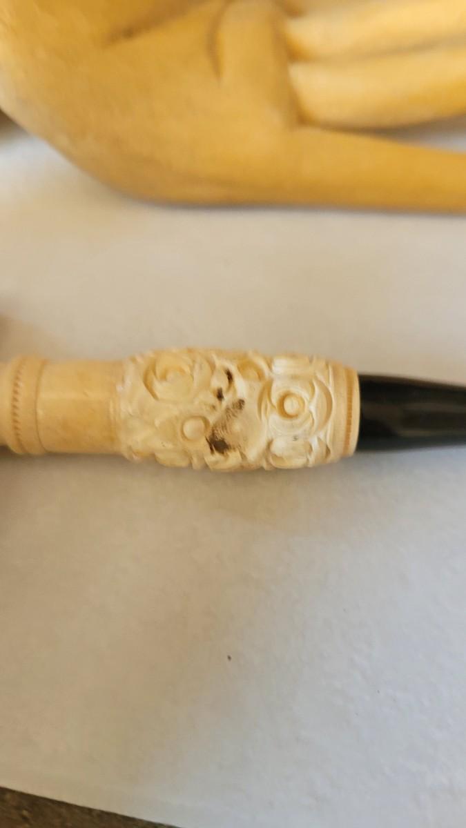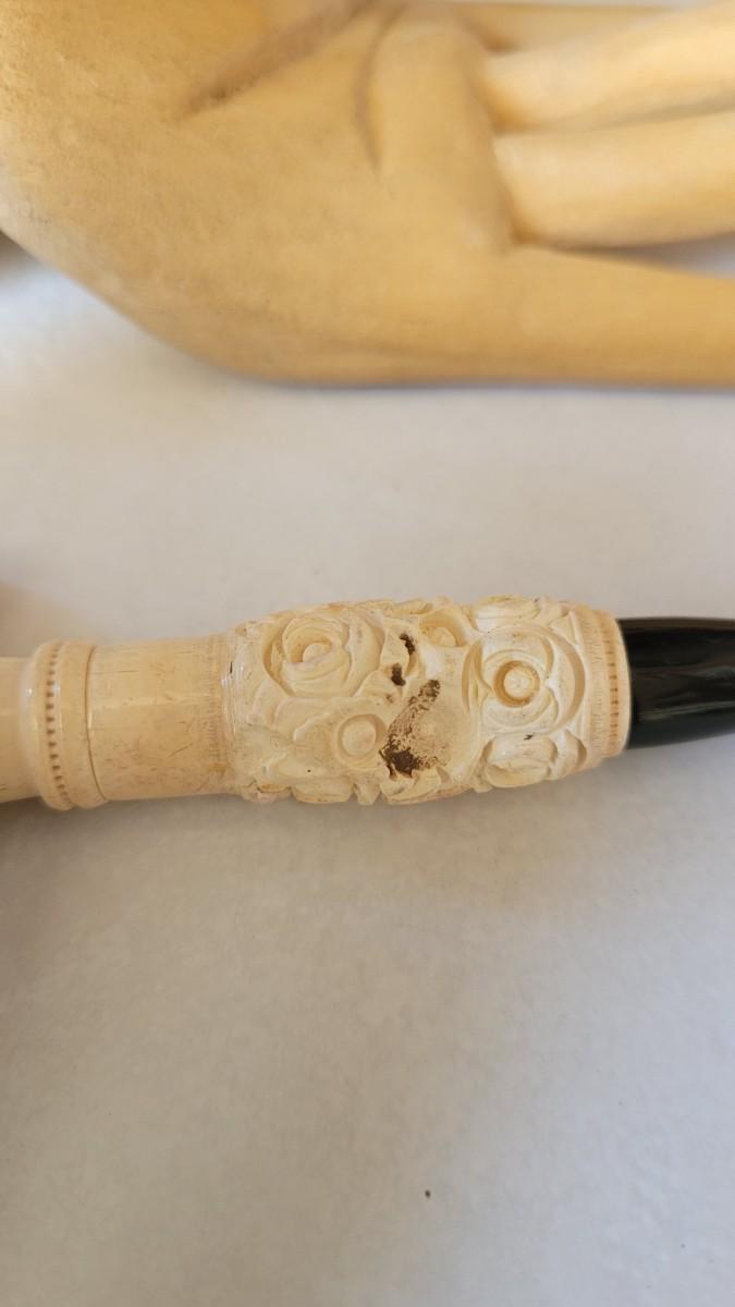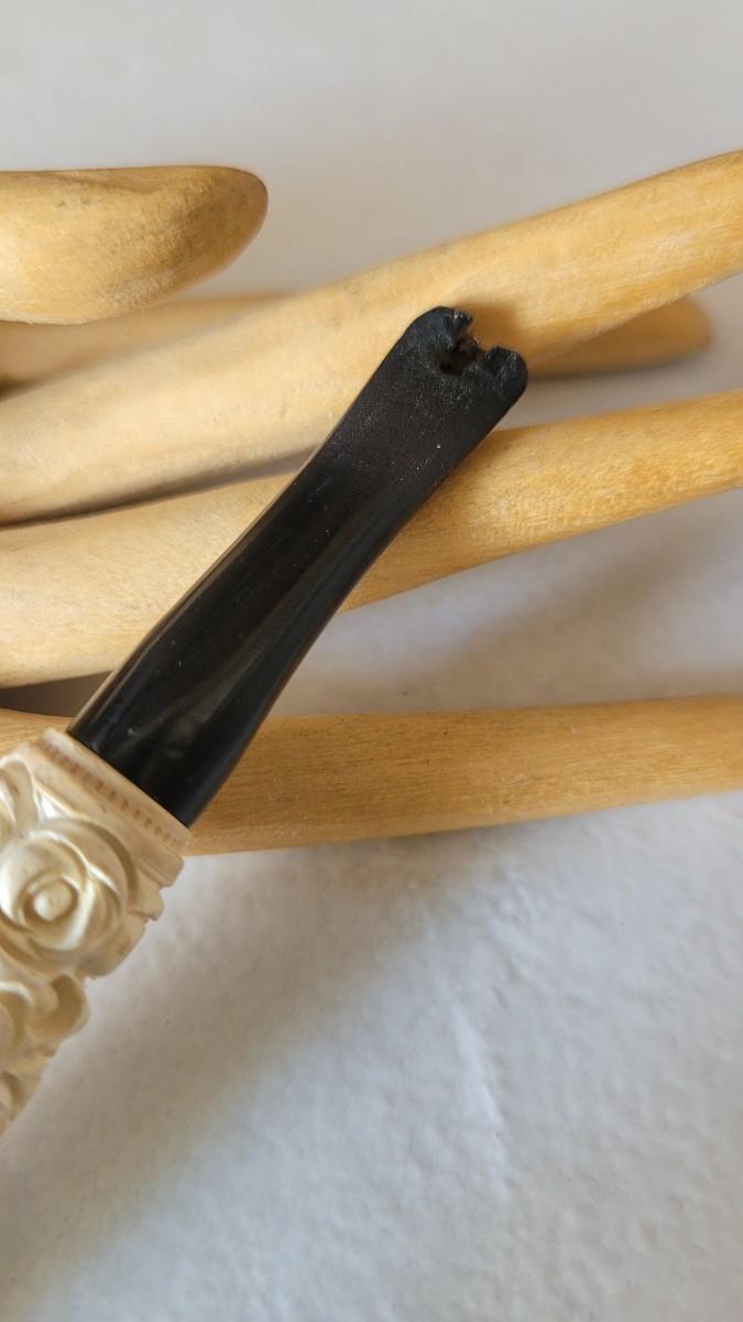 Has some round spots around the carving. The mouth piece is chipped on one side.