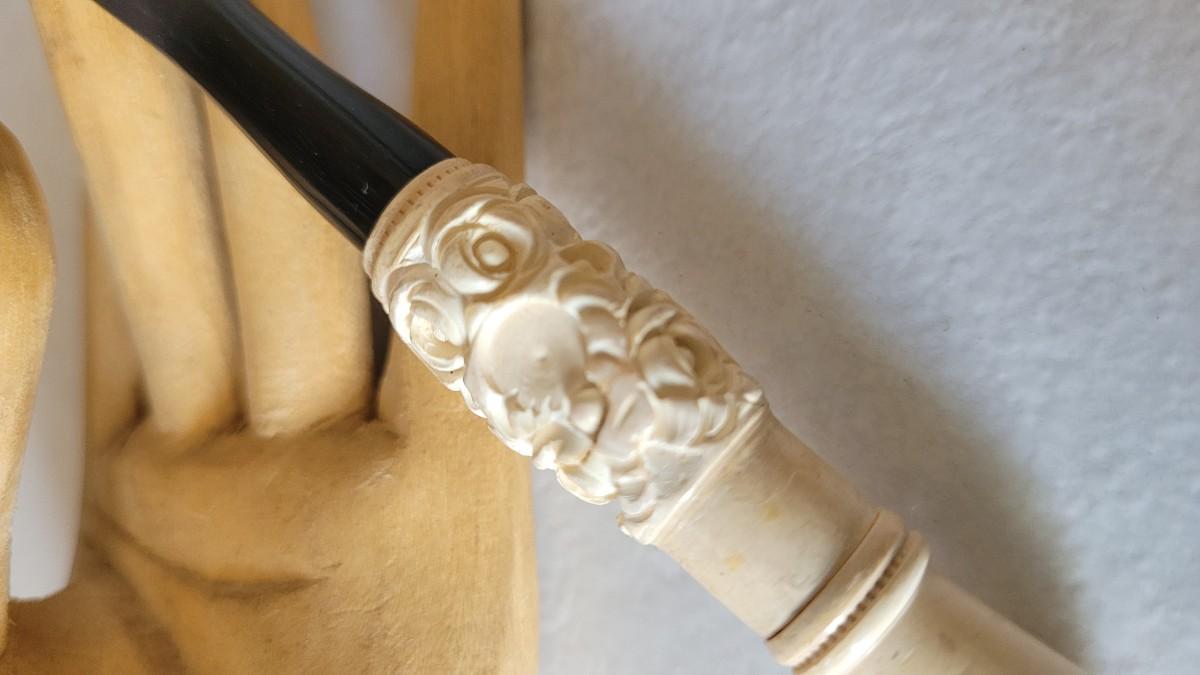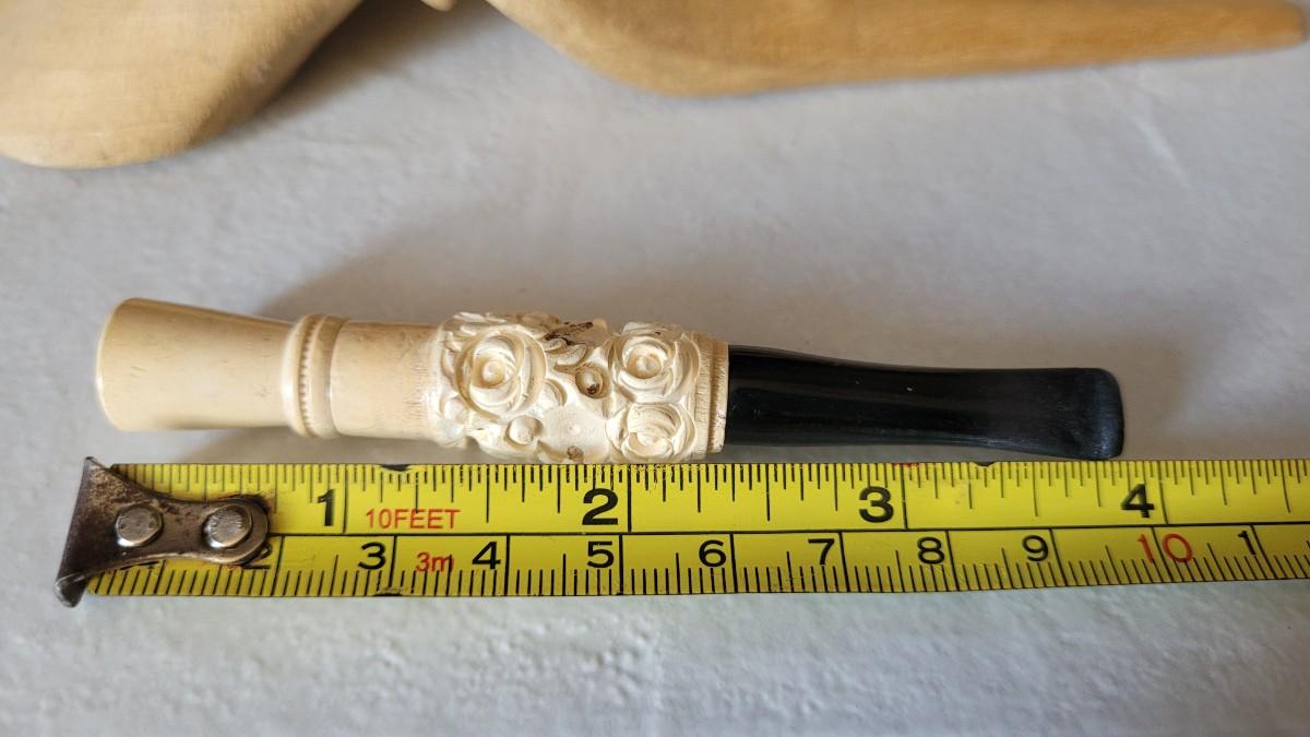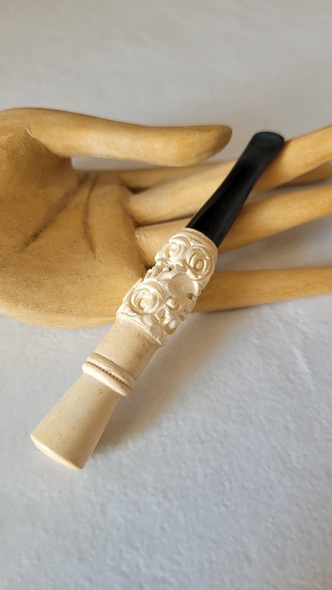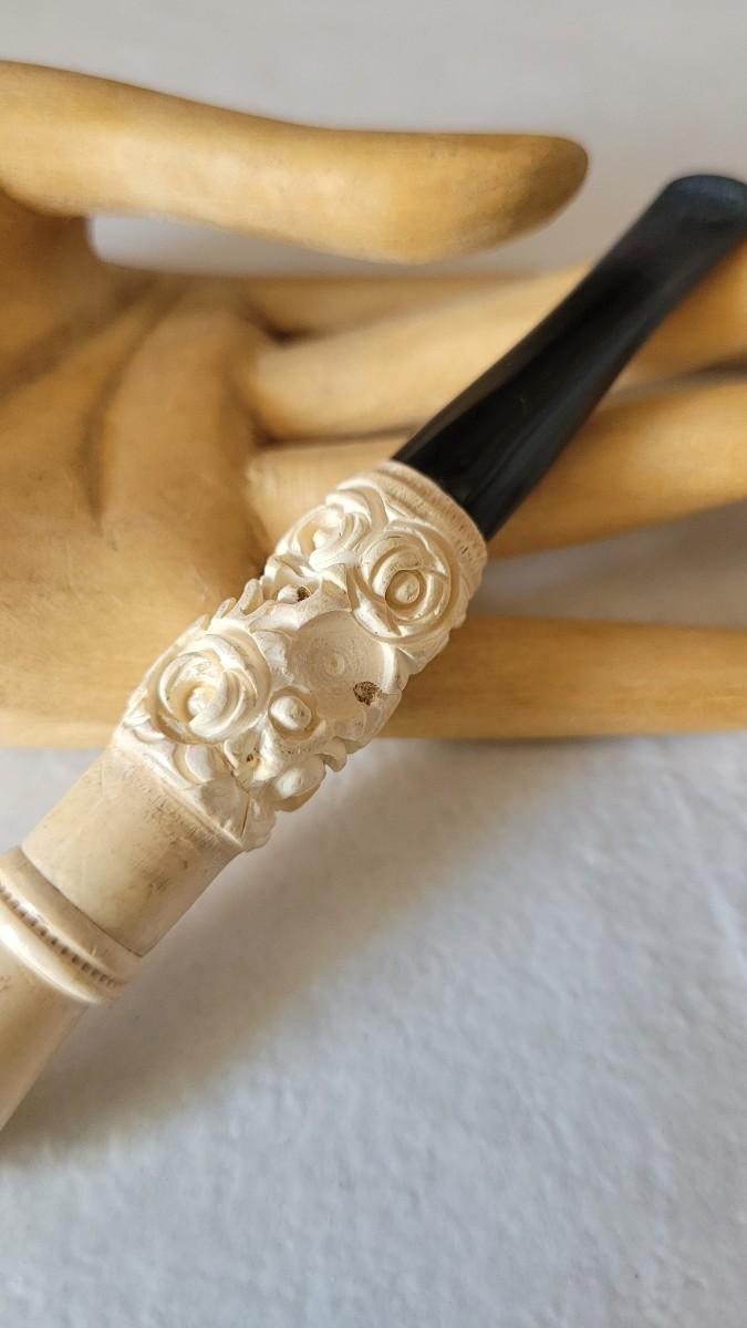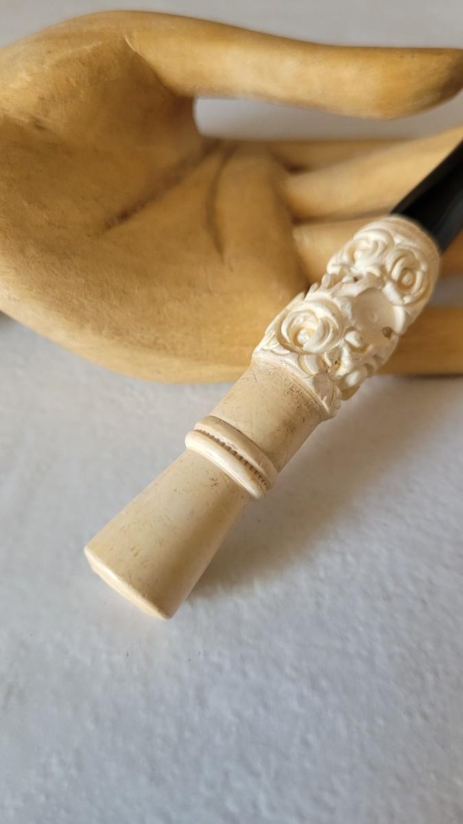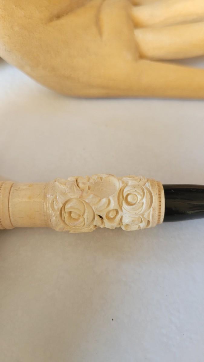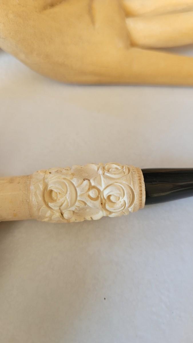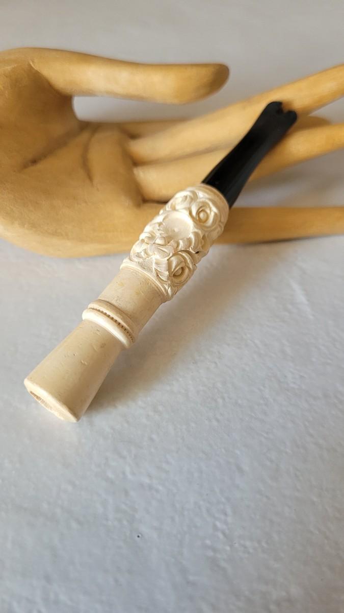 Has some round spots around the carving. The mouth piece is chipped on one side.