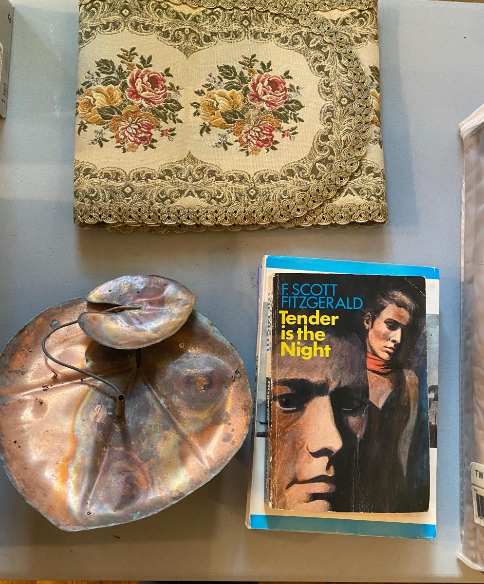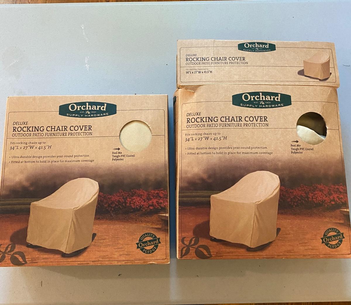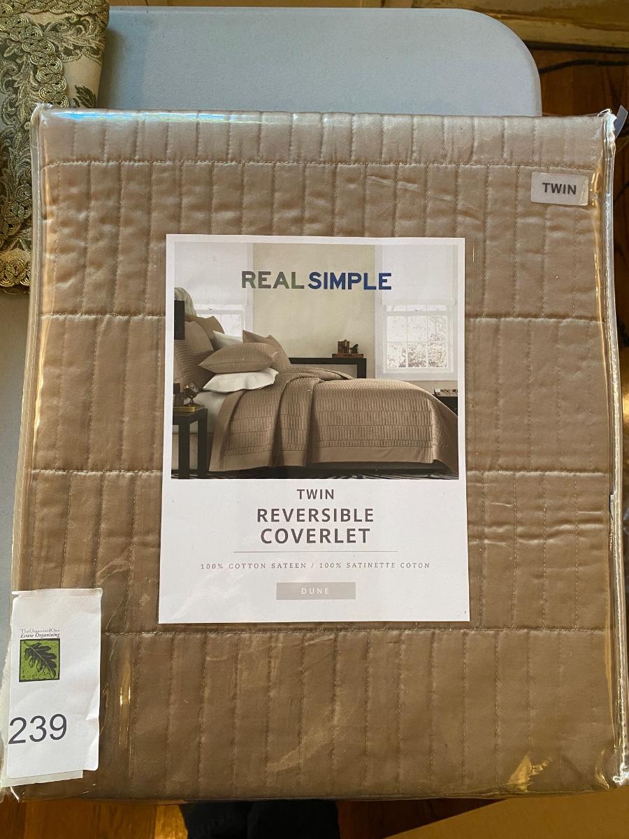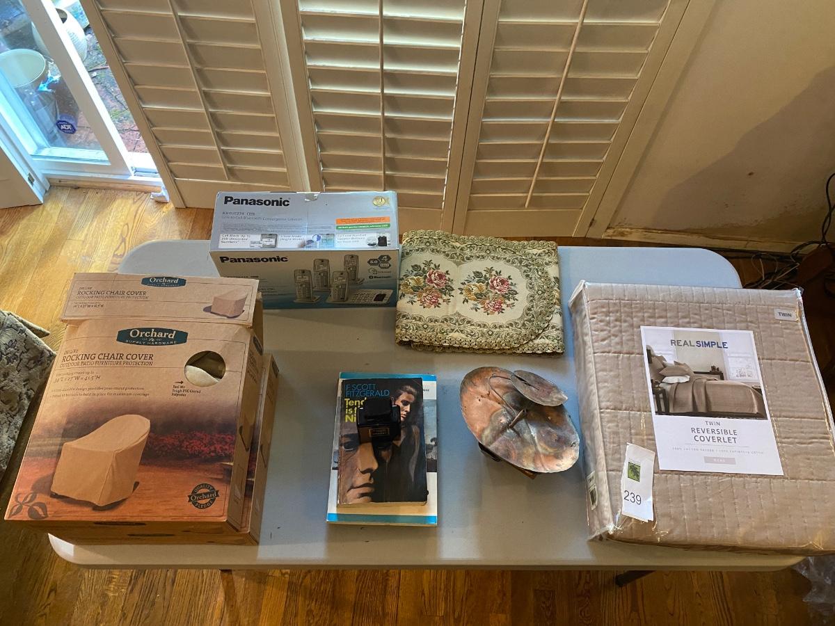Coco Chanel noir, 34 fl oz, 3/4th full., outdoor chair covers NIB, twin coverlet NIB, Panasonic Phone system untested, and more