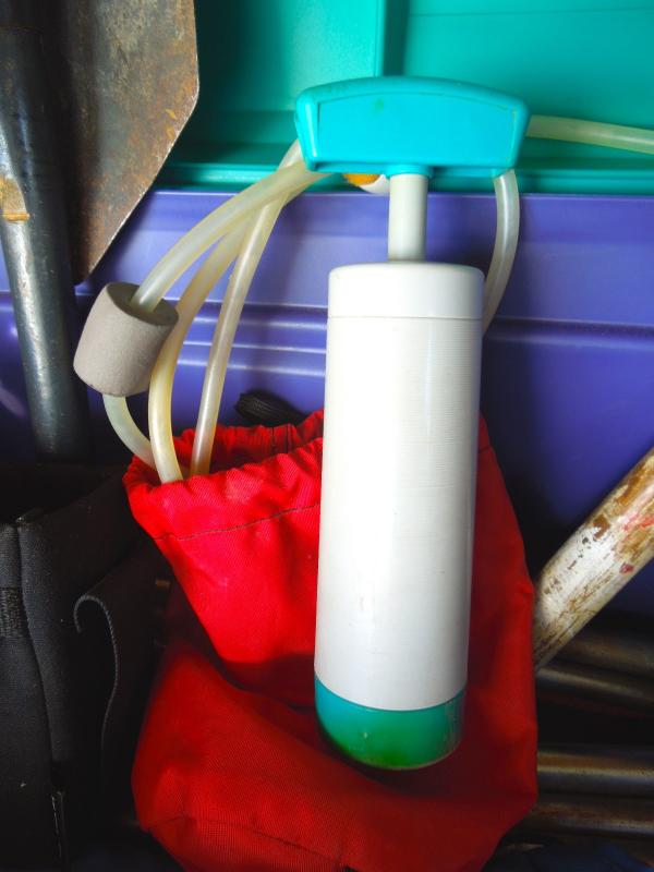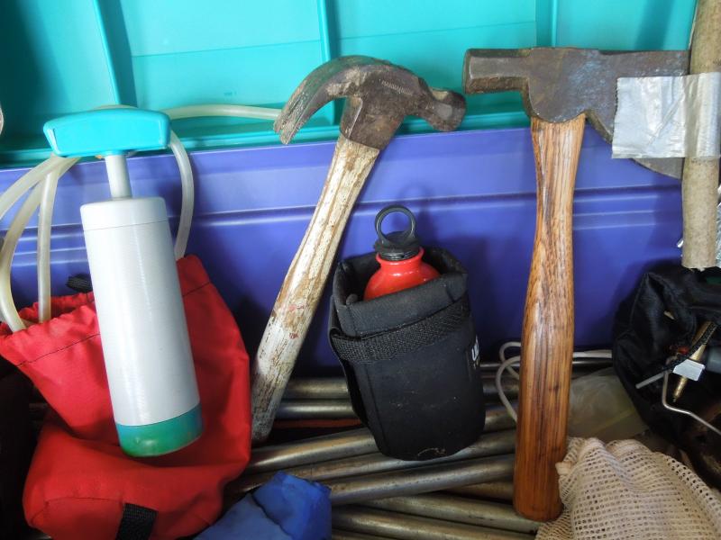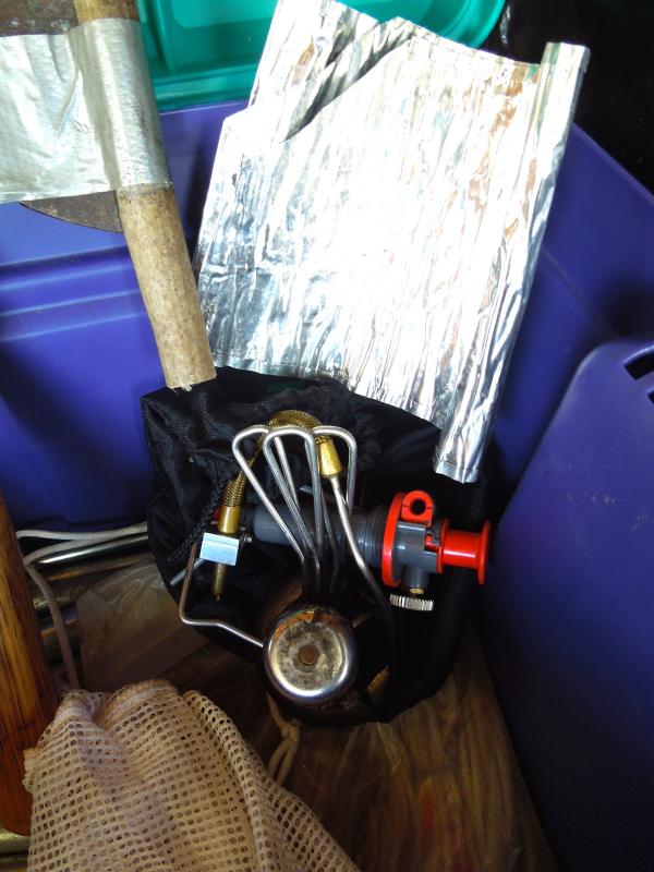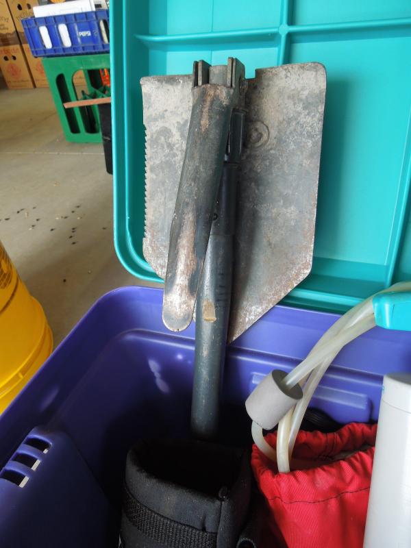 Tent fly; stakes; water purifying system; folding shovel; hammer; axe; back packing cook stove; fuel bottle; storage sacks. Includes hard plastic storage bin.