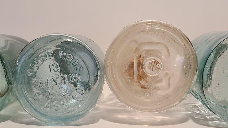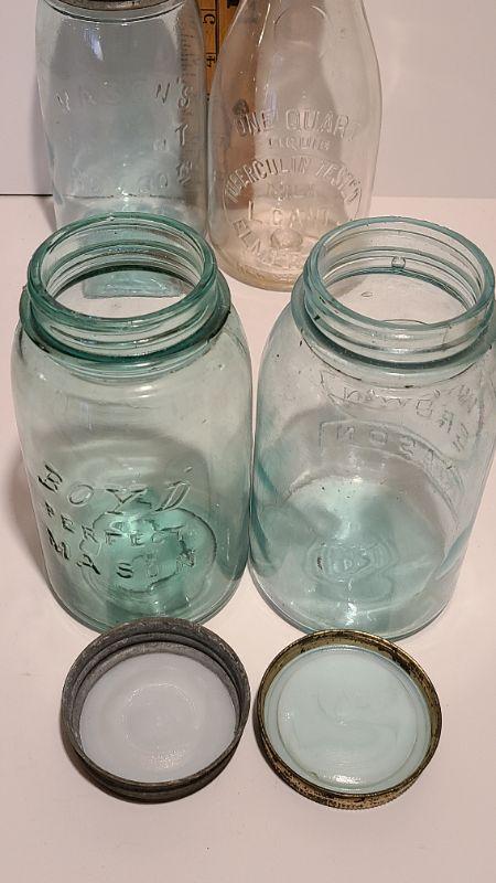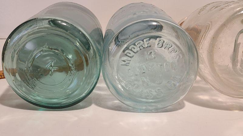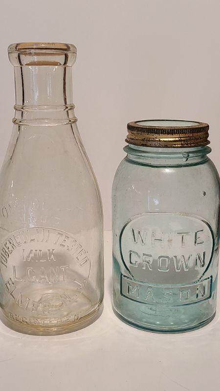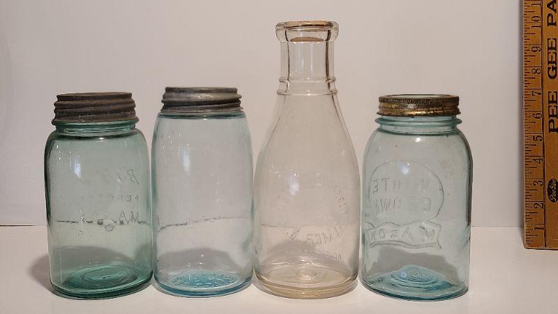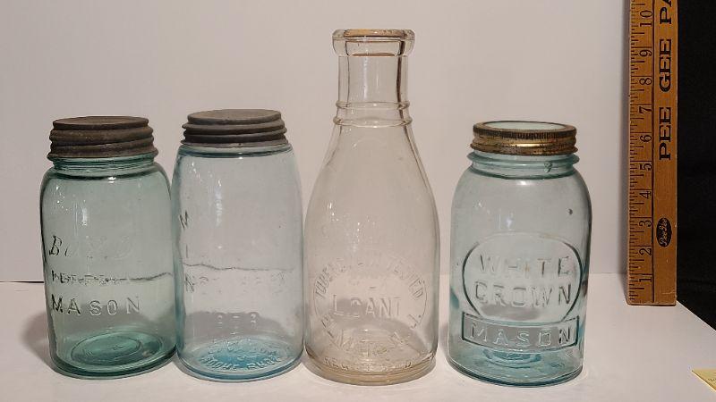 Lot 239: Antique Milk Bottles/Jars ( Gant Dairy Elmer, Moore Bros Mason, White Crown, and Boyd Mason)