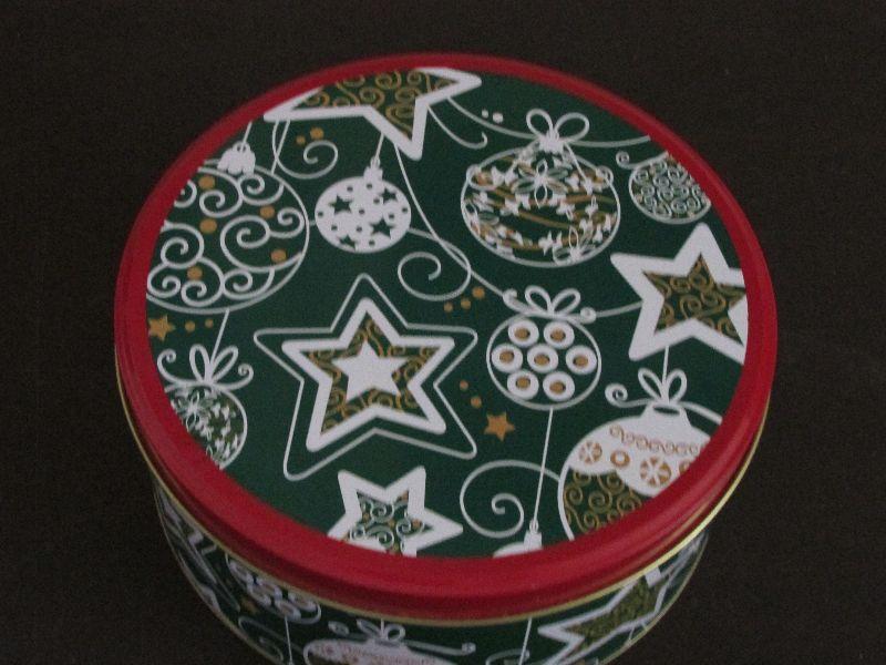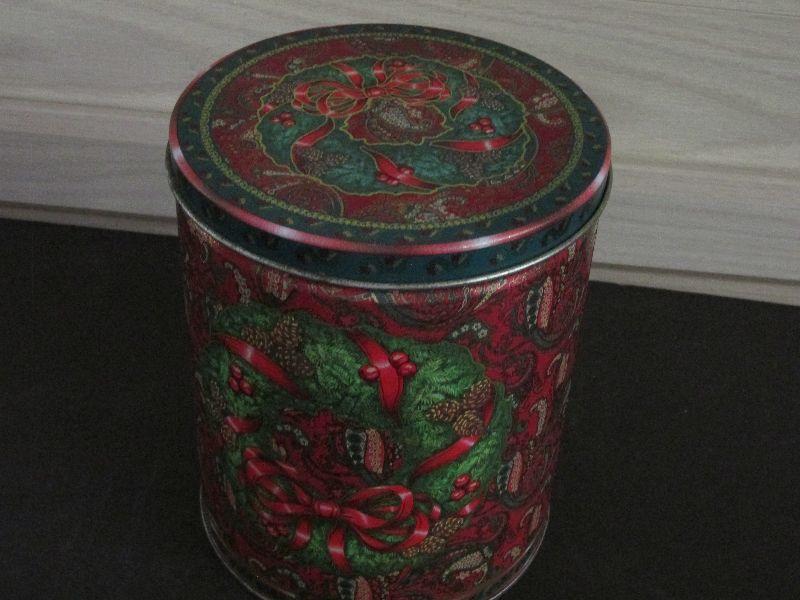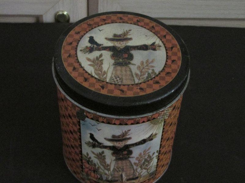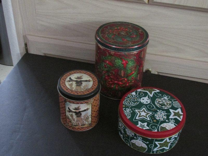 Two Christmas themed tins, one very large cylinder. One fall themed cylinder tin.