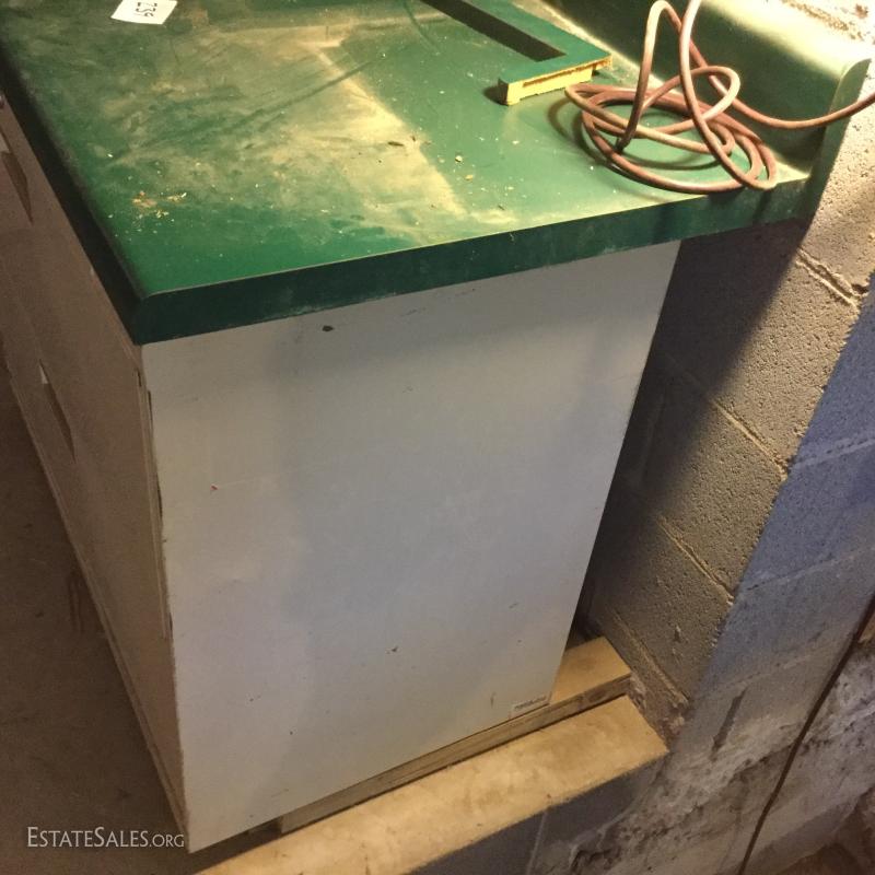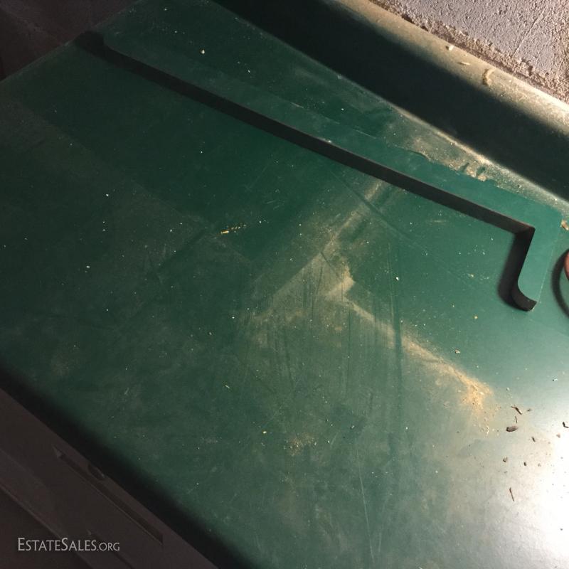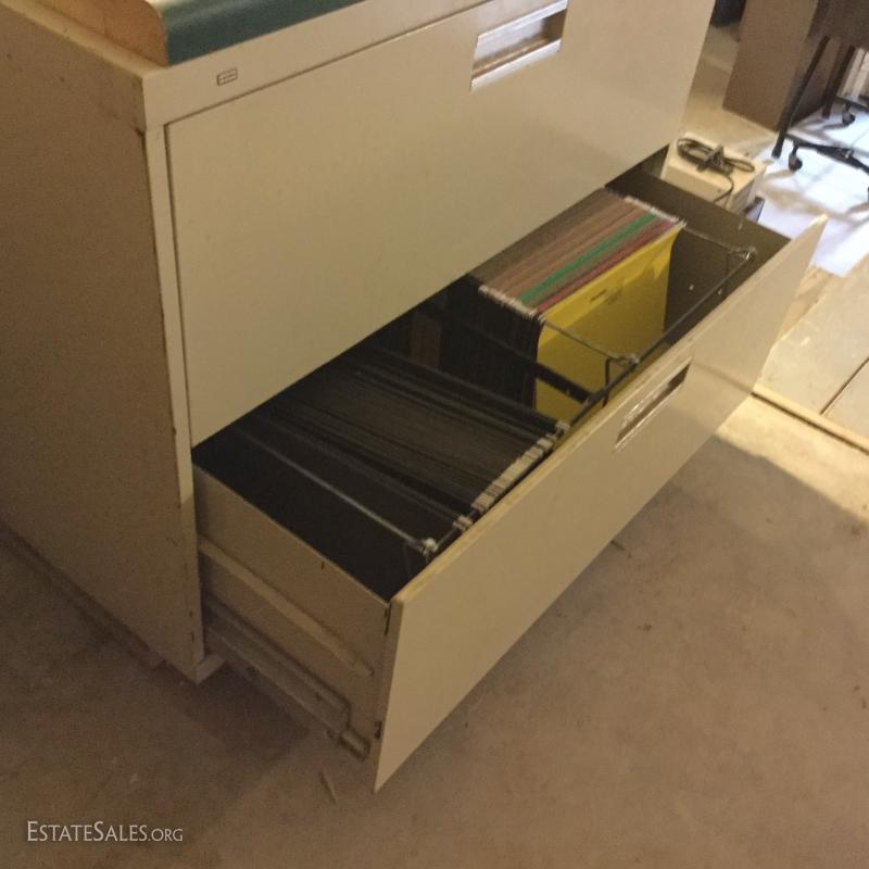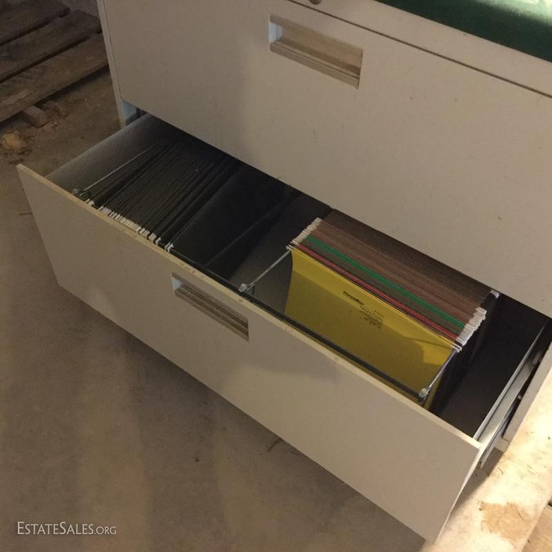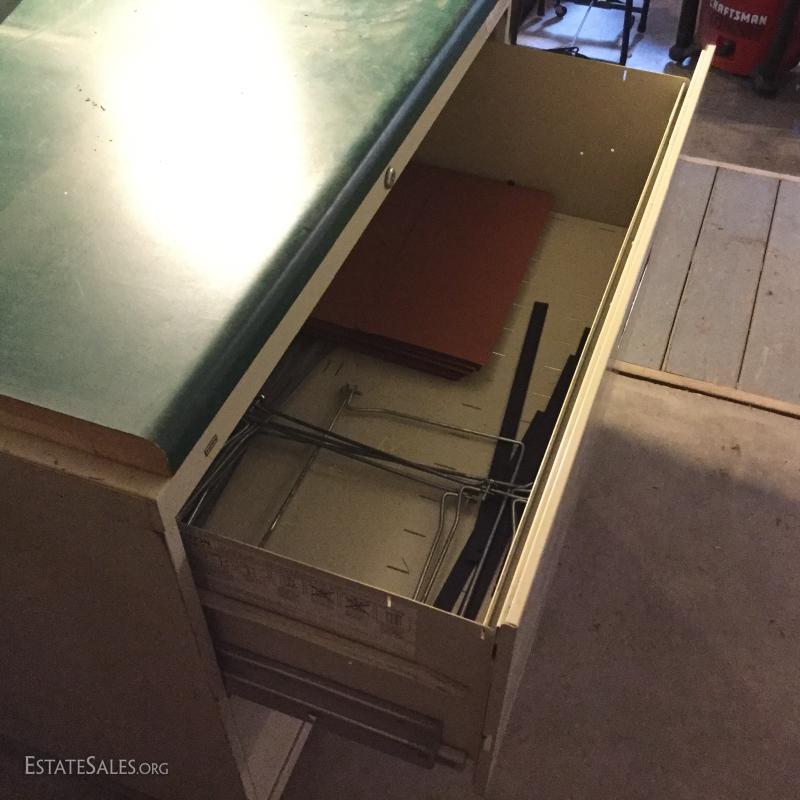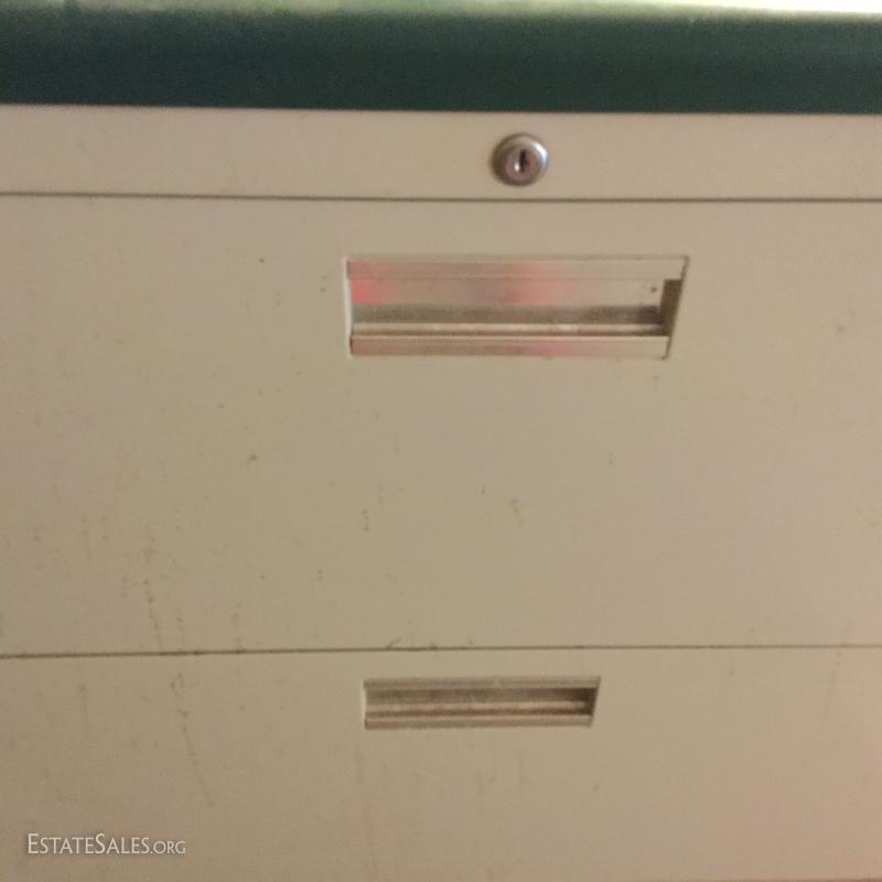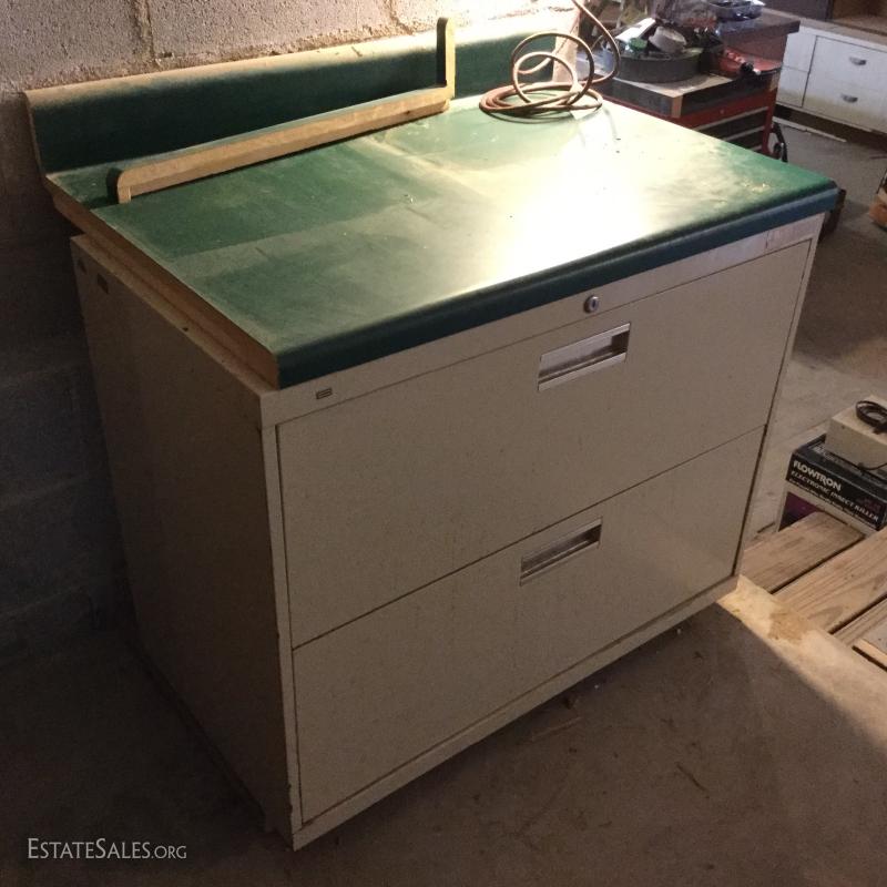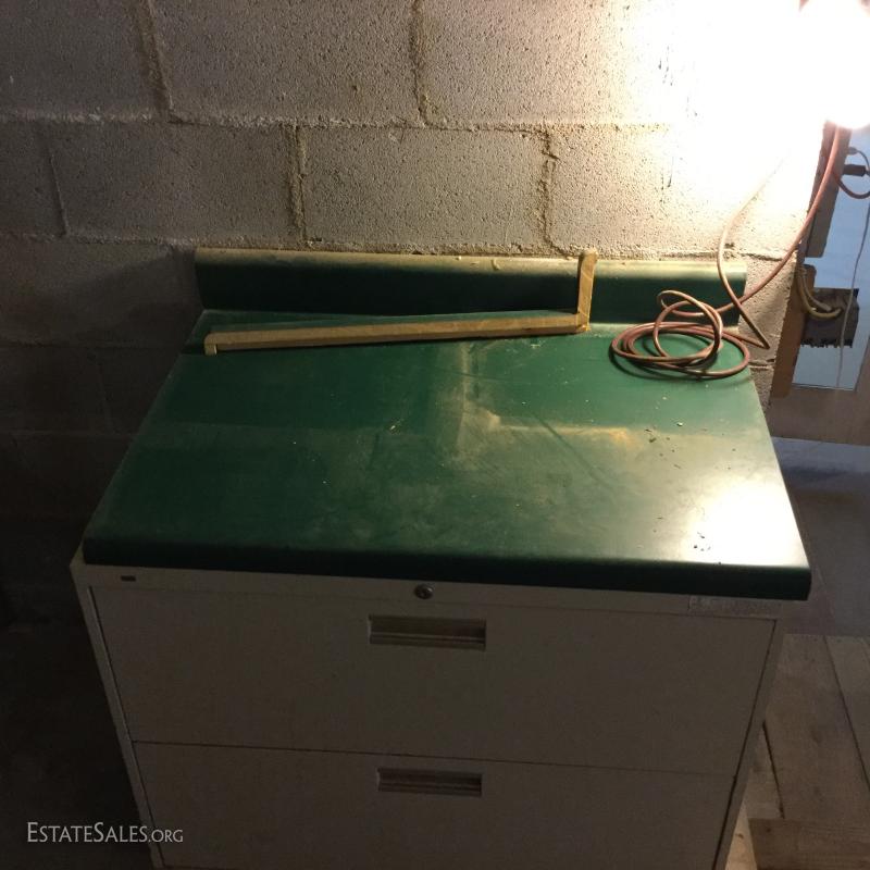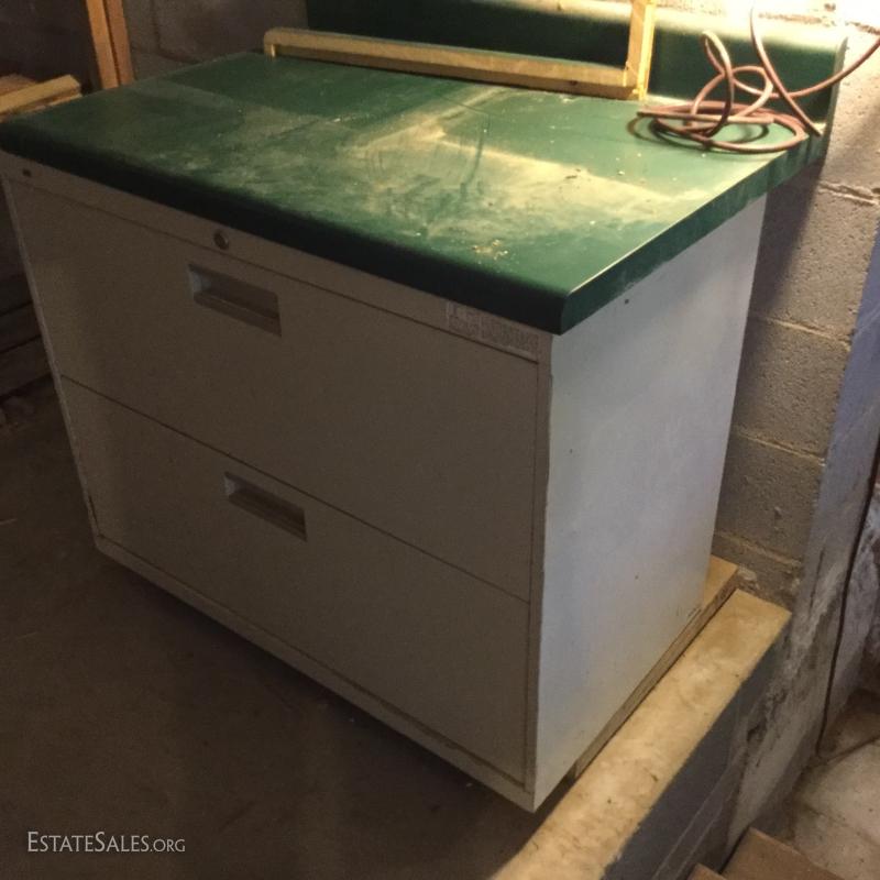 2-drawer horizontal file cabinet measuring 36"l x19"w x28"h. Has a lock but no key. A few file folders and racks. Table top is 36"l x 25"w. Green top. This lot is available for local pick up in Hendersonville, NC.