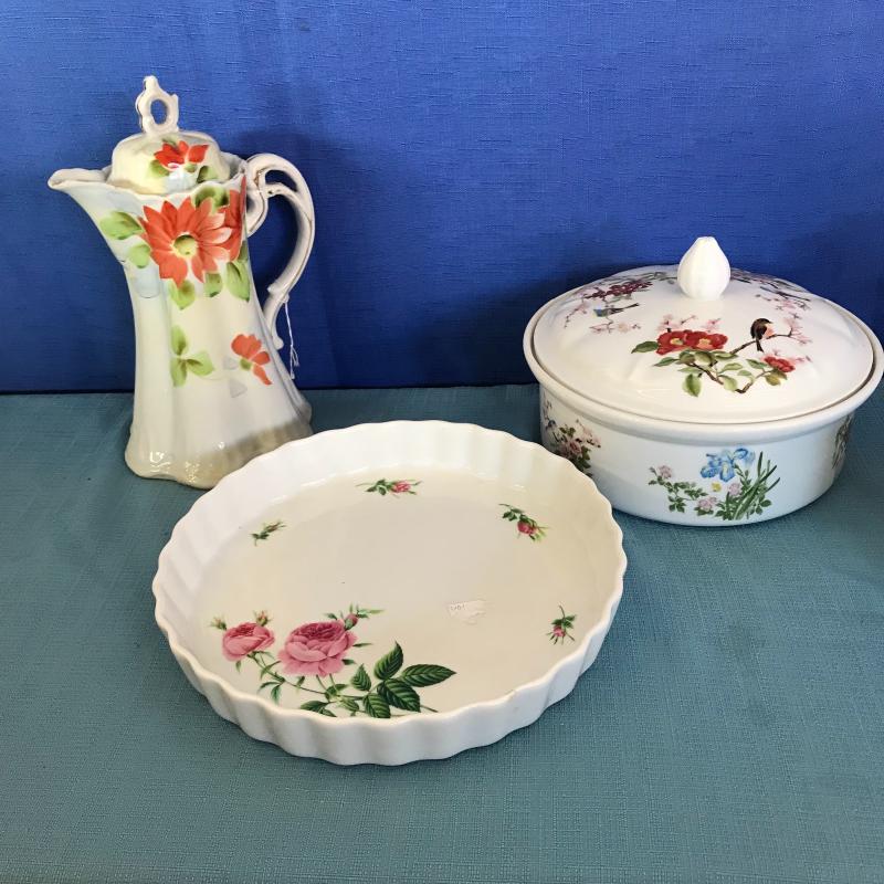 Lot includes pie plate, teapot, and lidded serving dish. No shipping available. Shipping or local pickup in Maggie Valley, NC.
