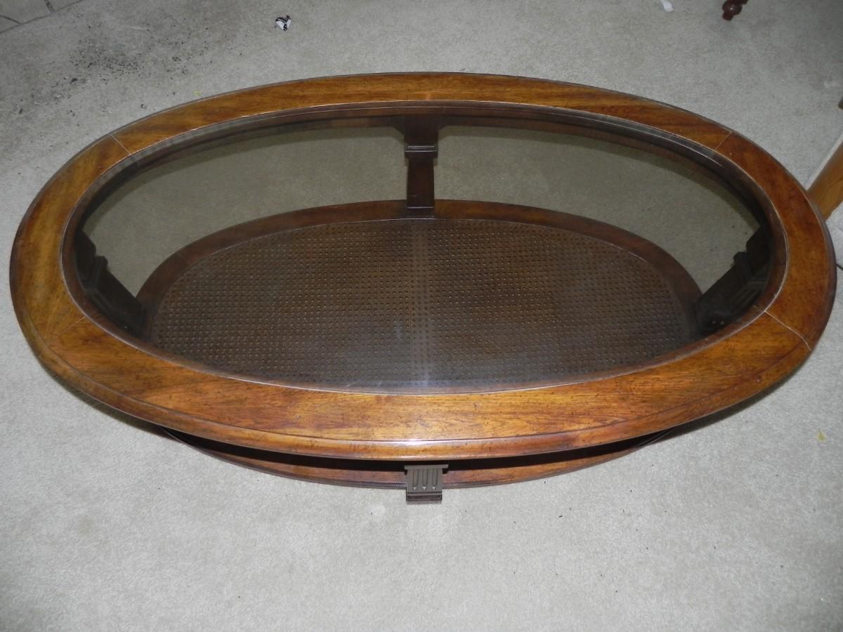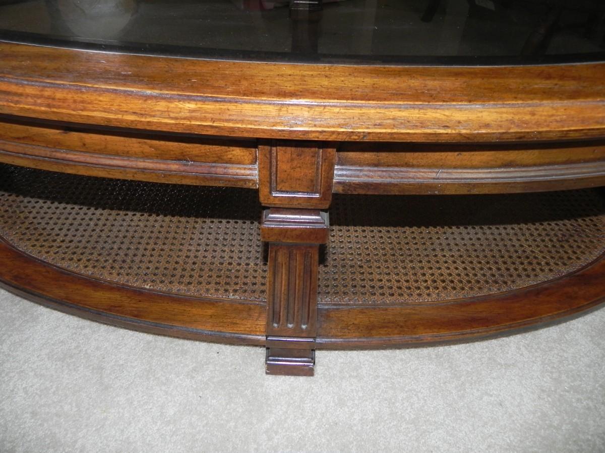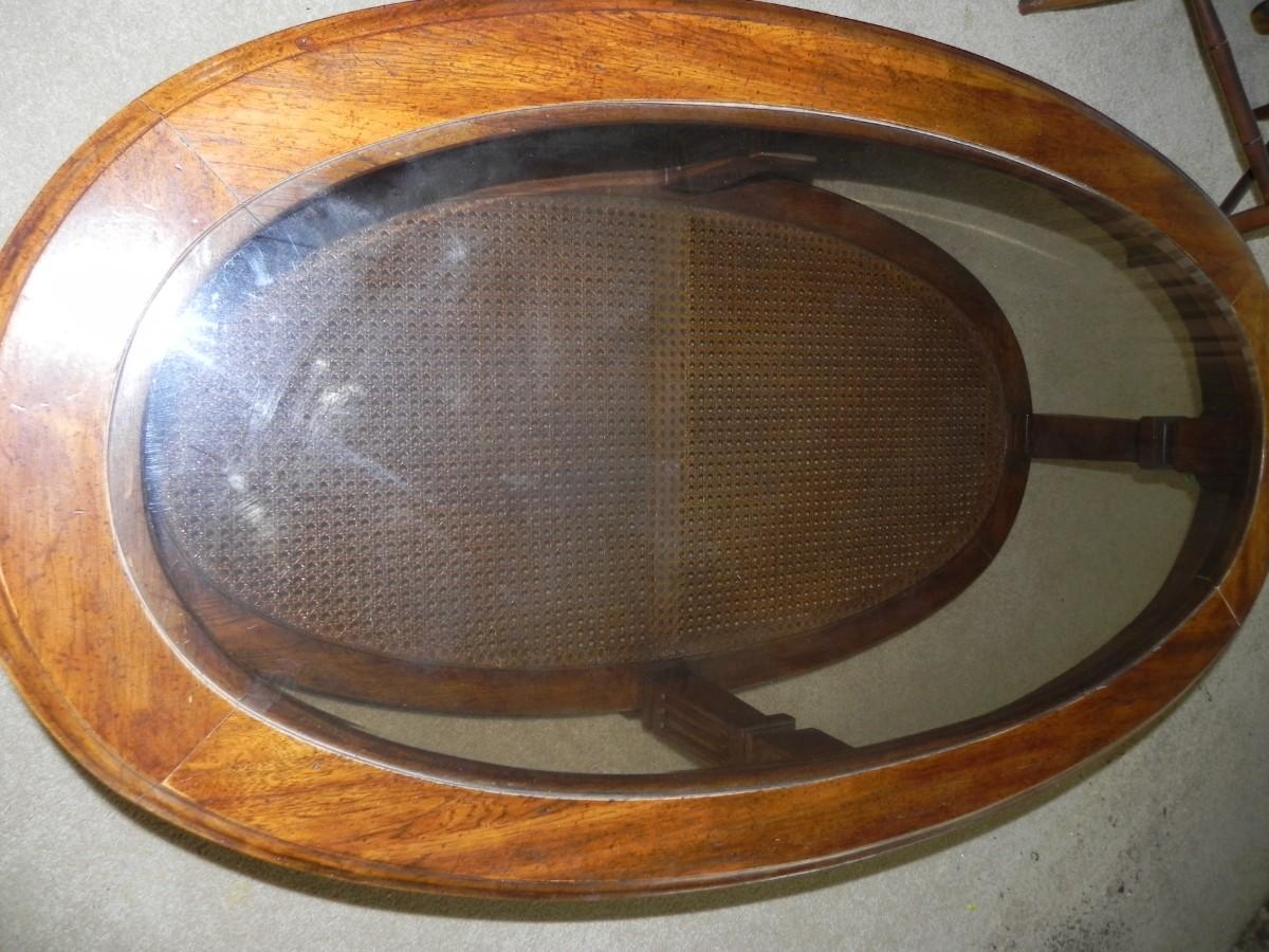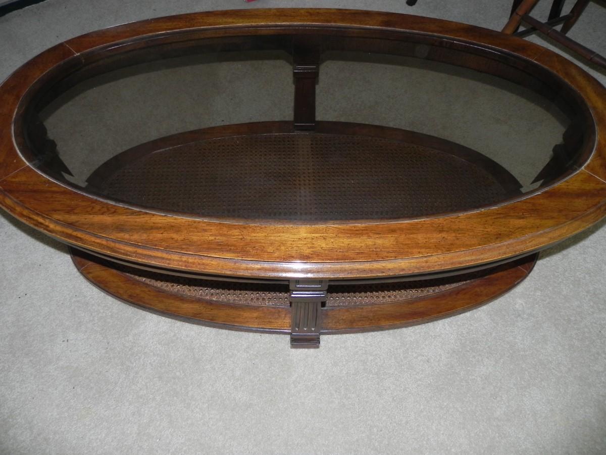 VERY NICE WOODED WITH SLIGHTLY TINTED GLASS, OVAL SHAPE COFFEE TABLE WITH CANED TIER