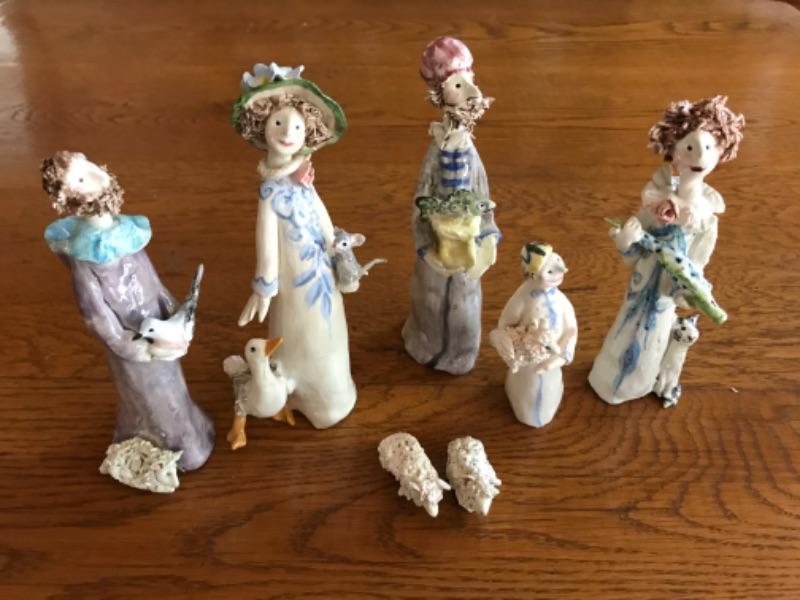 Nine ceramic figurines signed JSP. Two shepherds, two sheep, two holding fish and one with a mouse and a goose