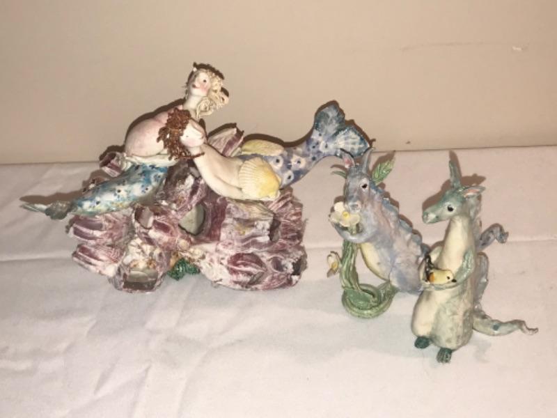 Ceramic mermaid decorative piece signed JSP and measures 6-1/2”x9” and two Dragon figurines signed JSP