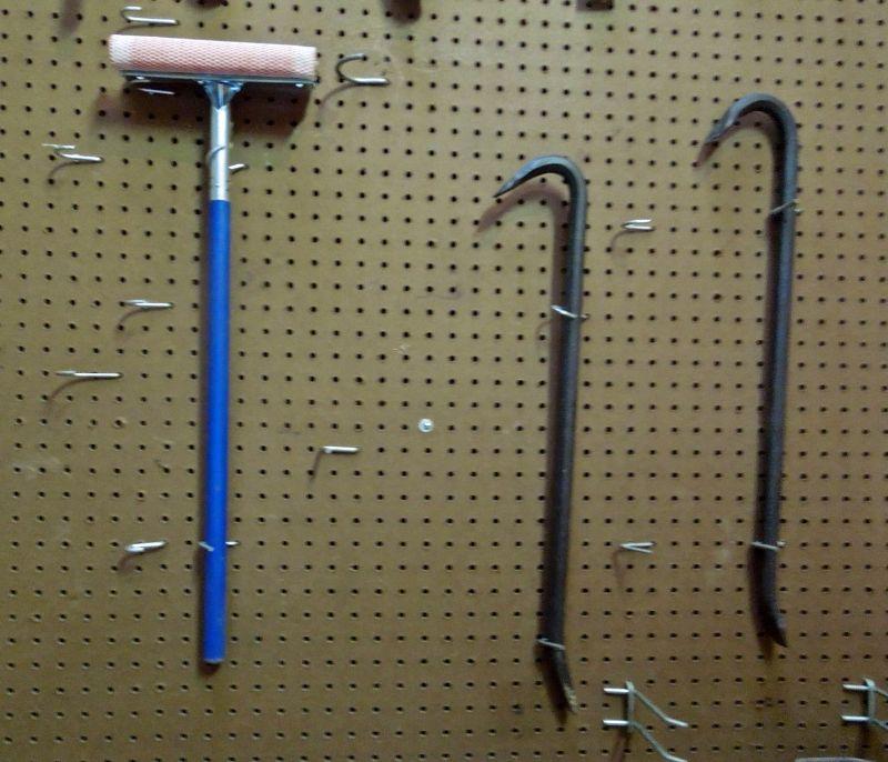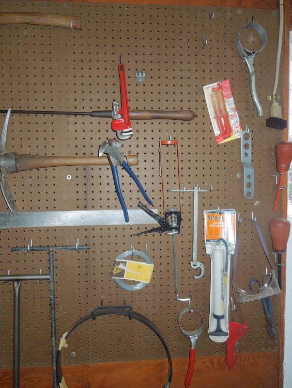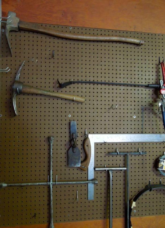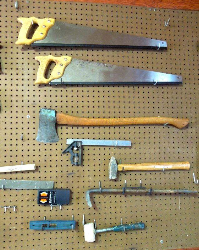 This group contains many vintage and newer metal and wood handled tools in very good condition including a mattox, several hand saws, axe, crow bars and hack saws. Includes everything in photos except peg board.