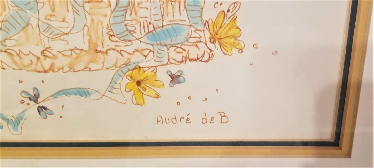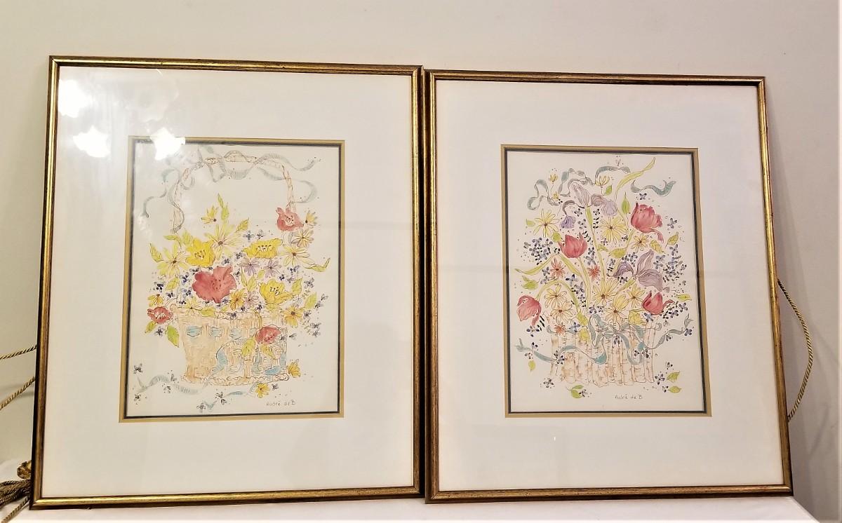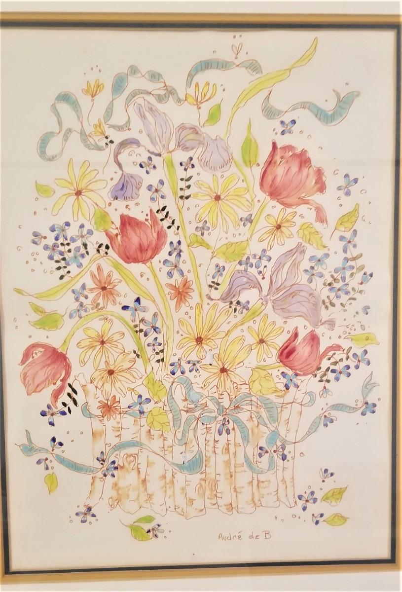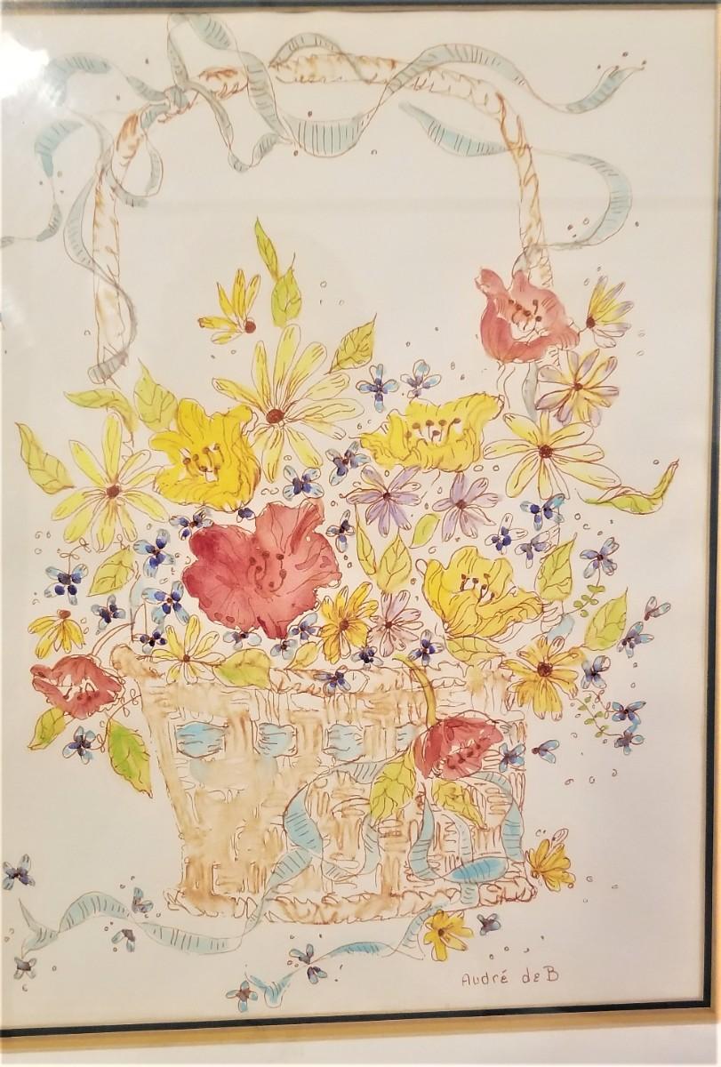 The same artist that did the lovely painting on silk in a previous Lot (Lot #35) also did these pen/watercolor florals. Audre Reinike deBuys, died in 2010 - known for her fabulous murals in several stately New Orleans homes. She was also known for whimsical florals, such as these. Neal Auction handled her estate after her death. These paintings are triple-matted and each measures 24.5" x 21".