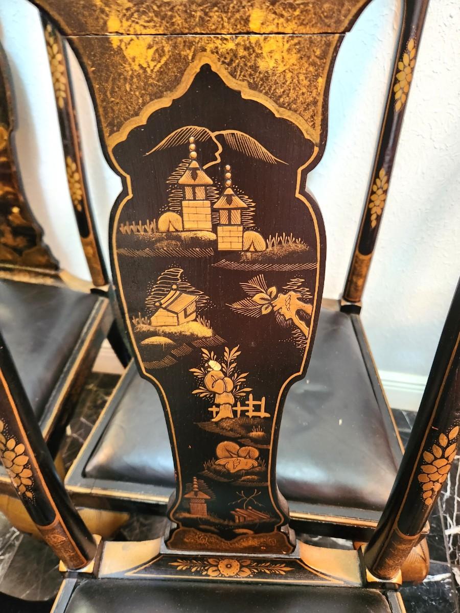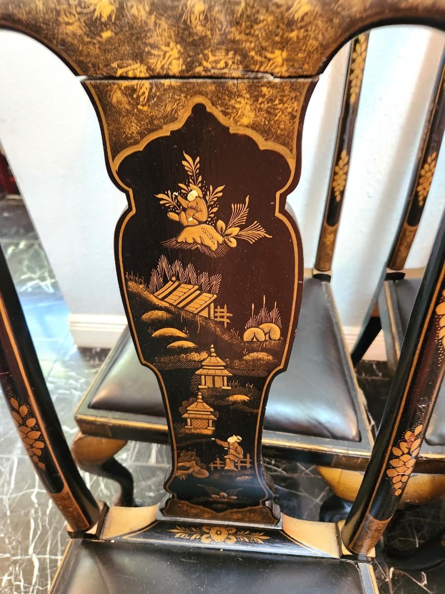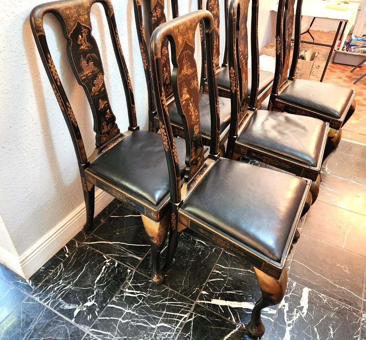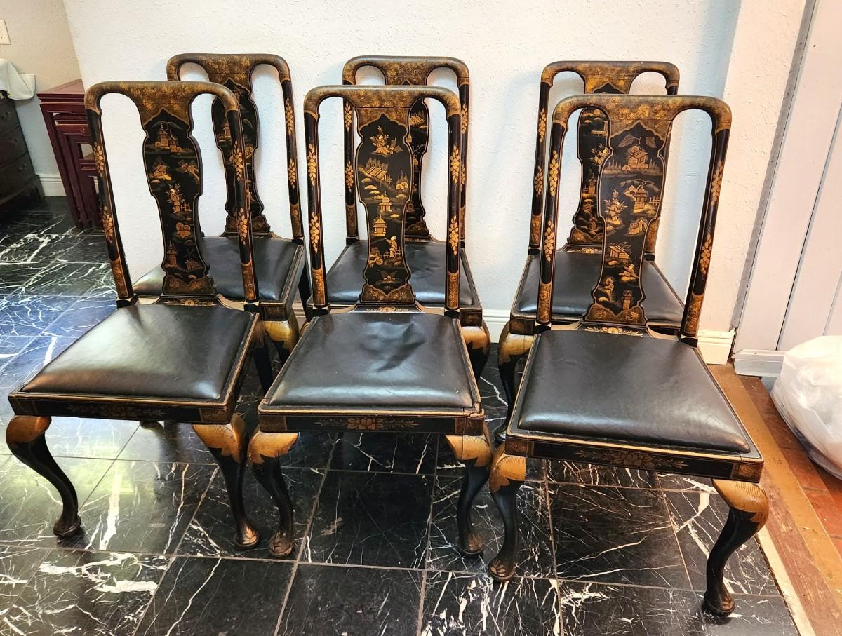 These were being used at the glass table. Set of 6 Asian style dining chairs, leather seats - each chair has a different Asian scene on the back. 40" tall, 19.5" wide. 1 chair has some issues - small repair needed to front leg joist where is meets the seat (see photos). Used condition.