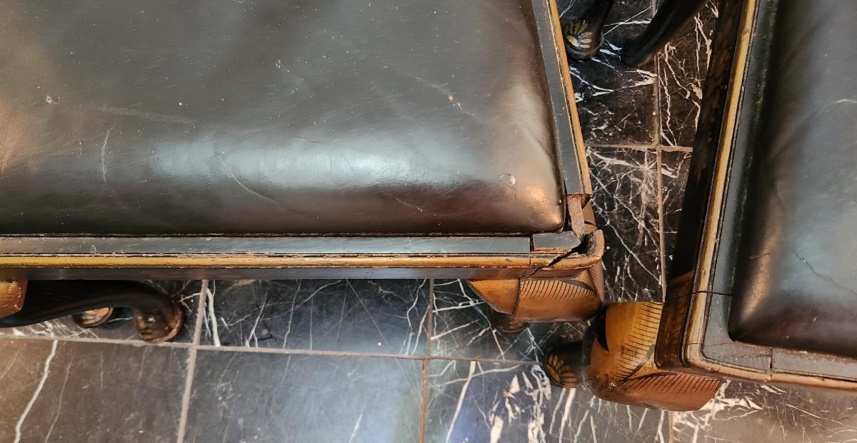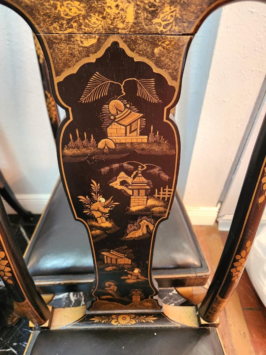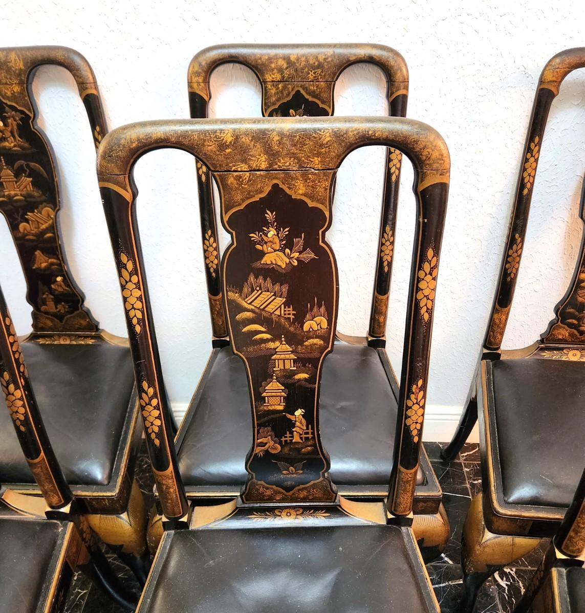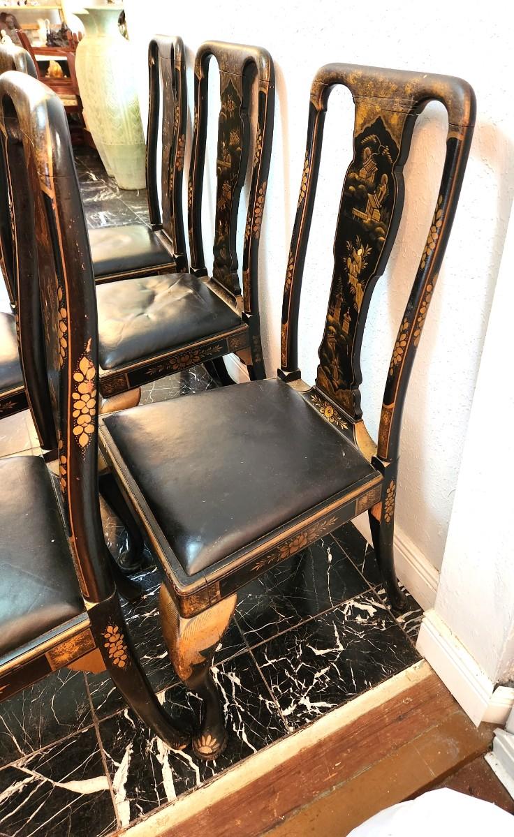 These were being used at the glass table. Set of 6 Asian style dining chairs, leather seats - each chair has a different Asian scene on the back. 40" tall, 19.5" wide. 1 chair has some issues - small repair needed to front leg joist where is meets the seat (see photos). Used condition.